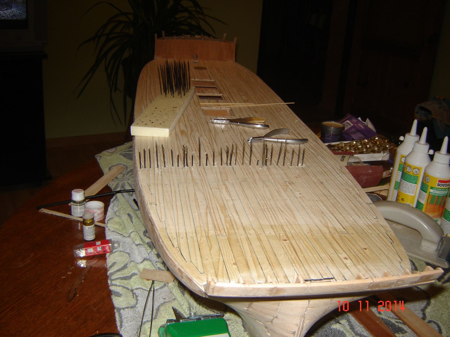 Po naklejeniu listewek na cały pokład przyszedł czas na kołkowanie.