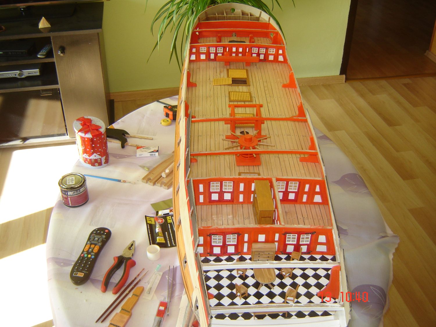 Powstaje fajny model słusznych rozmiarów. Pokładem, się nie przejmuj, kolejne zrobisz z odpowiedniego materiału i będzie ok. Proponuję ścianki działowe zrobić w jednolitym kolorze, bez tych białych wstawek - będzie lepiej wyglądało i bardziej odpowiadało rzeczywistości.