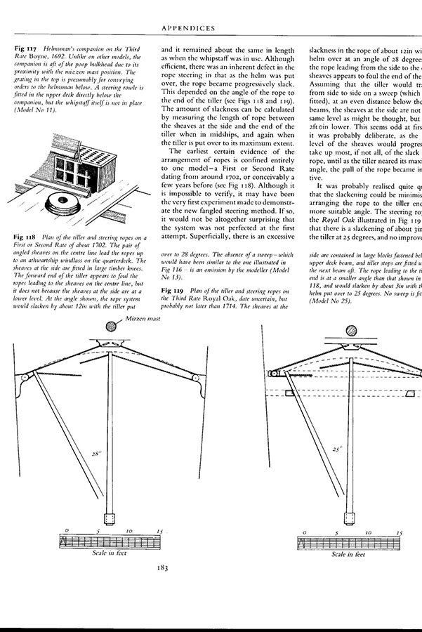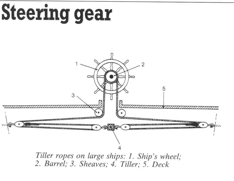 Pod pokładem jest rumpel, połączony linami z kołem sterowym na pokładzie. Masz 6 ilustracji, myślę, że załapiesz na ich podstawie, jak toto jest rozwiązane