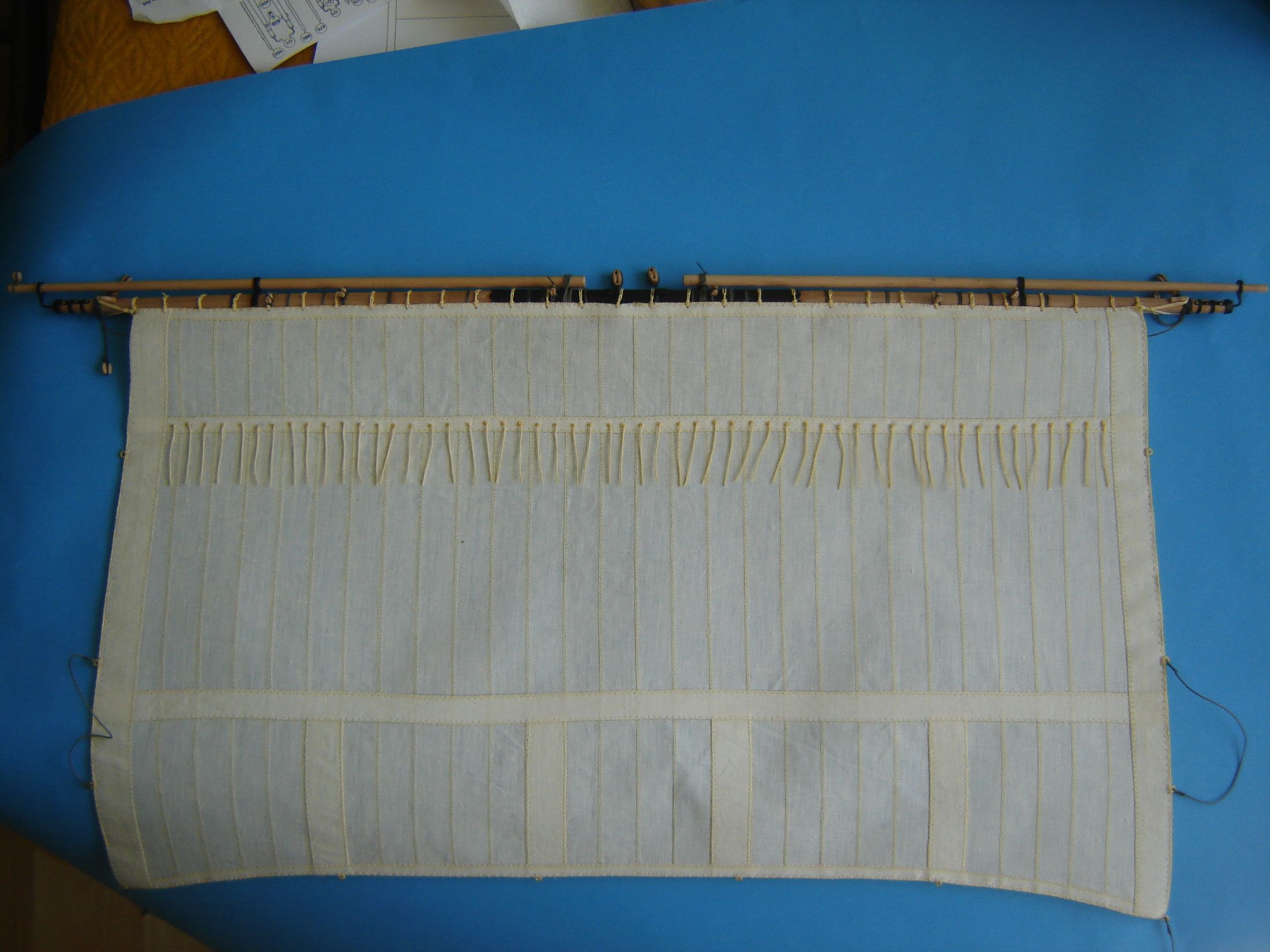 Obciąłem nadmiar płótna i przyszyłem liklinkę. Przyszywałem liklinkę ręcznie ponad 5 godzin. Wykręciłem i zamontowałem potrzebne linki i bloczki oraz przywiązałem 18 szt haczyków (średnio na godzinę wiązałem 4 haczyki). Teraz dopiero zdaję sobie sprawę z tego ile trudu wymagało kiedyś uszycie prawdziwego oryginalnego żagla, w dodatku kiedy wszystko trzeba było szyć ręcznie.