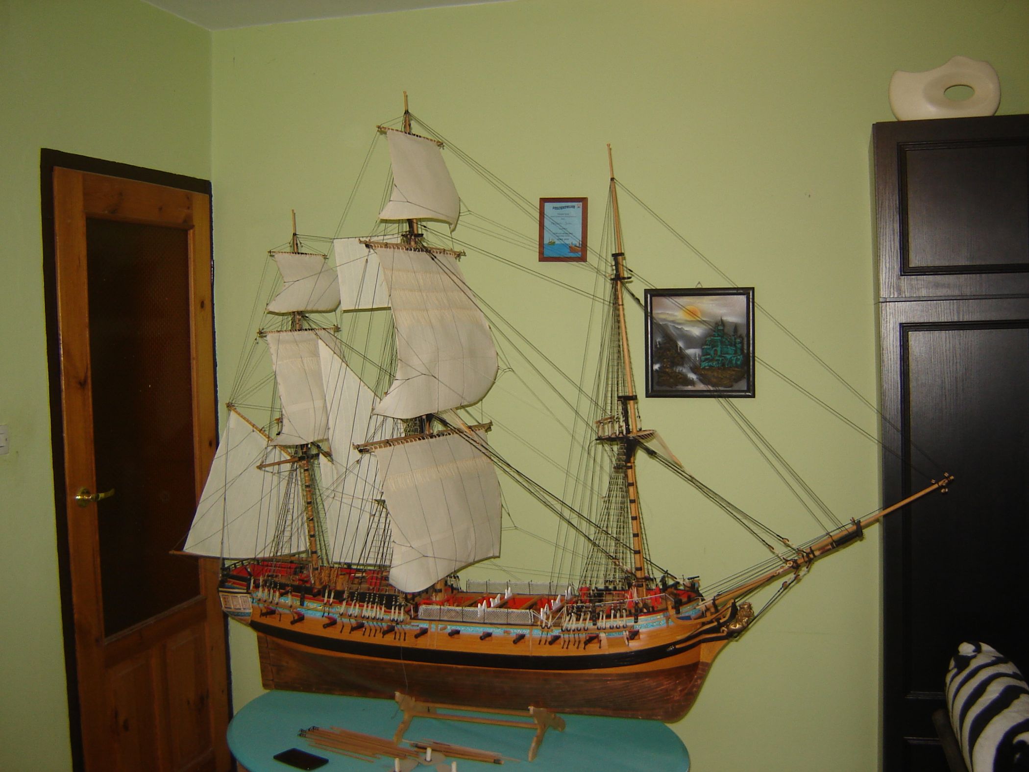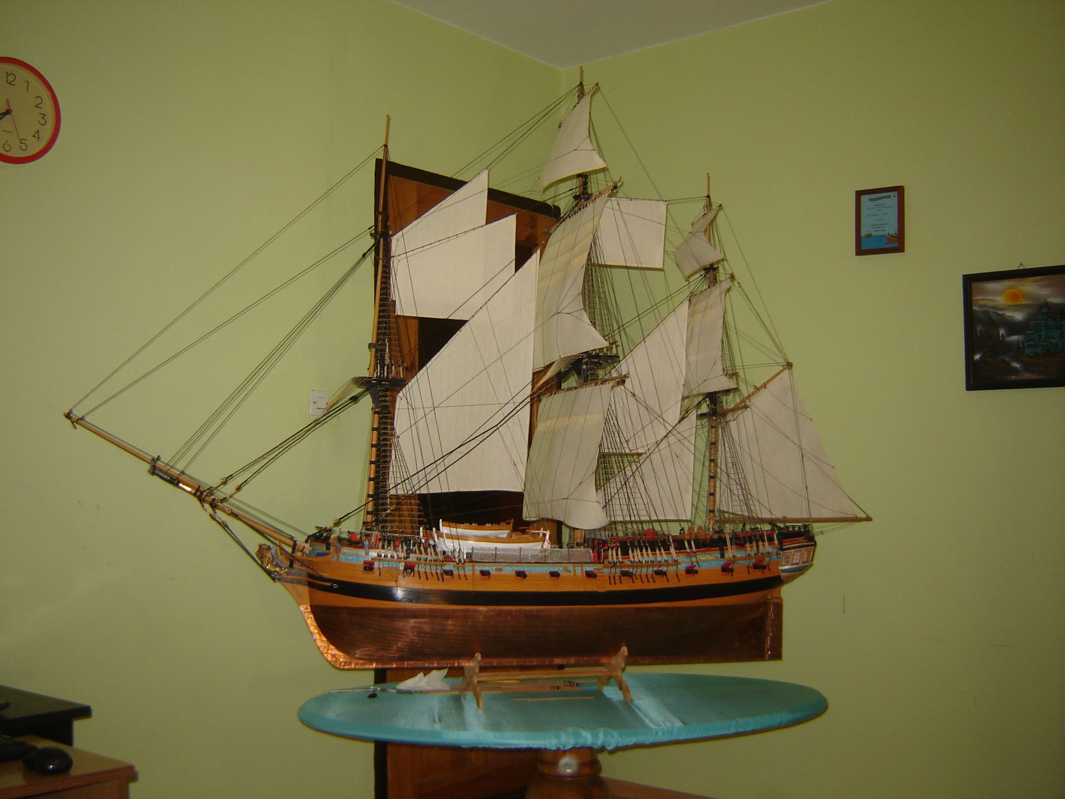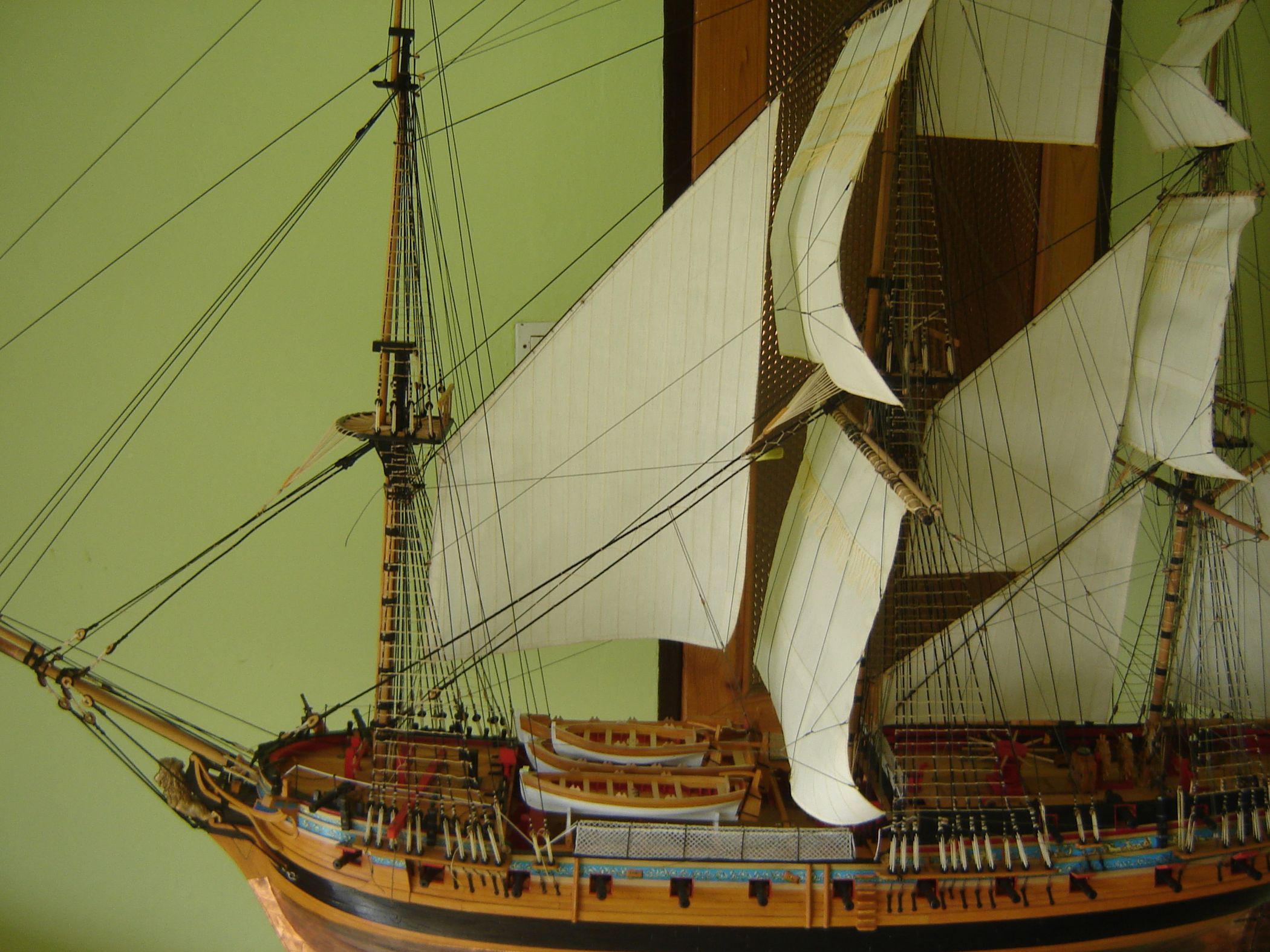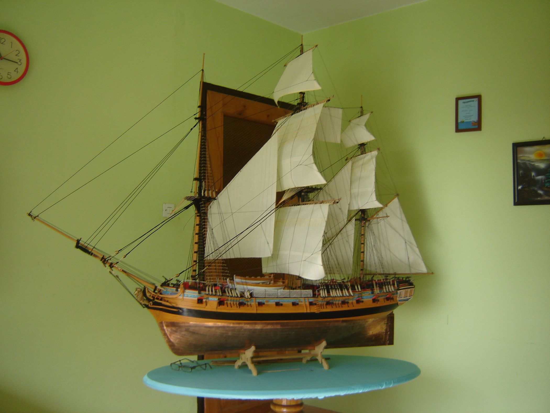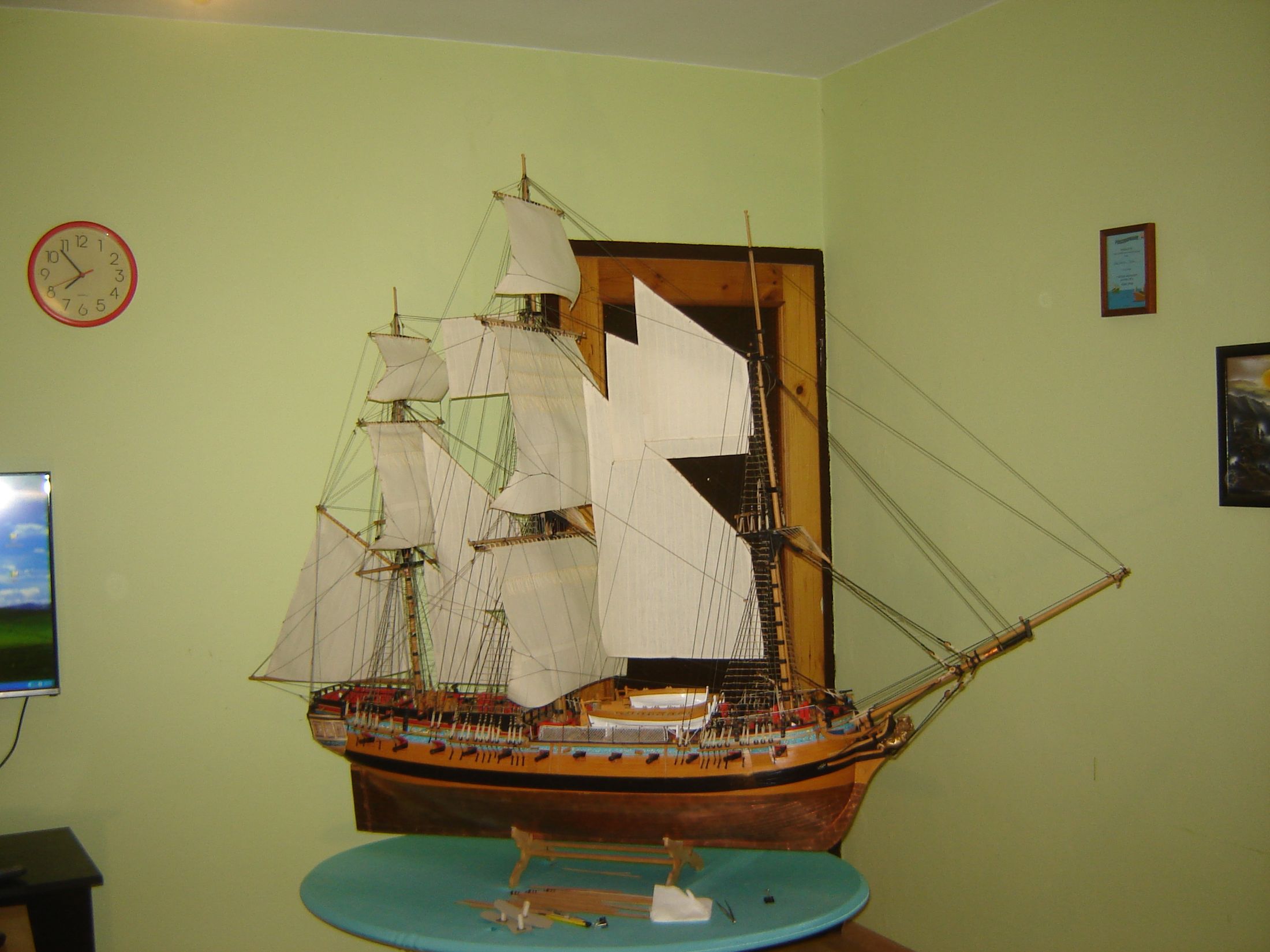 Zamontowałem grotżagiel i sten grotżagiel . Zamontowałem też kołkownice na belkach łączących ganki (zgodnie z wycinanką), wcześniej to przegapiłem. Powstała nowa plątanina linek. Okazuje się jednak, że można się w tym połapać. Linki na wszystkich masztach mają podobną zasadę działania z niewielką różnicą dotyczącą miejsca odłożenia. Przeraża mnie tylko długość linek. Na przykład na gejtawy sten grotżagla poszło prawie 4,5 mb. linki. Musiałem więc trochę tych linek nakręcić, a do końca ożaglowanie jeszcze droga daleka.