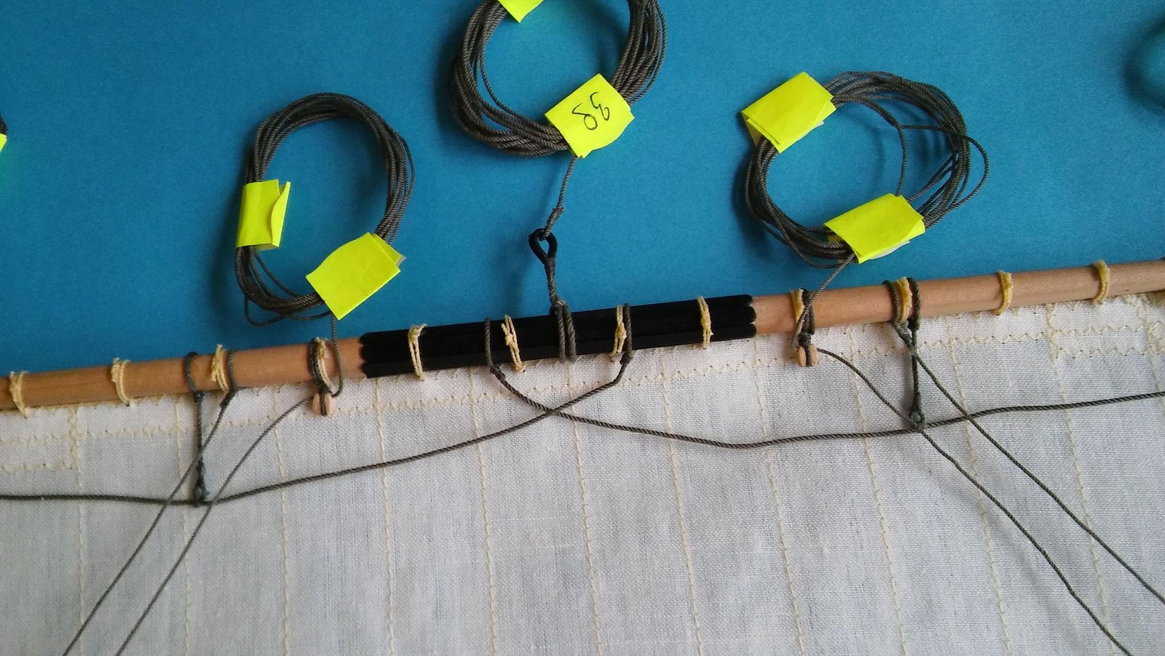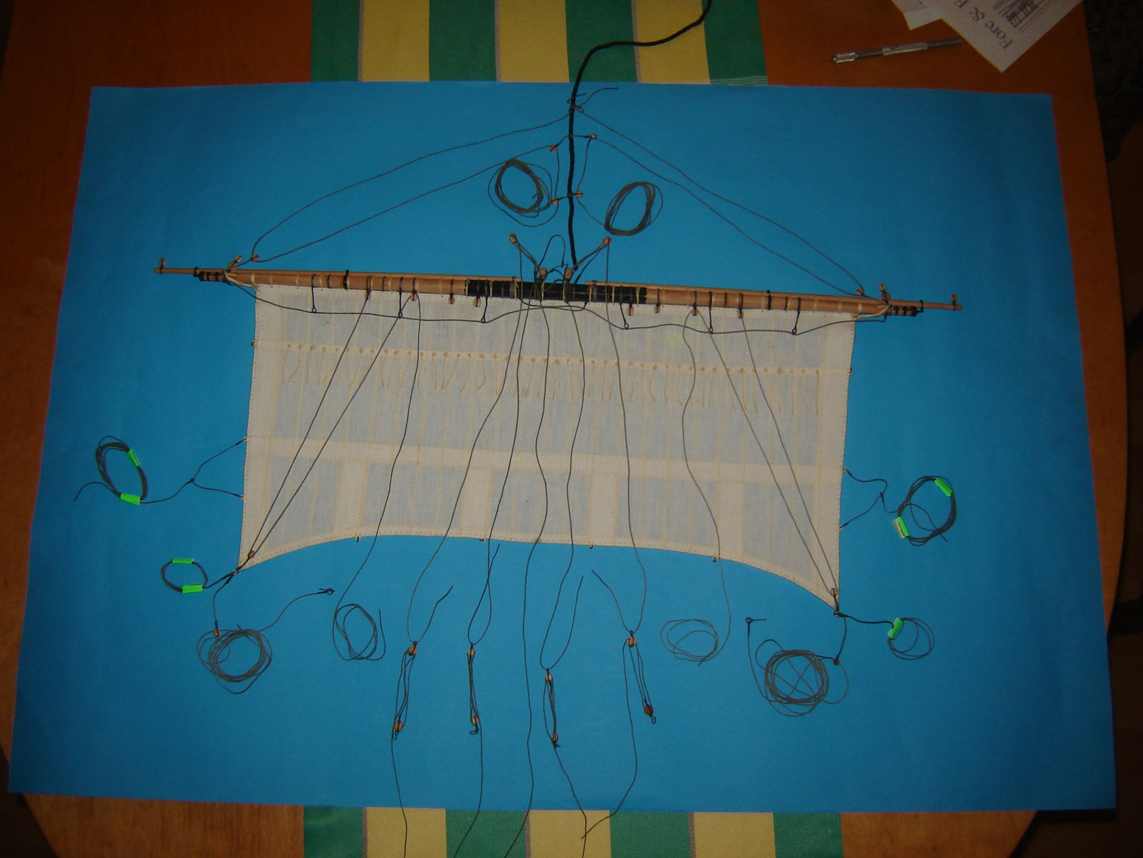Zamocowałem żagiel do rei i dołączyłem wszystkie potrzebne linki. Średnica linek to 0,45 mm.