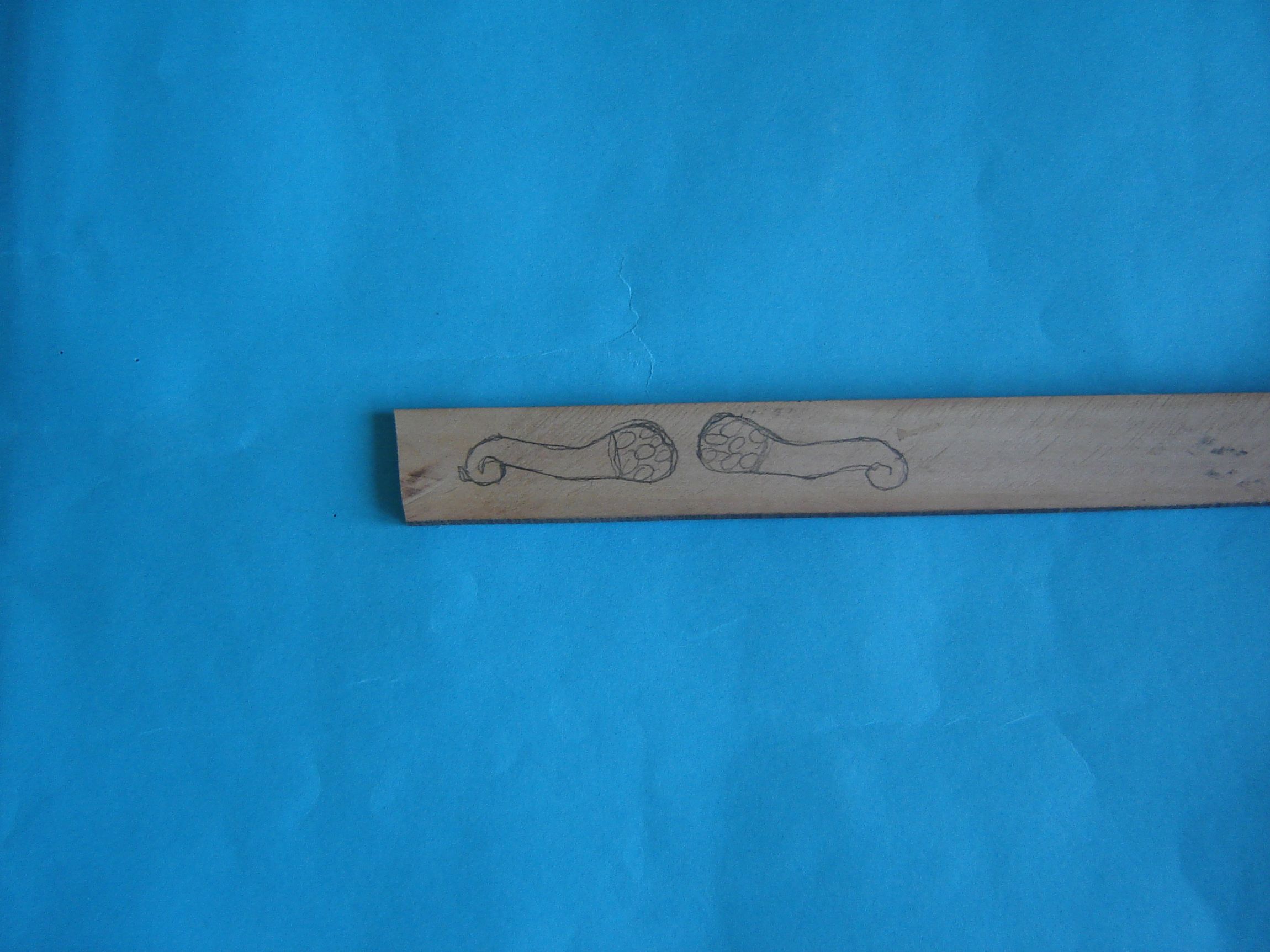 Doszedłem do wniosku że najpierw spróbuję wydłubać robale bo wydawały mi się najmniej skomplikowane. Narysowałem (jak umiałem) kształty przyszłych robali na deseczce z gruszy o grubości 3 mm.