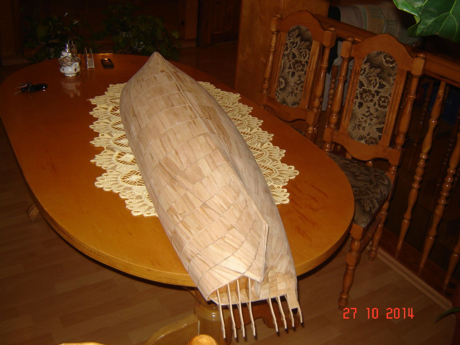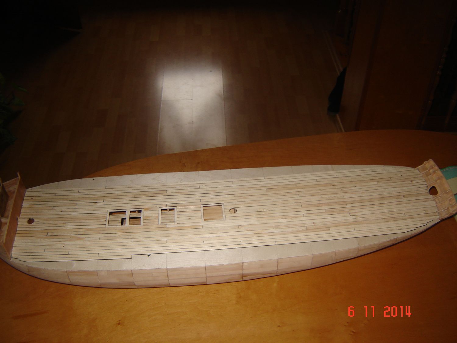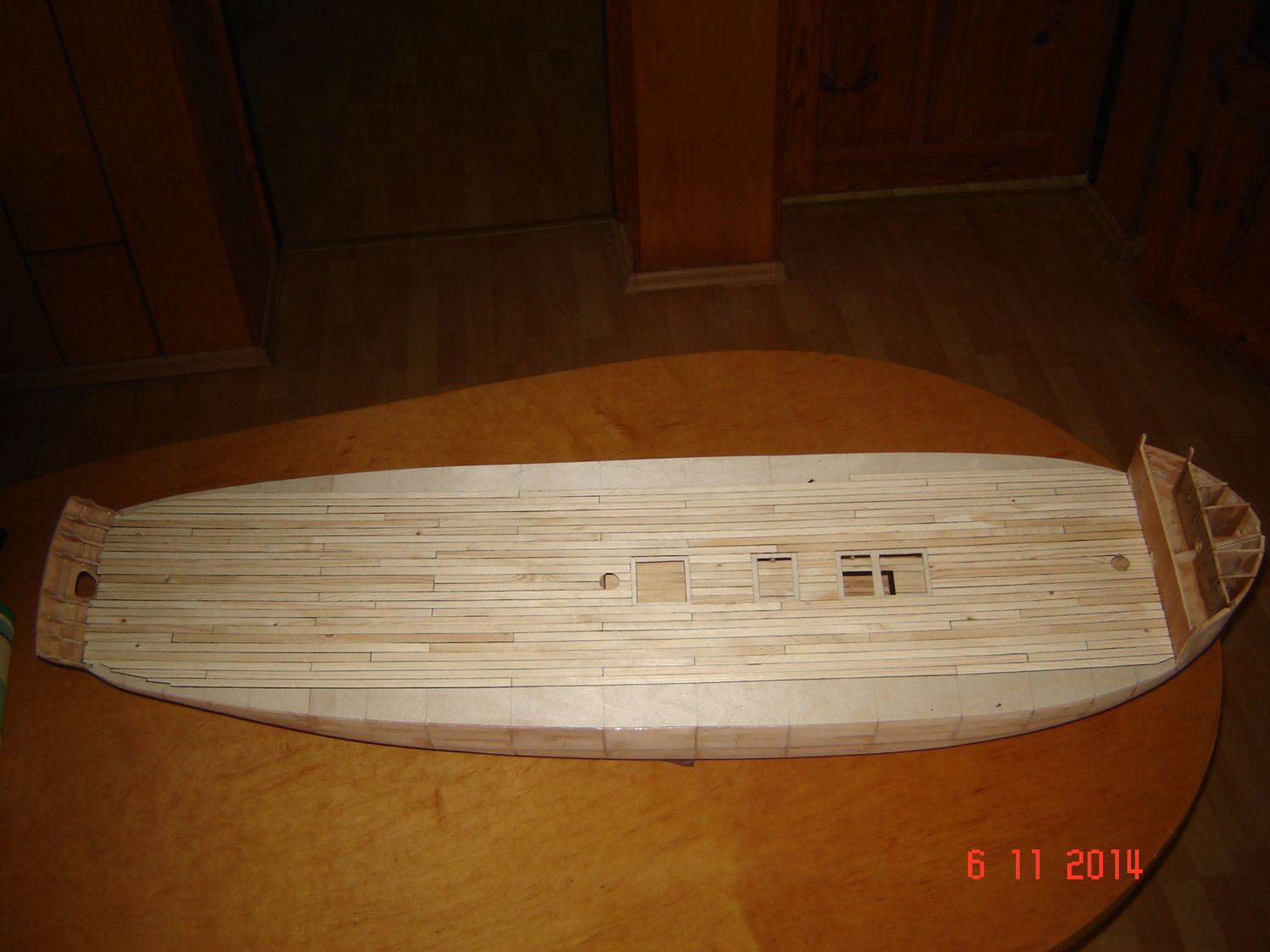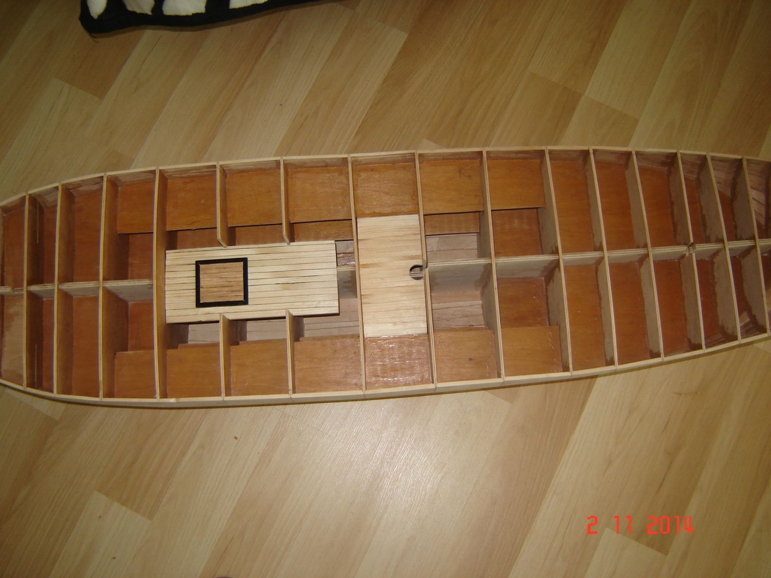 Po raz ostatni dzisiaj chcę dołączyć jeszcze parę zdjęć do mojej relacji z budowy. A więc kiedy już posklejałem szkielet to, postanowiłem go czymś wypełnić. Postanowiłem, ze skoro chcę zbudować model drewniany to nie będę go wypełniał pianką. Znalazłem w domu parę suchych deseczek, nie wiem nawet z jakiego drewna, ale chyba była to olcha, bo drewno było dosyć miękkie i dobrze się obrabiało. Wkleiłem w szkielet dokładnie 786 listewek, zużywając na obrobienie, dopasowanie i przyklejenia każdej średnio około 10 minut. Pracowałem przy modelu nawet po kilkanaście godzin dziennie. Ale wbrew pozorom nie była to nudna praca, bo każda listewka to było inne wyzwanie. No i wtedy zaczął się wyłaniać jakiś kształt kadłuba. Załączam zdjęcia pozdrawiam i kończę na dzisiaj. Zdzisław
