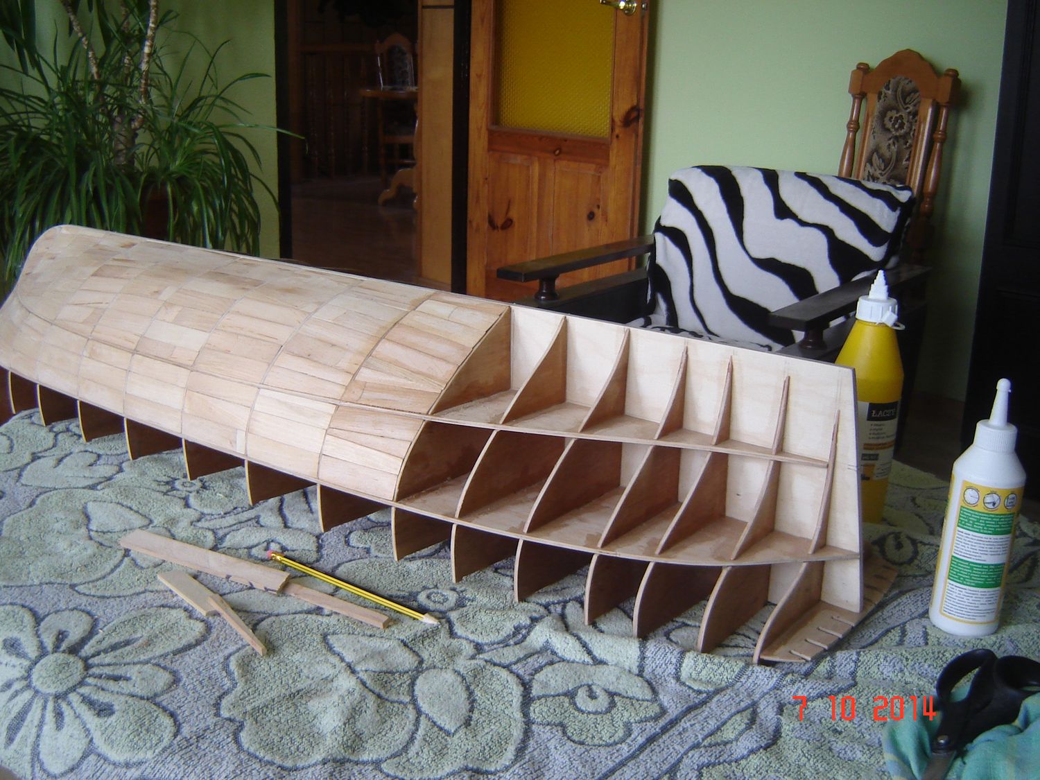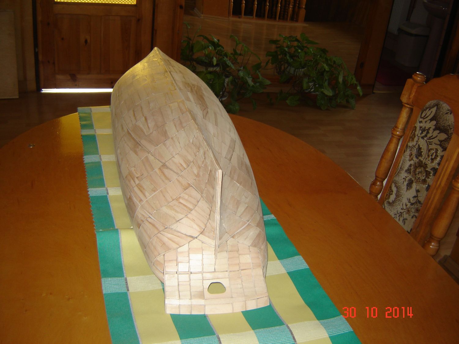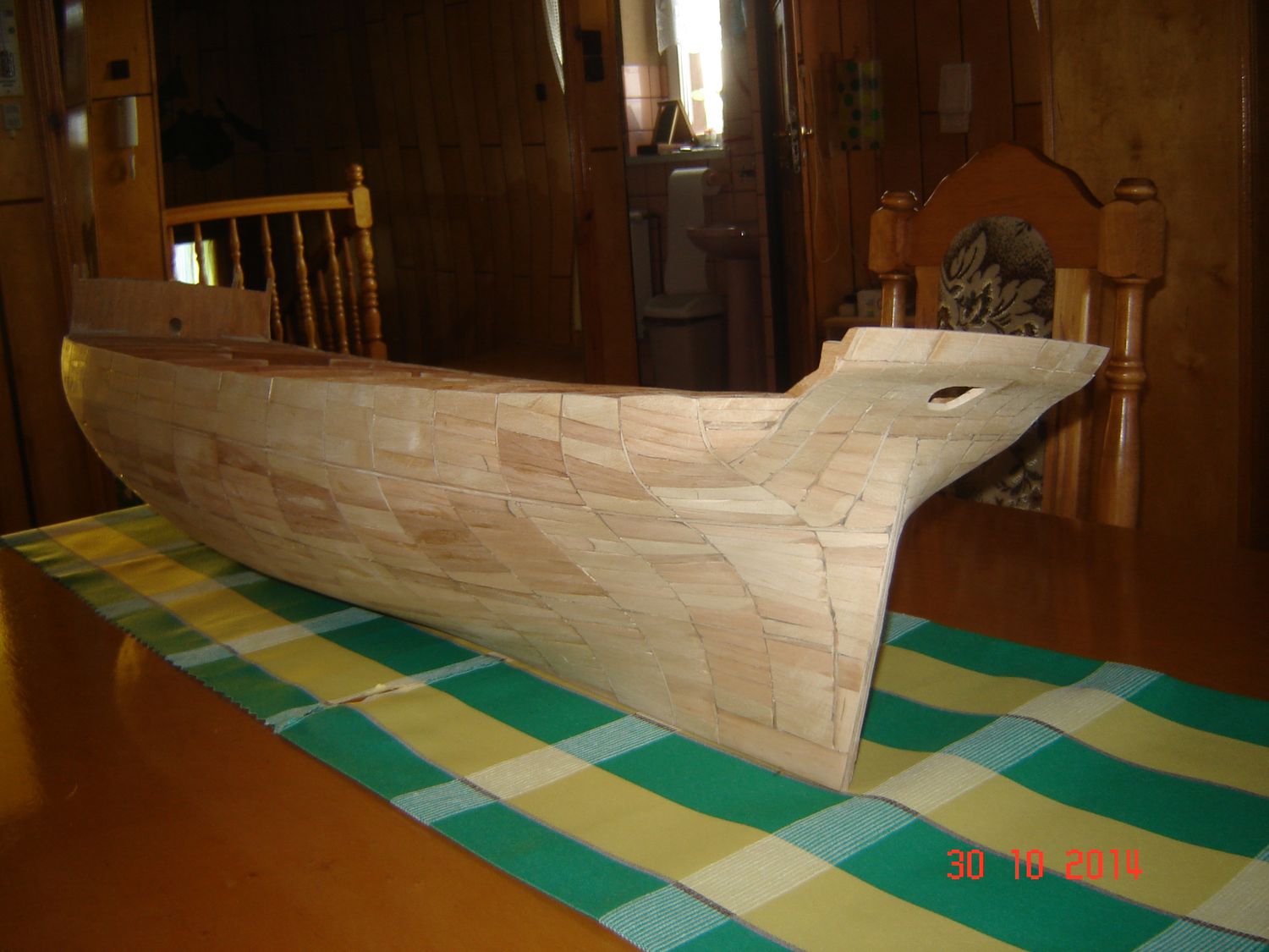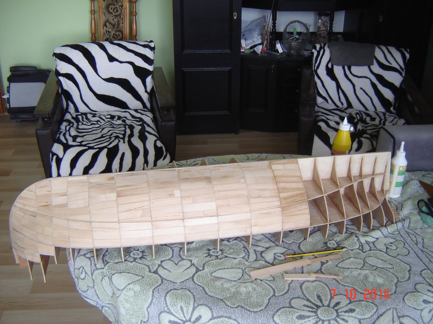 Po raz ostatni dzisiaj chcę dołączyć jeszcze parę zdjęć do mojej relacji z budowy. A więc kiedy już posklejałem szkielet to, postanowiłem go czymś wypełnić. Postanowiłem, ze skoro chcę zbudować model drewniany to nie będę go wypełniał pianką. Znalazłem w domu parę suchych deseczek, nie wiem nawet z jakiego drewna, ale chyba była to olcha, bo drewno było dosyć miękkie i dobrze się obrabiało. Wkleiłem w szkielet dokładnie 786 listewek, zużywając na obrobienie, dopasowanie i przyklejenia każdej średnio około 10 minut. Pracowałem przy modelu nawet po kilkanaście godzin dziennie. Ale wbrew pozorom nie była to nudna praca, bo każda listewka to było inne wyzwanie. No i wtedy zaczął się wyłaniać jakiś kształt kadłuba. Załączam zdjęcia pozdrawiam i kończę na dzisiaj. Zdzisław
