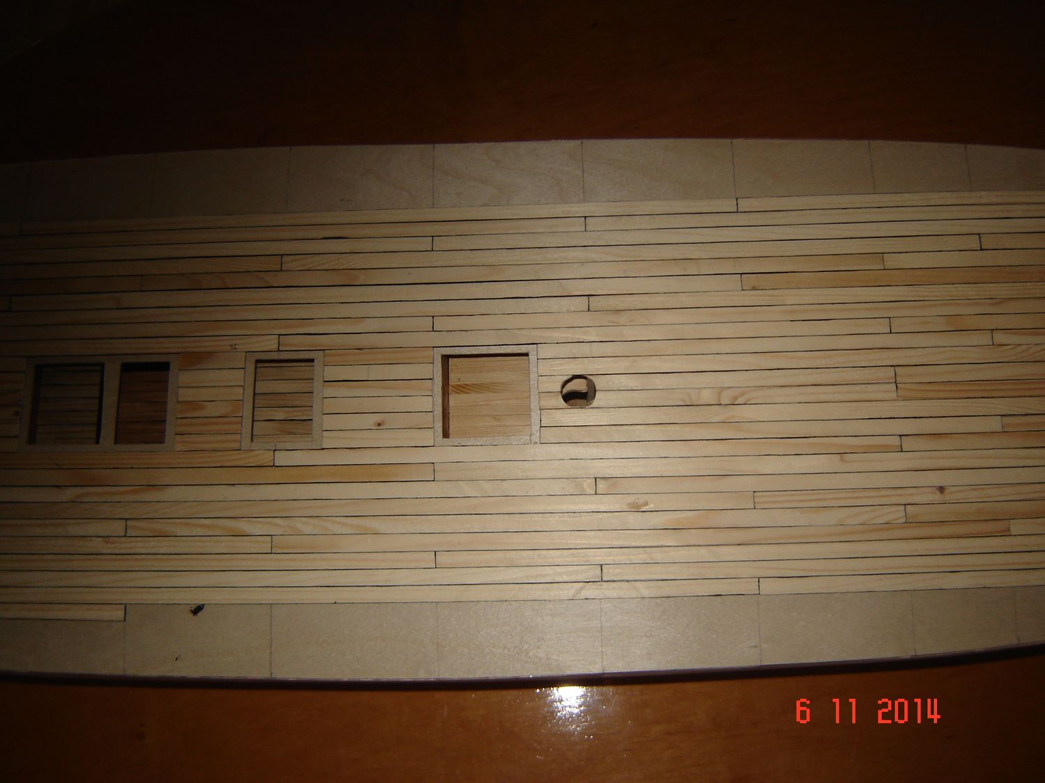 Przystąpiłem do wykonania pokładu. W wycinance shypyardu pokład składa się z dwóch części A która stanowi podkład i części B czyli pokładu właściwego.(nie miejcie mi za złe jeżeli nazywam coś nie tak jak powinno się to nazywać ponieważ cały czas się uczę). Ja jako podkładu użyłem 1 mm sklejki brzozowej lotniczej. Na nią naklejałem (i to mój następny błąd) listewki świerkowe grubości 1 mm i szerokości 8 mm. Może do mojej skali powinienem był użyć listewek o szerokości 7 mm. Z jednego boku listewki poczerniłem przed sklejeniem czarną farbą akrylową. I wyszło tak