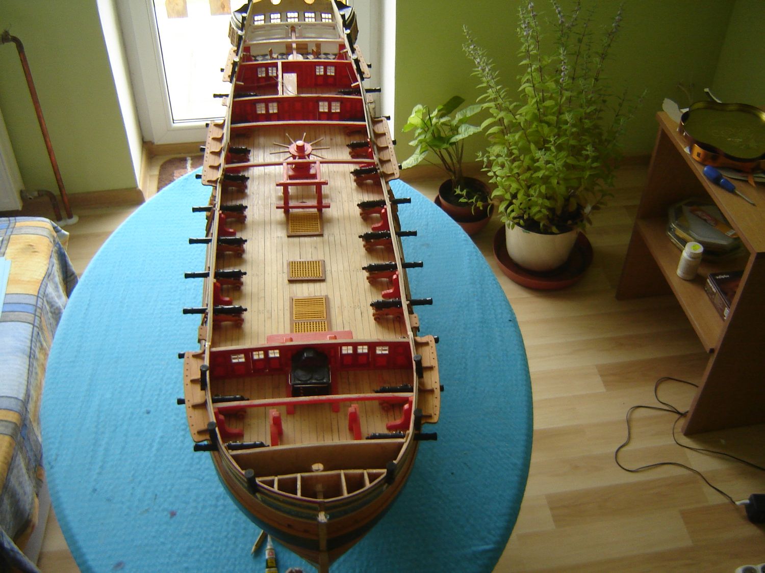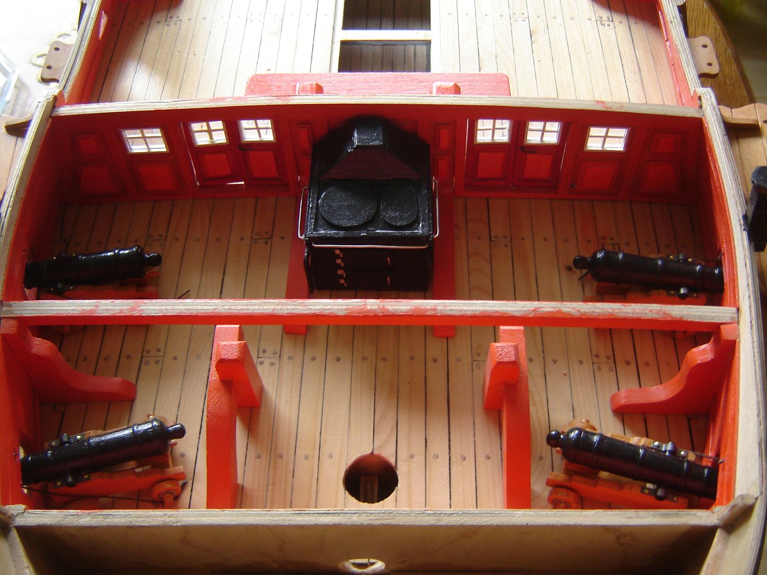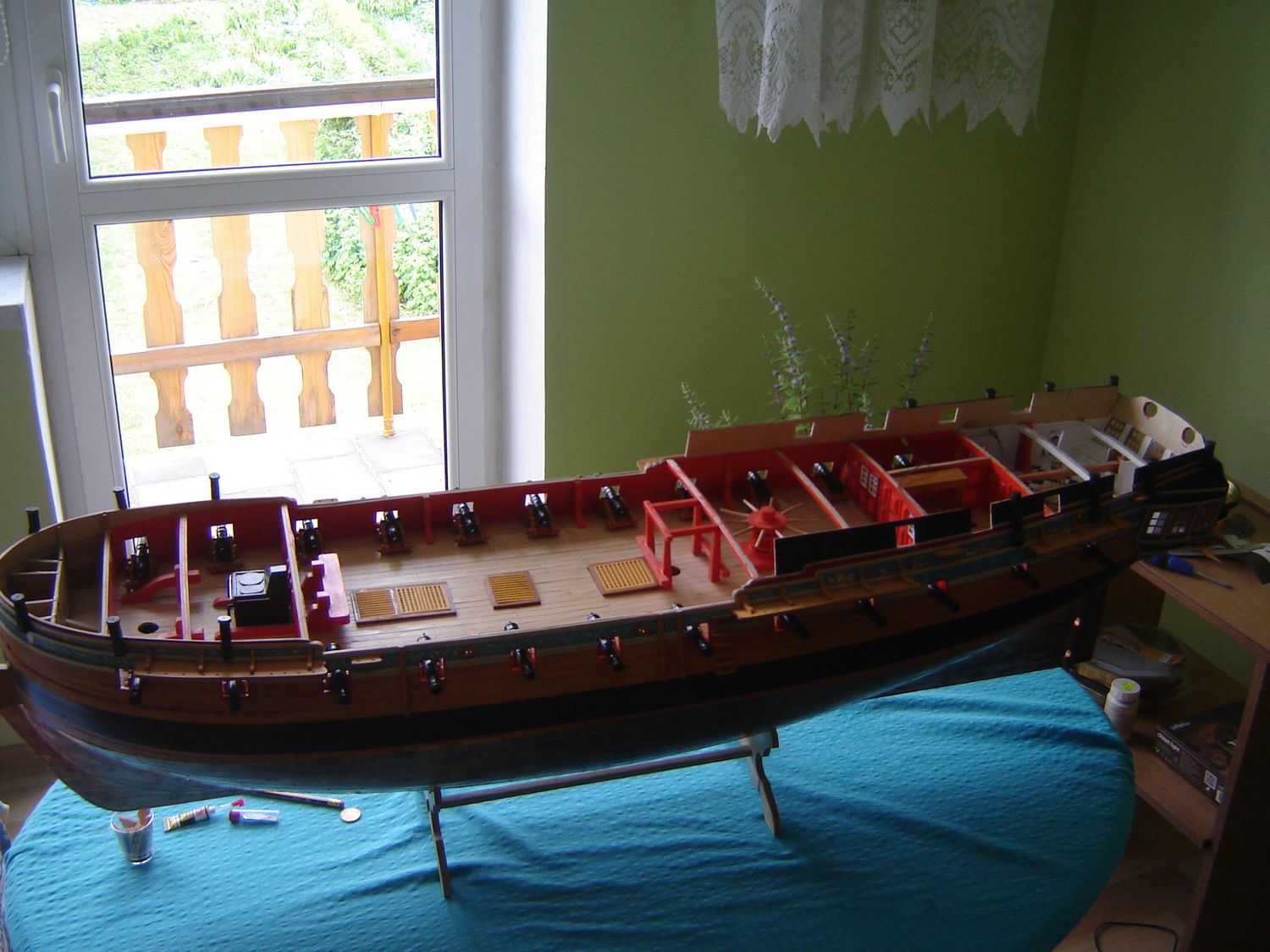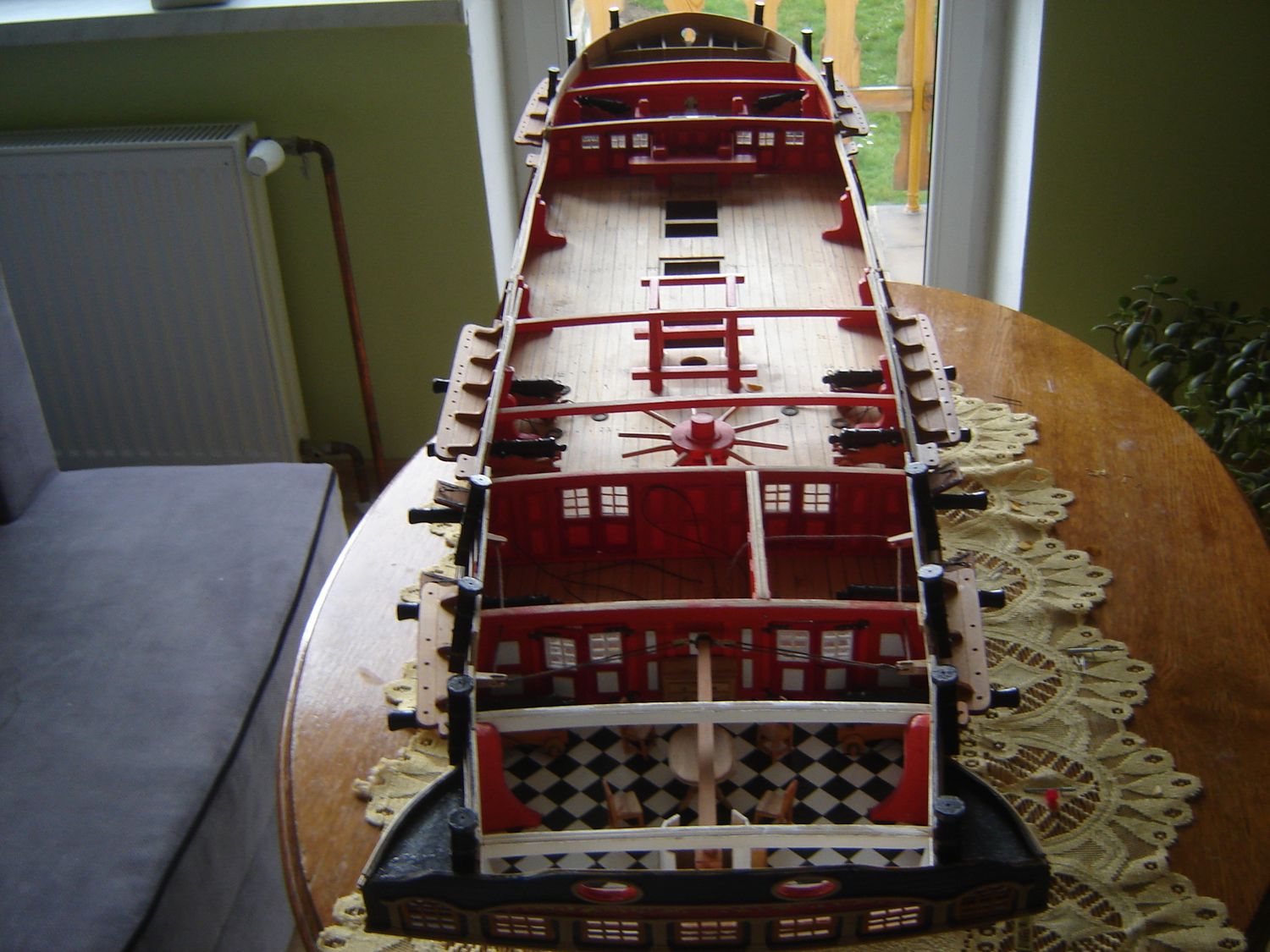 Znowu trochę pogrzebałem przy modelu. Zamontowałem na stałe mebelki w kabinie kapitańskiej, kabestan pionowy, kuchnię i armaty w części rufowej i dziobowej na dolnych pokładach.Skręciłem dwie linki jedną o średnicy 0,5 mm i drugą o średnicy 0,9 mm. Dwie armaty, które będą częściowo widoczne spod górnego pokładu rufowego wyposażyłem w linki i bloczki a końcówki linek zwinąłem w "obowiązkowe" słoneczka.