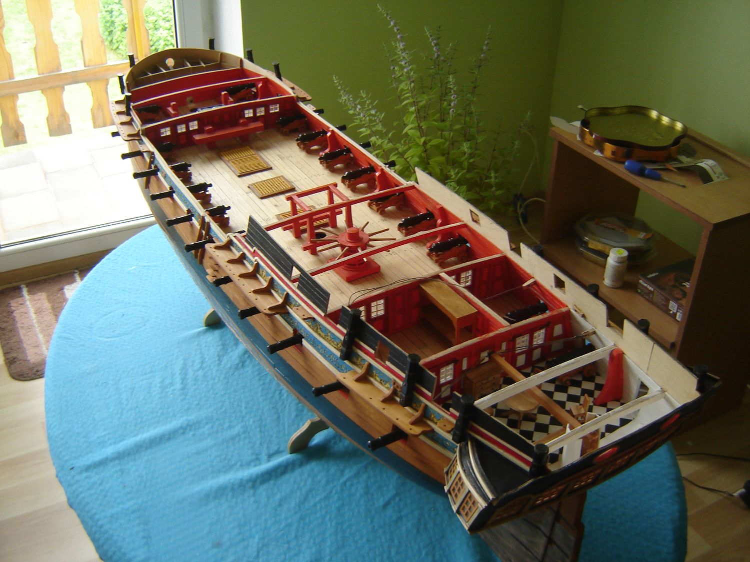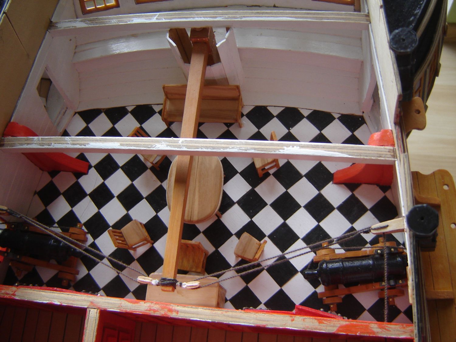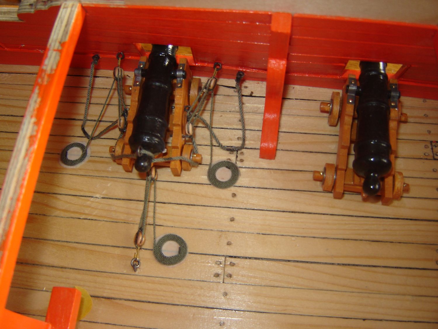 Znowu trochę pogrzebałem przy modelu. Zamontowałem na stałe mebelki w kabinie kapitańskiej, kabestan pionowy, kuchnię i armaty w części rufowej i dziobowej na dolnych pokładach.Skręciłem dwie linki jedną o średnicy 0,5 mm i drugą o średnicy 0,9 mm. Dwie armaty, które będą częściowo widoczne spod górnego pokładu rufowego wyposażyłem w linki i bloczki a końcówki linek zwinąłem w "obowiązkowe" słoneczka.