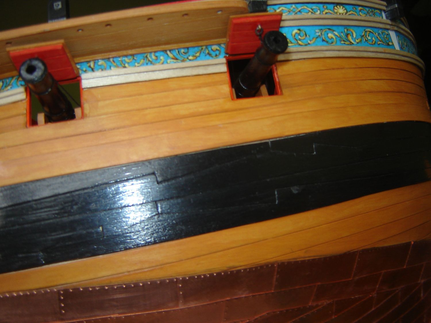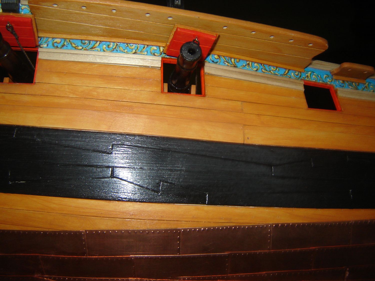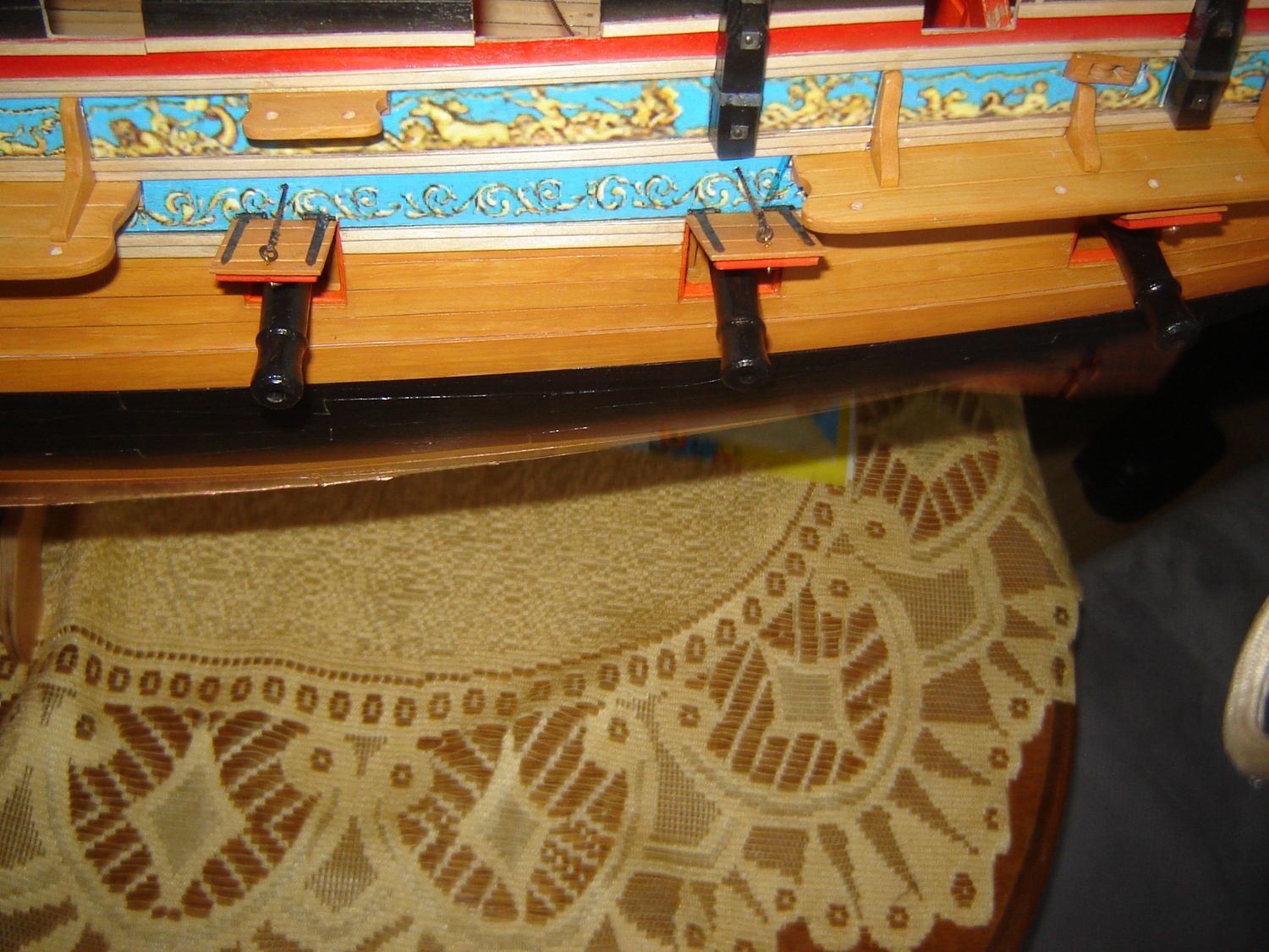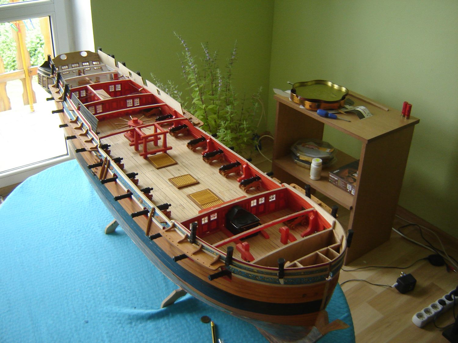 Znowu trochę pogrzebałem przy modelu. Zamontowałem na stałe mebelki w kabinie kapitańskiej, kabestan pionowy, kuchnię i armaty w części rufowej i dziobowej na dolnych pokładach.Skręciłem dwie linki jedną o średnicy 0,5 mm i drugą o średnicy 0,9 mm. Dwie armaty, które będą częściowo widoczne spod górnego pokładu rufowego wyposażyłem w linki i bloczki a końcówki linek zwinąłem w "obowiązkowe" słoneczka.