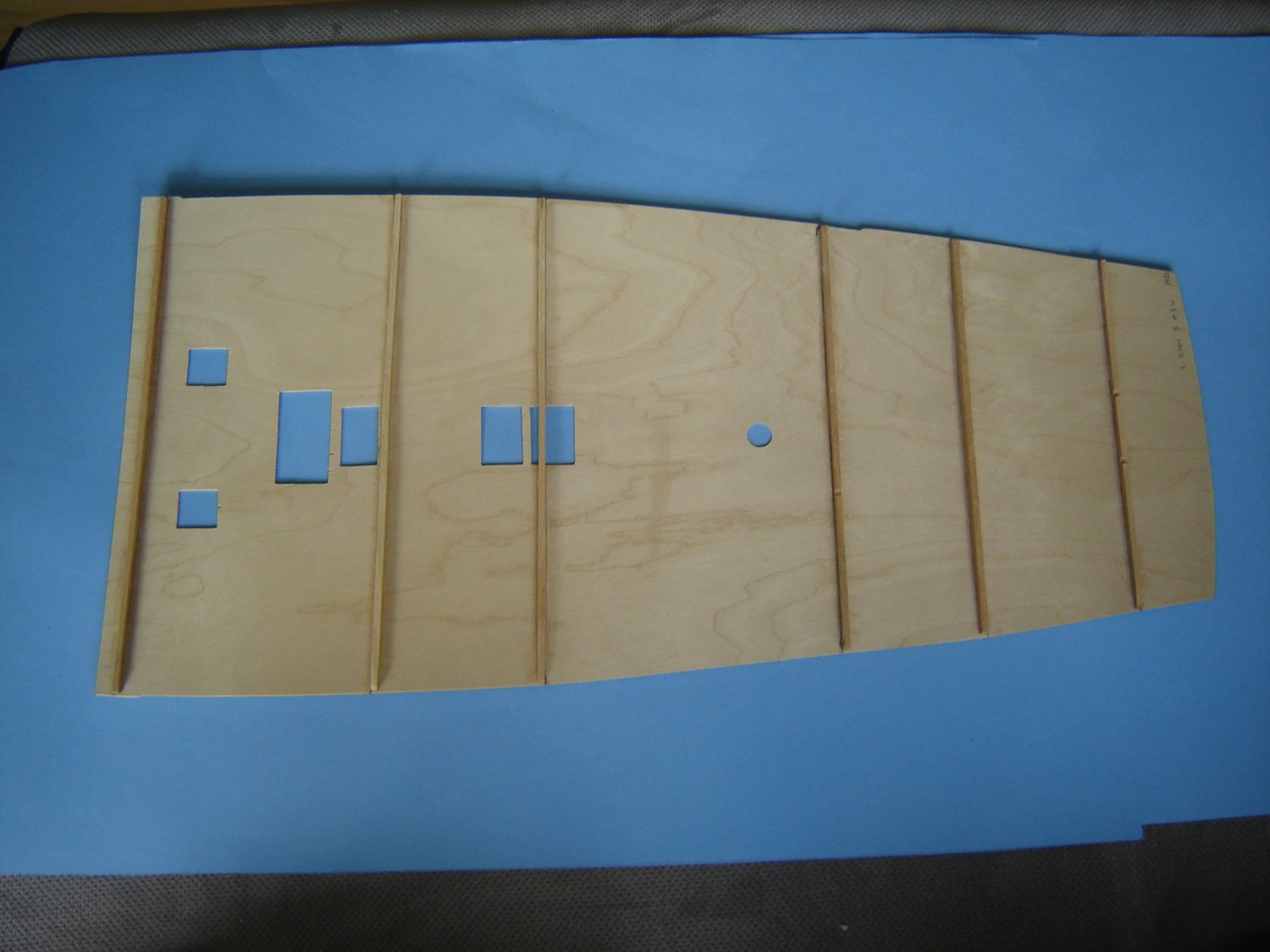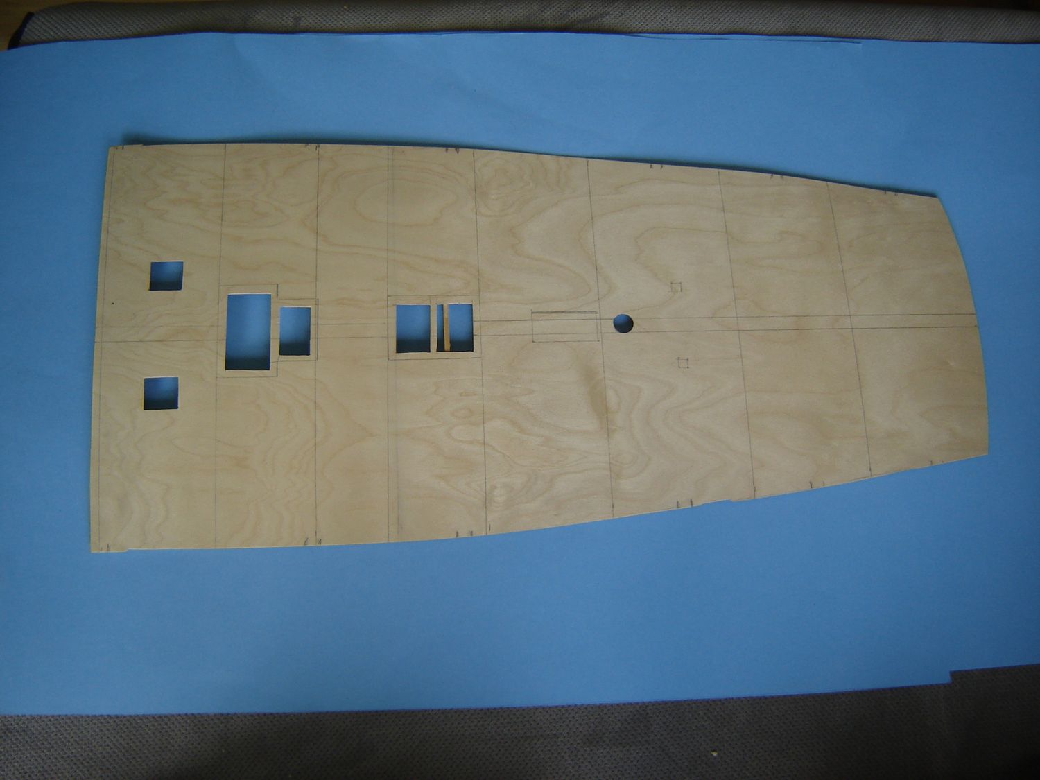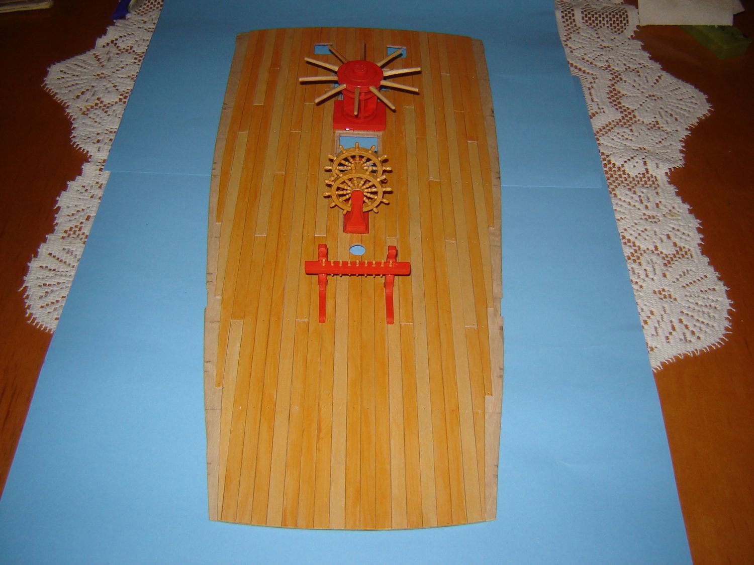 Znowu coś tam zrobiłem. Wykonałem fałszywy pokład górny rufowy z 1 mm sklejki lotniczej.Dopasowałem, doszlifowałem i wyciąłem odpowiednie otwory. Teraz spróbuję okleić ten pokład listewkami. Chcę w całości wykonać pokład poza modelem, dlatego od spodu nakleiłem odpowiednie profile, żeby zachować spady w stronę burt. Jak to wyjdzie zobaczymy.