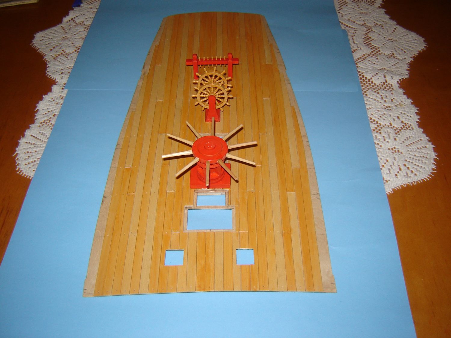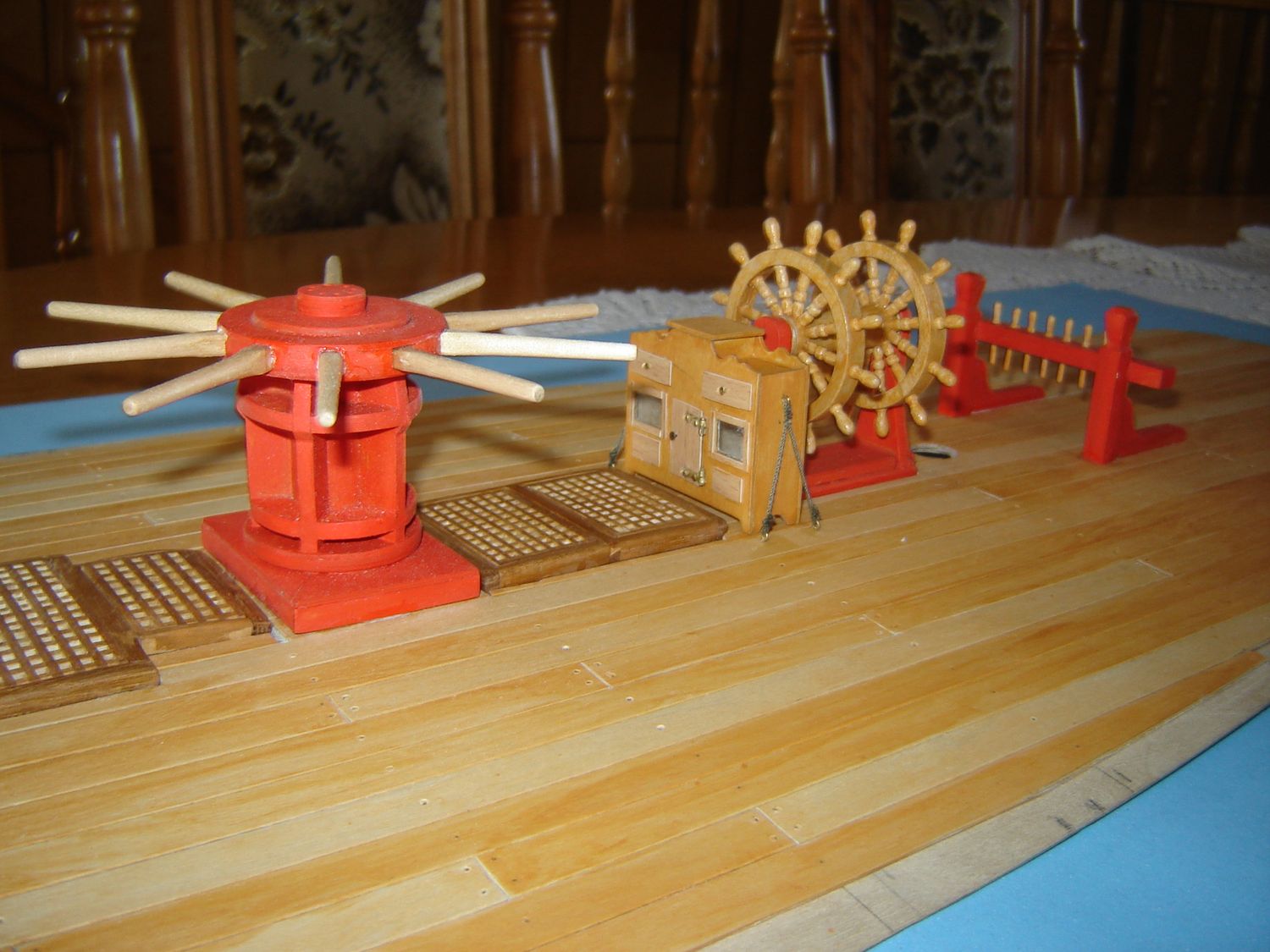 Właśnie skończyłem gretingi na pokładzie rufowym. Następnym elementem będzie szafka kompasowa, chyba nazywa się ona naktuz. Zrobię szafkę i dopiero wtedy cały pokład rufowy zamontuję na modelu.