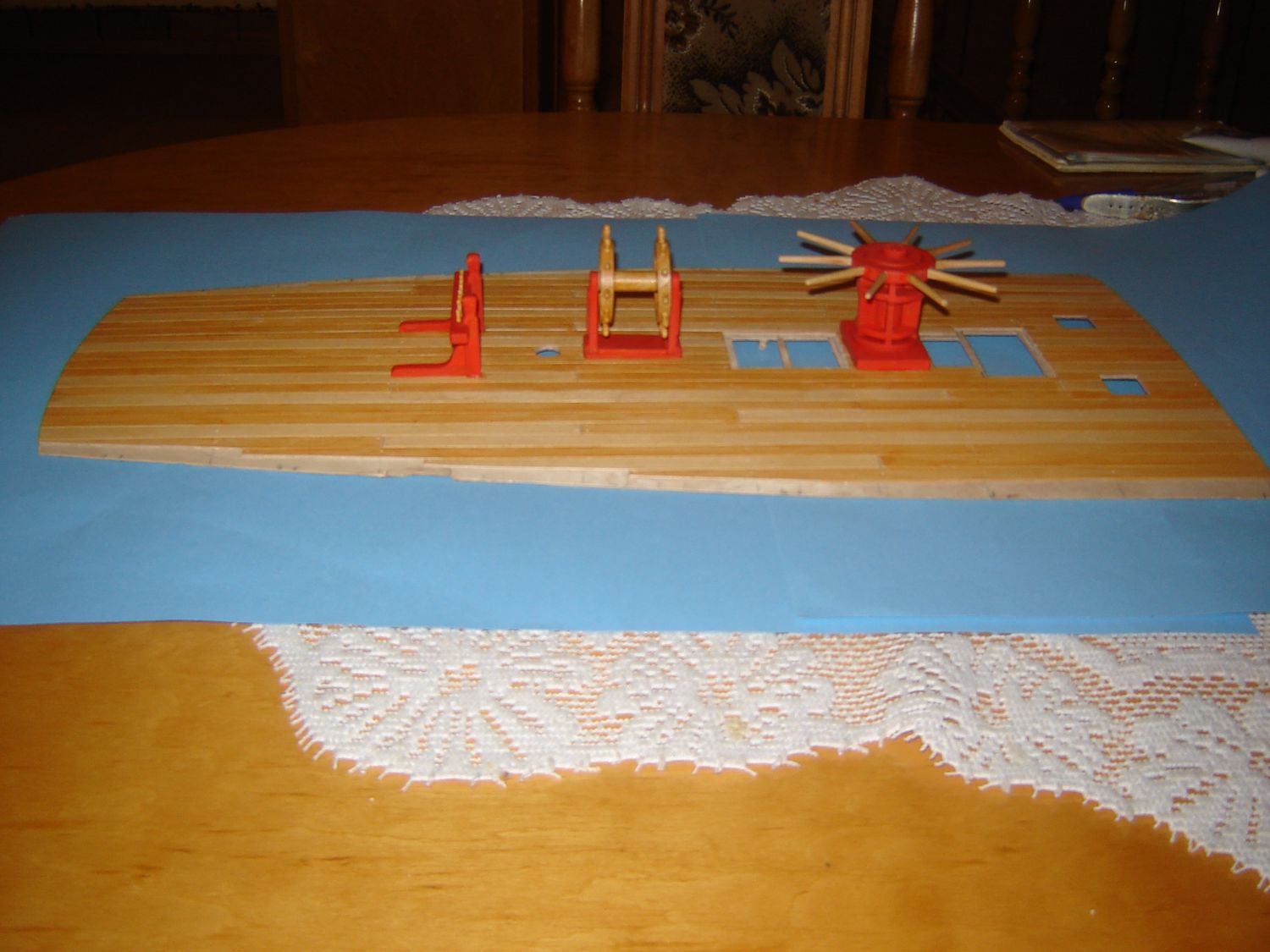 Nie mogłem się oprzeć pokusie, żeby przymierzyć na modelu wykonane lecz jeszcze nie zamontowane elementy. Po ułożeniu ich na pokładzie wygląda to tak.