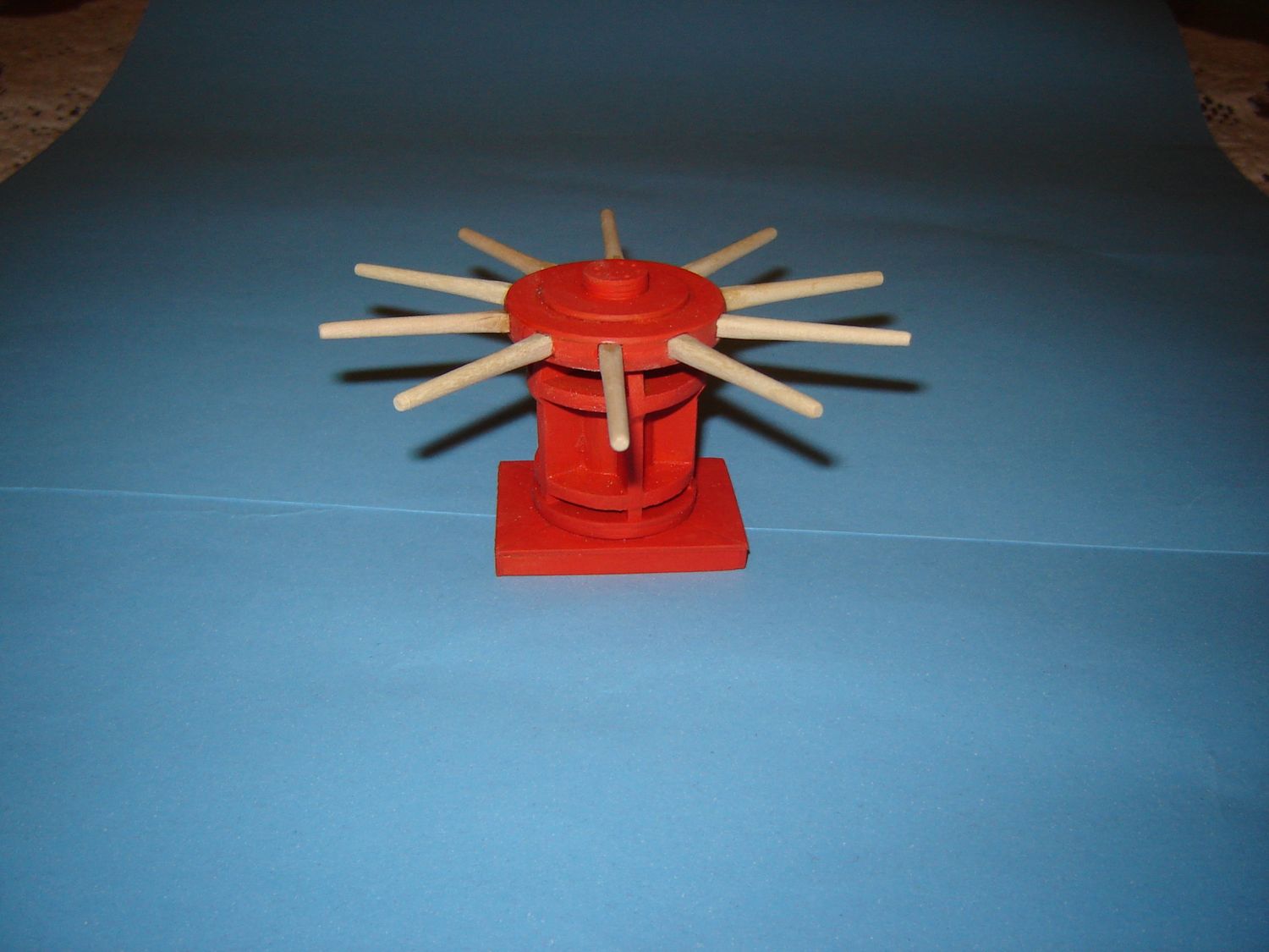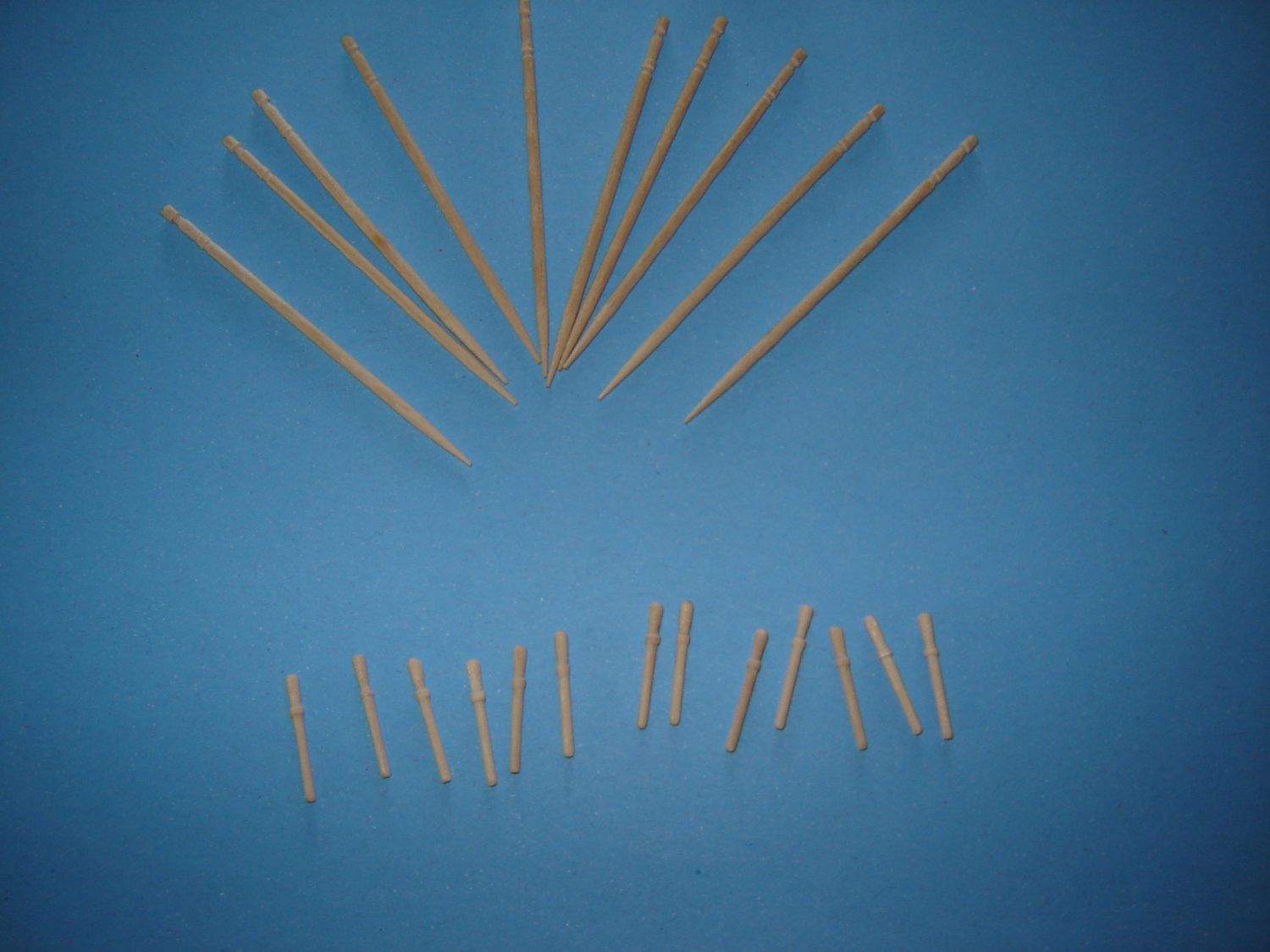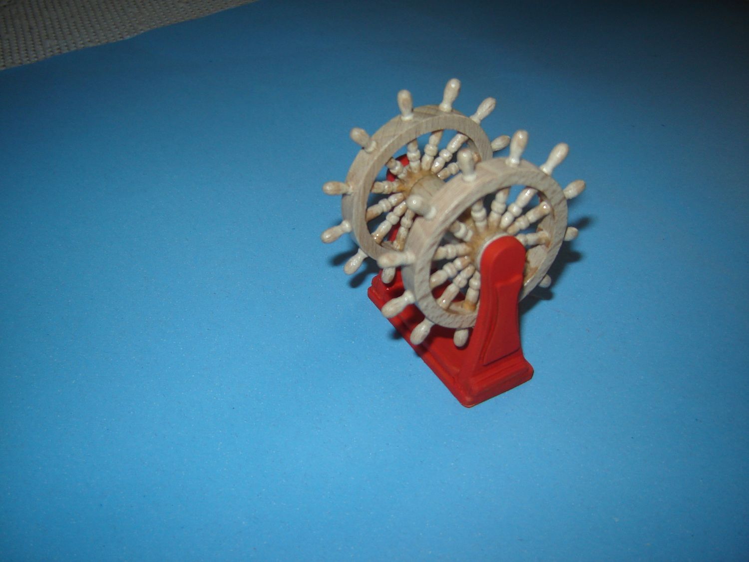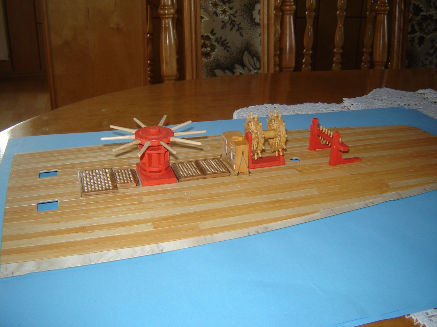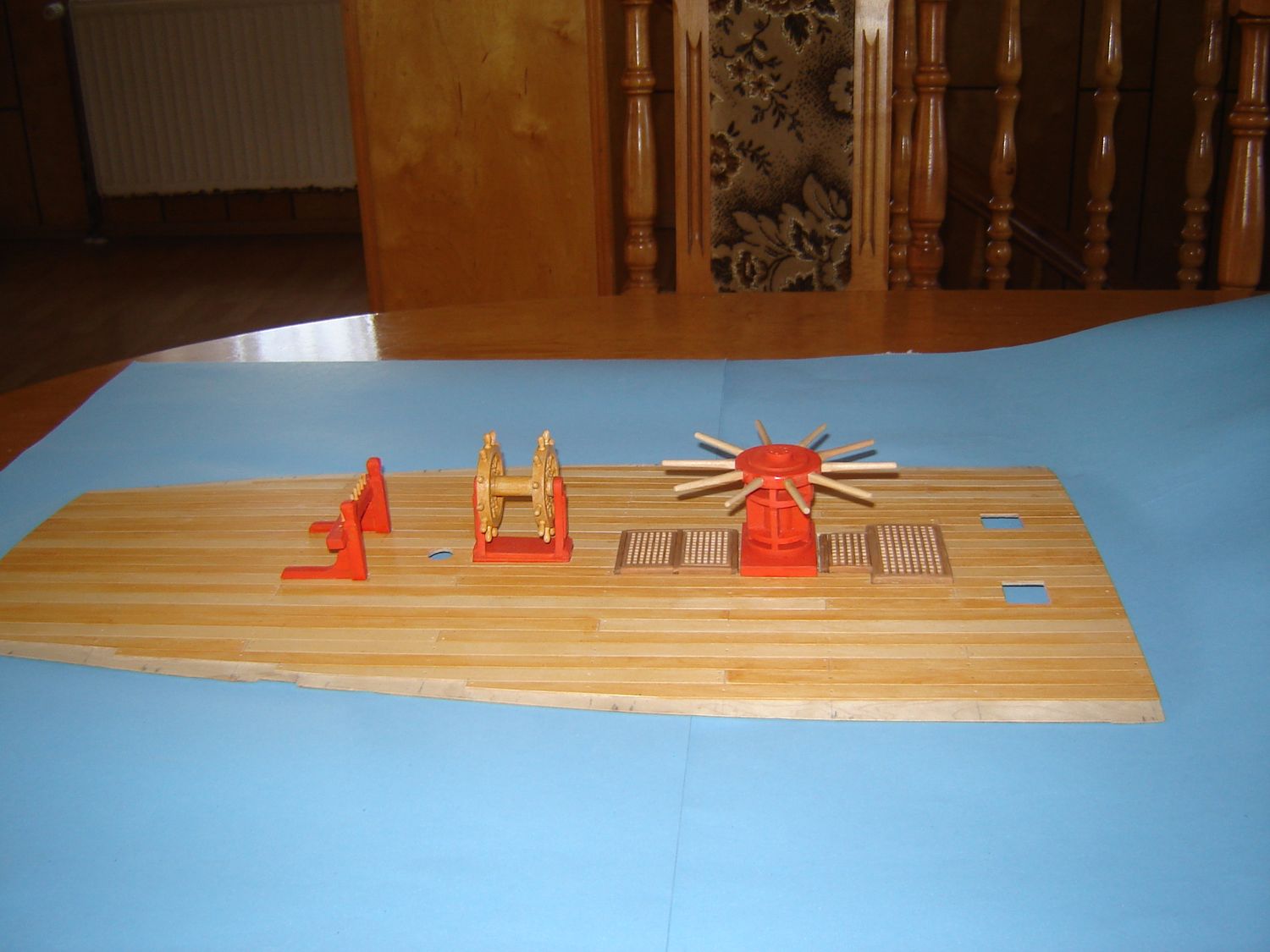 Znowu coś tam zrobiłem przy modelu. Okleiłem pokład listewkami, oczywiście nie do końca bo cały czas pokład sklejam poza modelem. Zrobiłem koło sterowe, przyznaję że same koła zakupiłem, dorobiłem jedynie podstawę. Zrobiłem też kołkownicę i nagle. Nagle zrobiłem z wykałaczek. Wykałaczki kupiłem w sklepie spożywczym po 1,50 zeta za 100 szt. Są one w górnej części toczone, dlatego nagle powstały stosunkowo niewielkim nakładem pracy. Mam takie urządzenie przerobione ze stołowej szlifierki, do której dopasowałem z prawej strony uchwyt do wiertarki i dorobiłem drugi uchwyt na łożysku. Pokażę to na zdjęciu. Toczę na tym a właściwie szlifuję przy pomocy papieru ściernego maszty i reje. Teraz na tej szlifierce przy pomocy paska papieru ściernego wyszlifowałem nagle. Dzisiaj zrobiłem też kabestan i wszystko zamontowałem na pokładzie. Teraz zrobię jeszcze gretingi i cały pokład zamontuję na modelu.