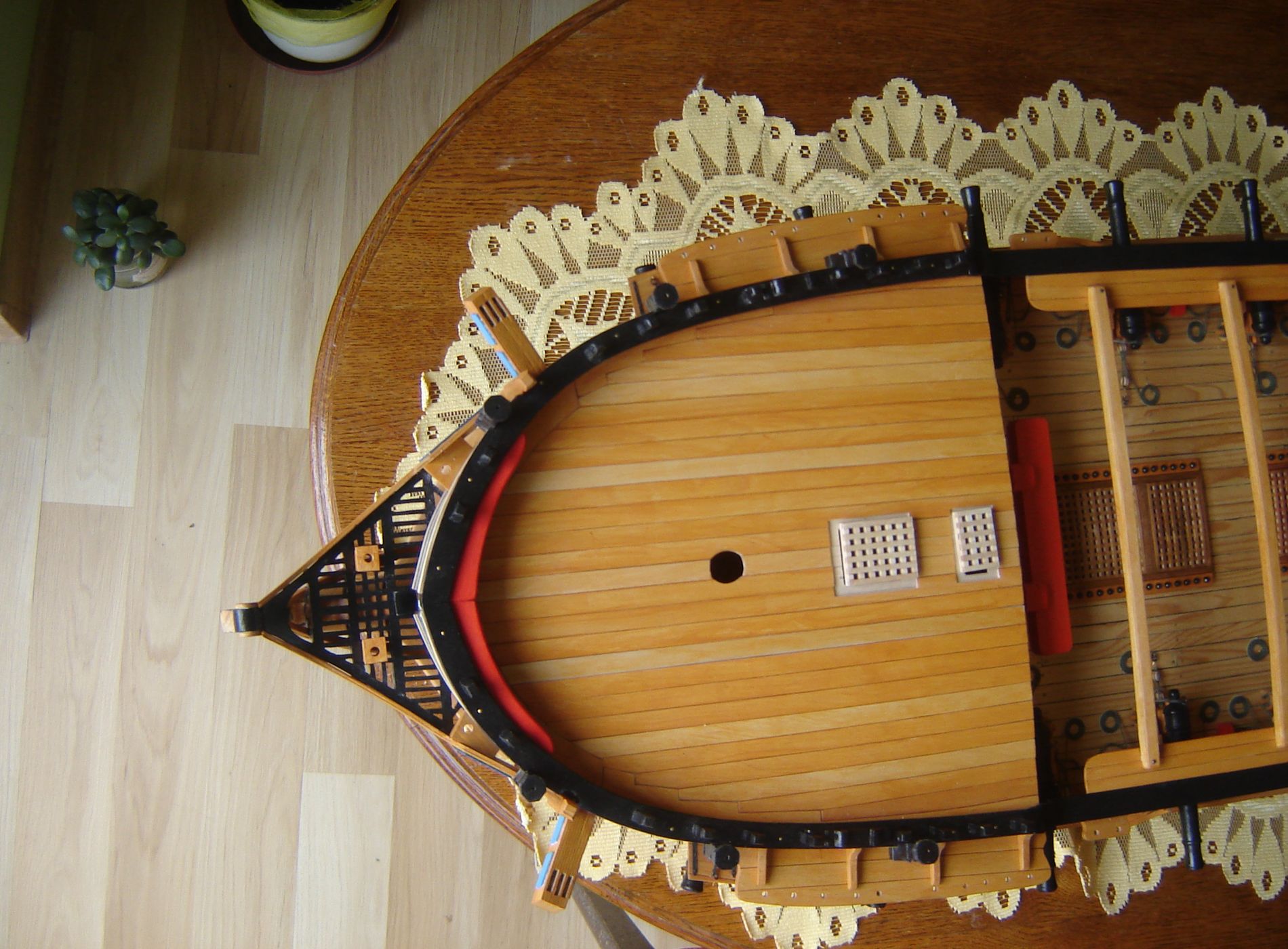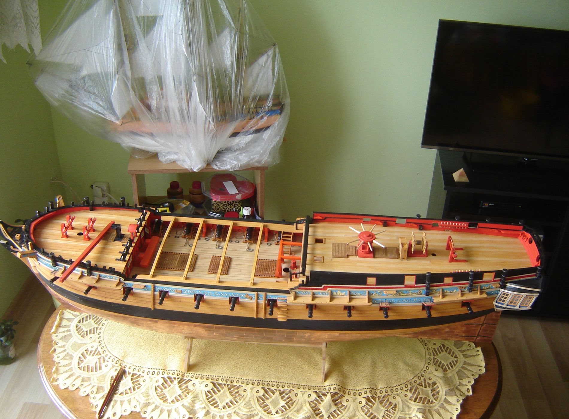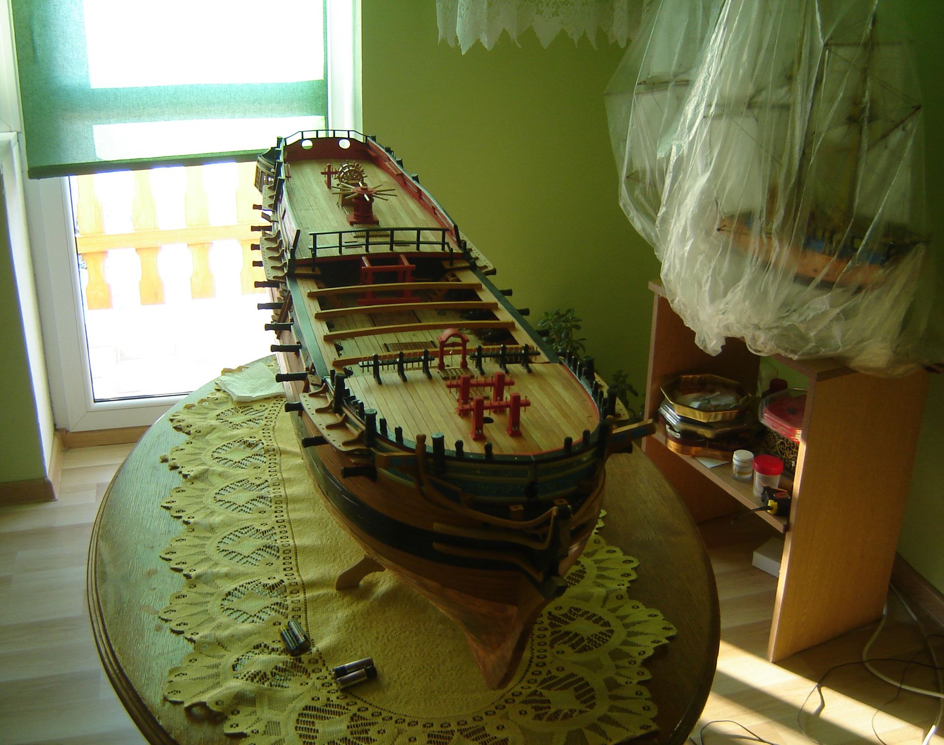 Wydłubałem ostatnio fiszbelkę i jeszcze "coś". Piszę tak bo do końca nie wiem co to jest. Czy jest to komin czy może jakiś wywietrznik. Gdyby to był komin to dlaczego według wycinanki jego wylot skierowany jest w stronę dziobu okrętu. W czasie kiedy okręt płynie to cały dym zamiast uciekać na zewnątrz, pakowany byłby z powrotem do środka. Ale mniejsza z tym. W dalszym ciągu nie do końca wiem jak działała fiszbelka. Z tego co dowiedziałem się z internetu, wynika że fiszbelka wykorzystywana w końcowym stadium wyciagania kotwicy z wody i działała na zasadzie przeciwwagi. Nie wiem jak wyglądała lina zamontowana na fiszbelce. Czy miała jakiś hak, bo kotwica była "łapana" za łapę. Czy lina była w jakiś sposób odkładana na pokładzie czy na tym końcu fiszbelki, który był na pokładzie. Wiem też, że fiszbelka mocowana była do pokładu metalowymi okuciami i przekładana raz na jedną, raz na drugą burtę w zależności od tego która kotwica była podnoszona. Jeśli ktoś ma jakieś wiadomości na ten temat to bardzo proszę o pomoc.