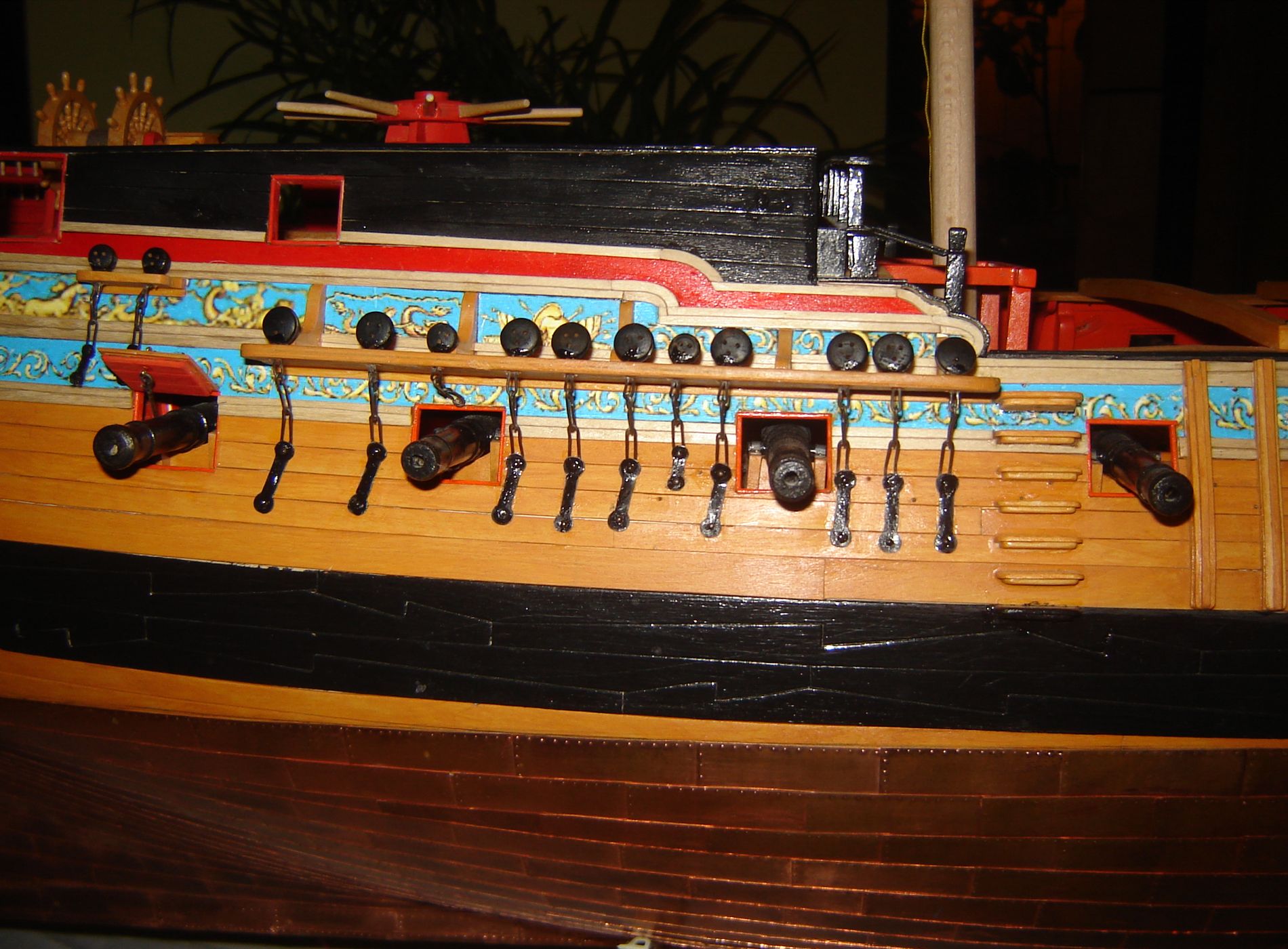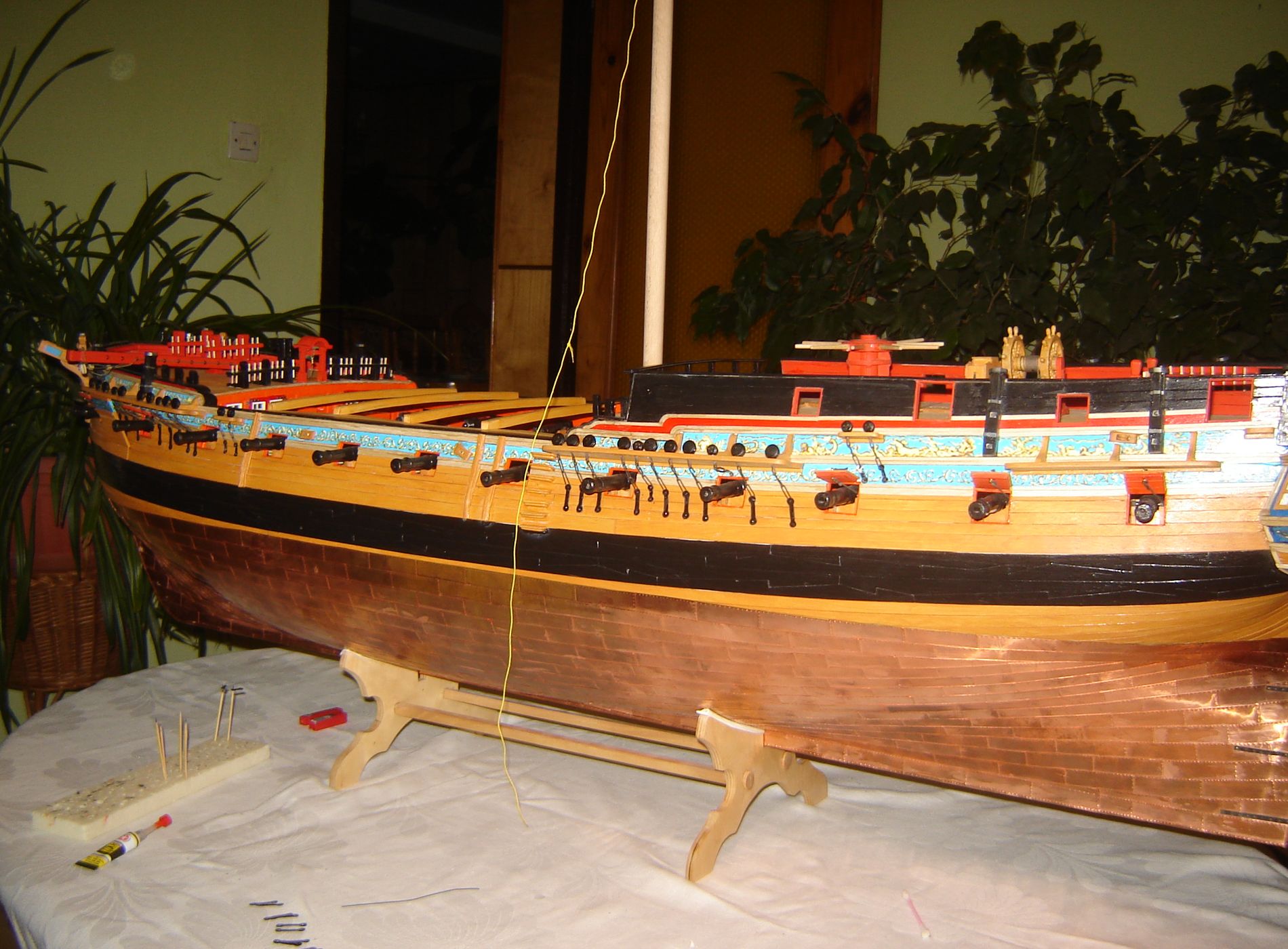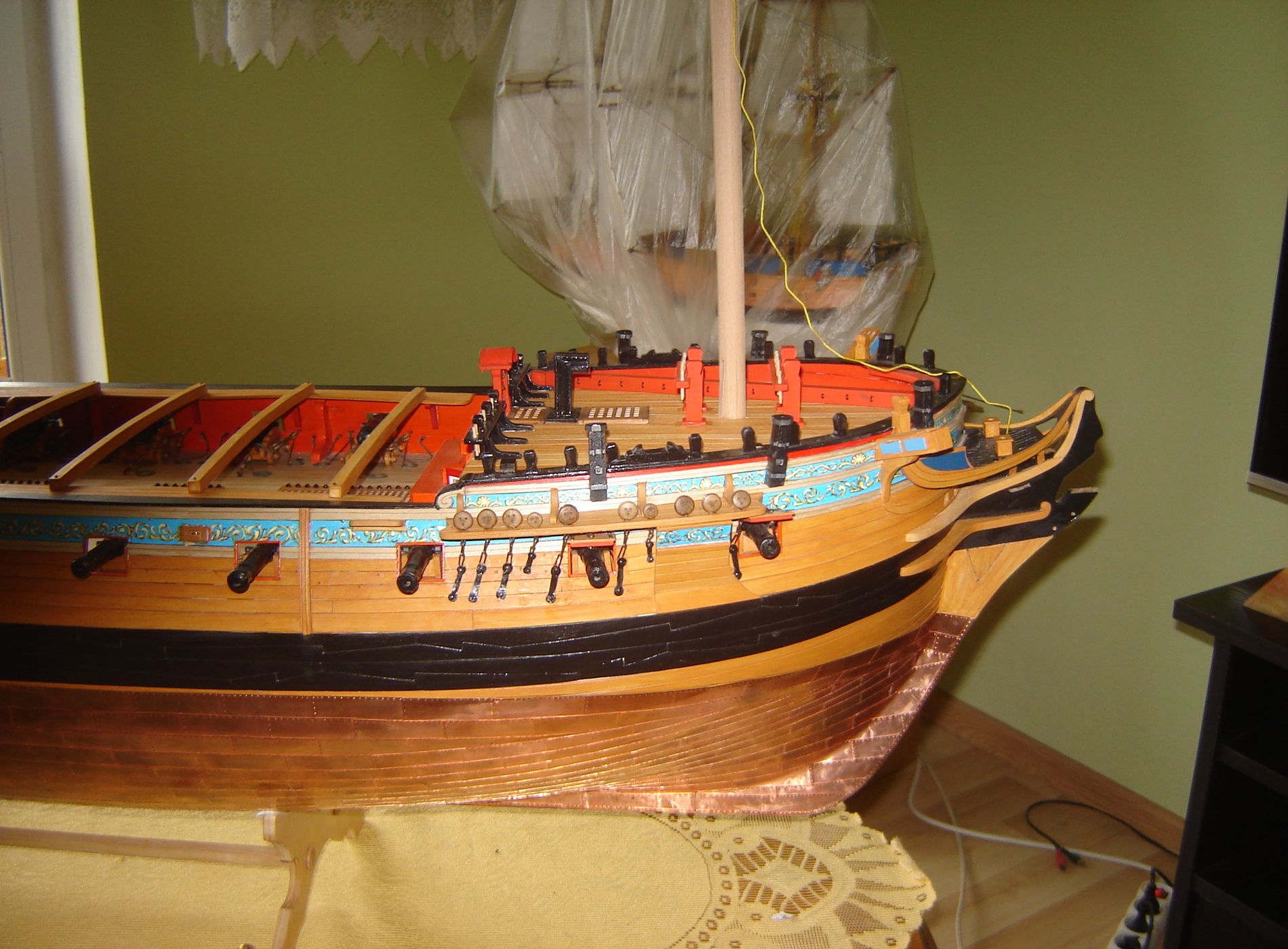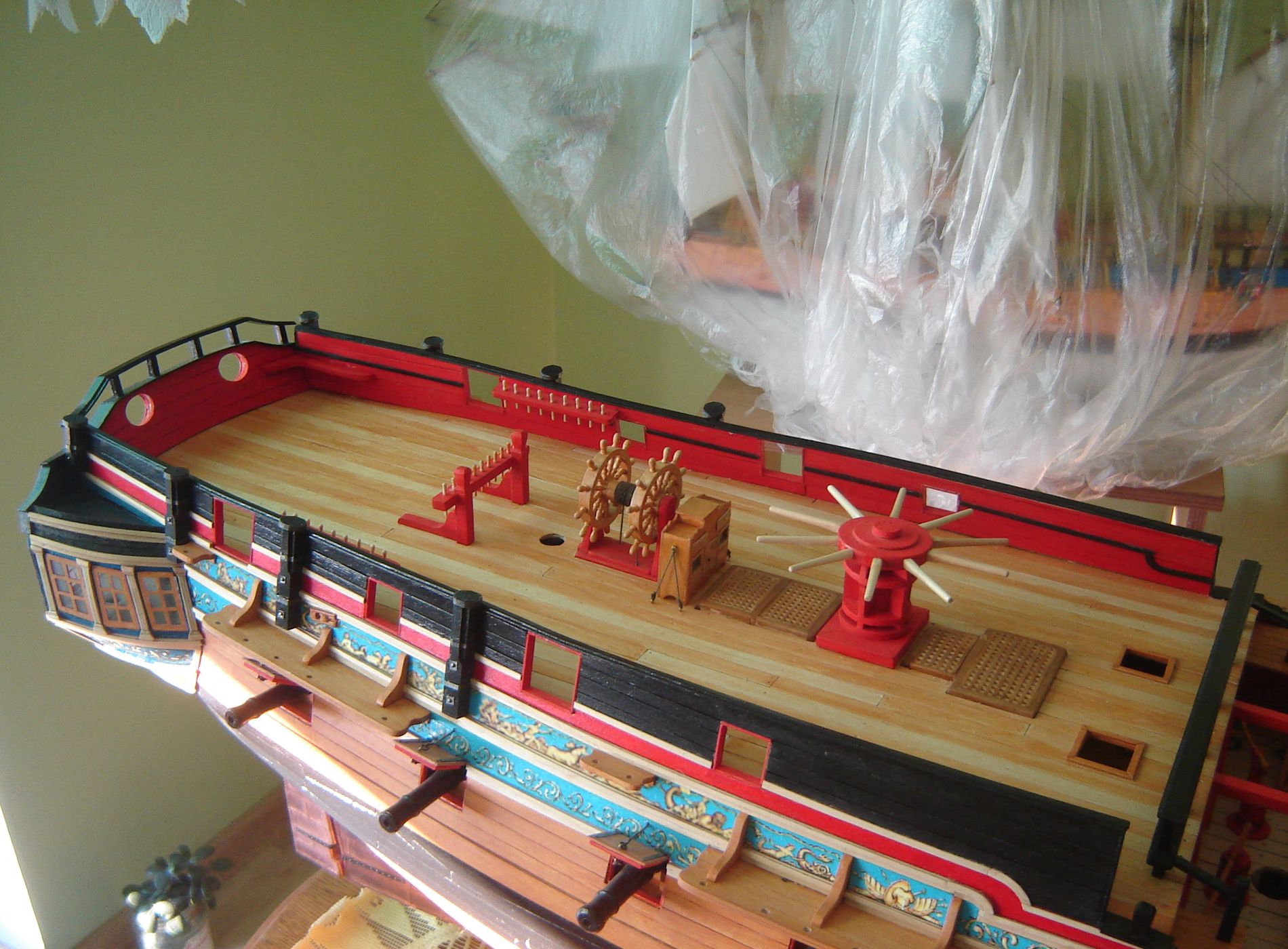 Wydłubałem ostatnio fiszbelkę i jeszcze "coś". Piszę tak bo do końca nie wiem co to jest. Czy jest to komin czy może jakiś wywietrznik. Gdyby to był komin to dlaczego według wycinanki jego wylot skierowany jest w stronę dziobu okrętu. W czasie kiedy okręt płynie to cały dym zamiast uciekać na zewnątrz, pakowany byłby z powrotem do środka. Ale mniejsza z tym. W dalszym ciągu nie do końca wiem jak działała fiszbelka. Z tego co dowiedziałem się z internetu, wynika że fiszbelka wykorzystywana w końcowym stadium wyciagania kotwicy z wody i działała na zasadzie przeciwwagi. Nie wiem jak wyglądała lina zamontowana na fiszbelce. Czy miała jakiś hak, bo kotwica była "łapana" za łapę. Czy lina była w jakiś sposób odkładana na pokładzie czy na tym końcu fiszbelki, który był na pokładzie. Wiem też, że fiszbelka mocowana była do pokładu metalowymi okuciami i przekładana raz na jedną, raz na drugą burtę w zależności od tego która kotwica była podnoszona. Jeśli ktoś ma jakieś wiadomości na ten temat to bardzo proszę o pomoc.