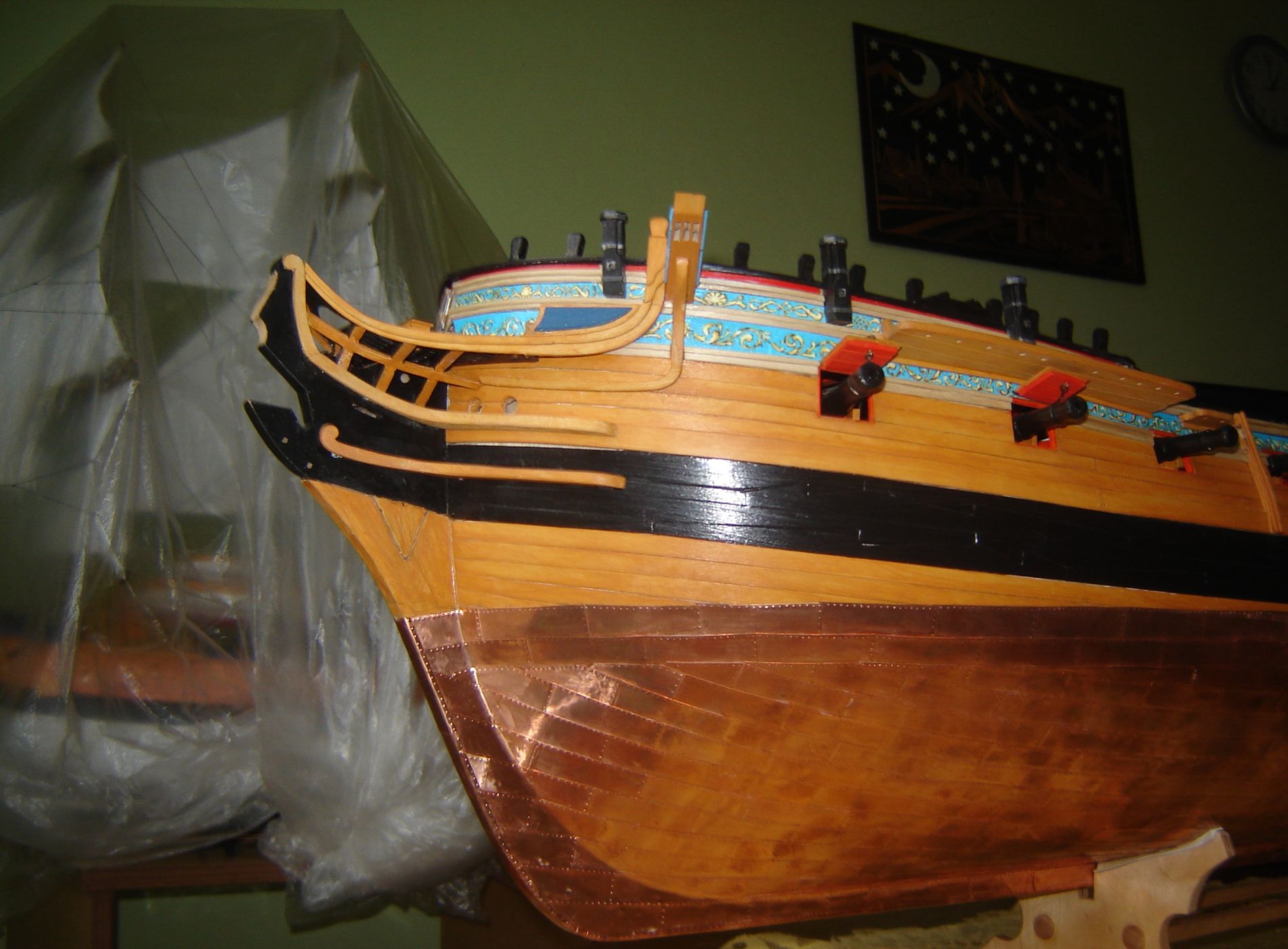 Ostatnio od kolegi Sławka otrzymałem materiały dot. fiszbelki i ostatecznie rozwiązałem ten problem. Teraz wiem, że fiszbelka była mocowana do pokładu metalowymi okuciami w ten sposób żeby ją można było w kazdej chwili wyjąć i przełożyć na tę burtę przy której kotwica była właśnie podnoszona. Wzdłuż belki zamocowana była z pomocą odpowiednich "oczek" lina, która następnie połączona była z odpowiednim zestawem bloczków, te z kolei połączone były z liną przechodzącą przez bloczek z rolką zamontowany w przedniej części fiszbelki. Na końcu tej liny zamontowany był hak, który w czasie podnoszenia kotwicy zaczepiano za trzon kotwicy. W miarę podnoszenia kotwicy hak ślizgając się po trzonie kotwicy przesuwał się w kierunku łap kotwicy. Zastosowane bloczki umożliwiały podnoszenie dosyć ciężkiej kotwicy jednemu człowiekowi. Lina przechodząca przez bloczki była następnie odkładana na pachołku przy wsporniku fiszbelki zamontowanym na burcie.