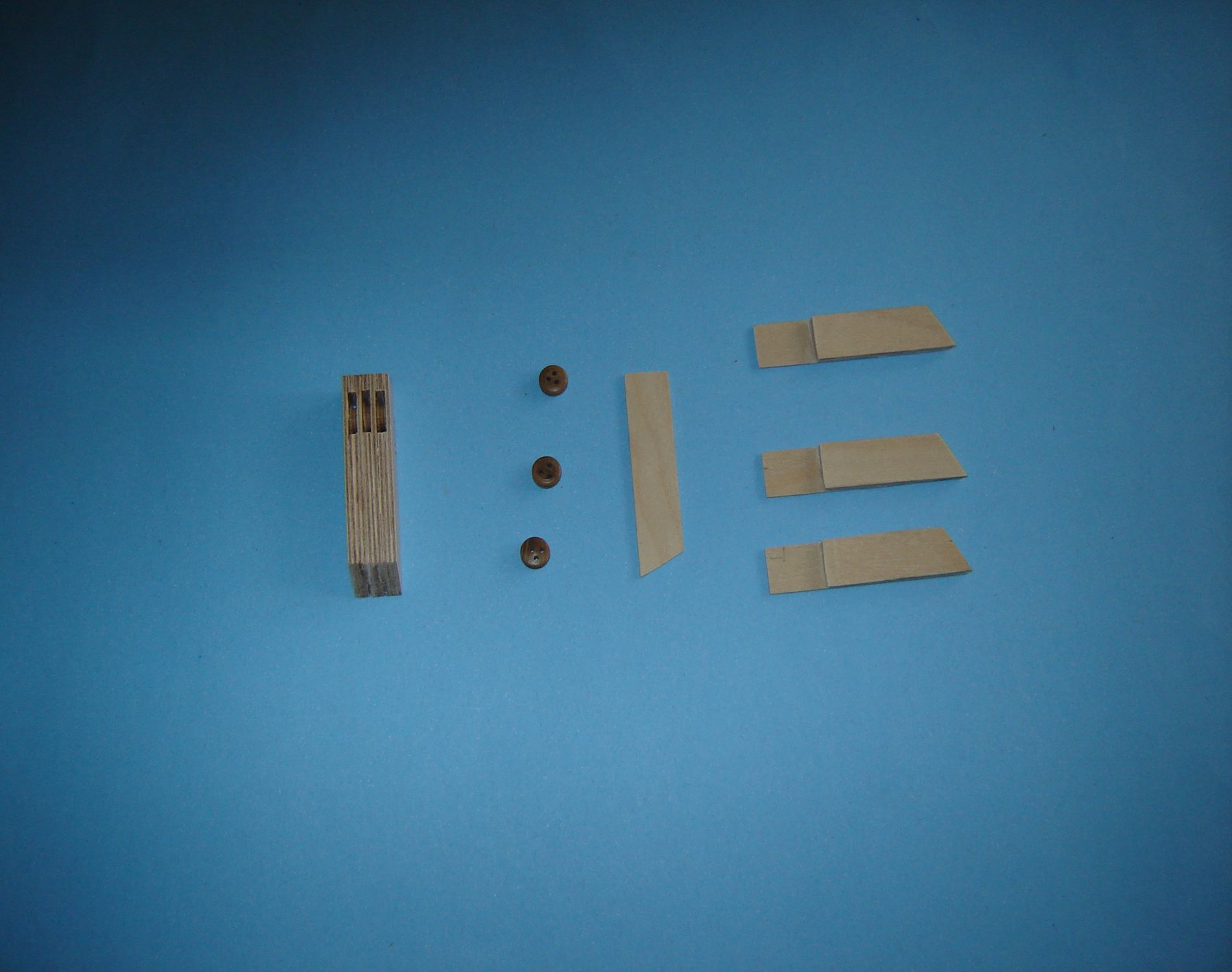 Następne kołkownice. Słupki tych kołkownic wykonałem ze sklejonych pasków sklejki a rolki powstały z 5 mm jufersów podobnie jak wcześniej wykonane kotbelki. Podstawy słupków również powstały ze sklejki.