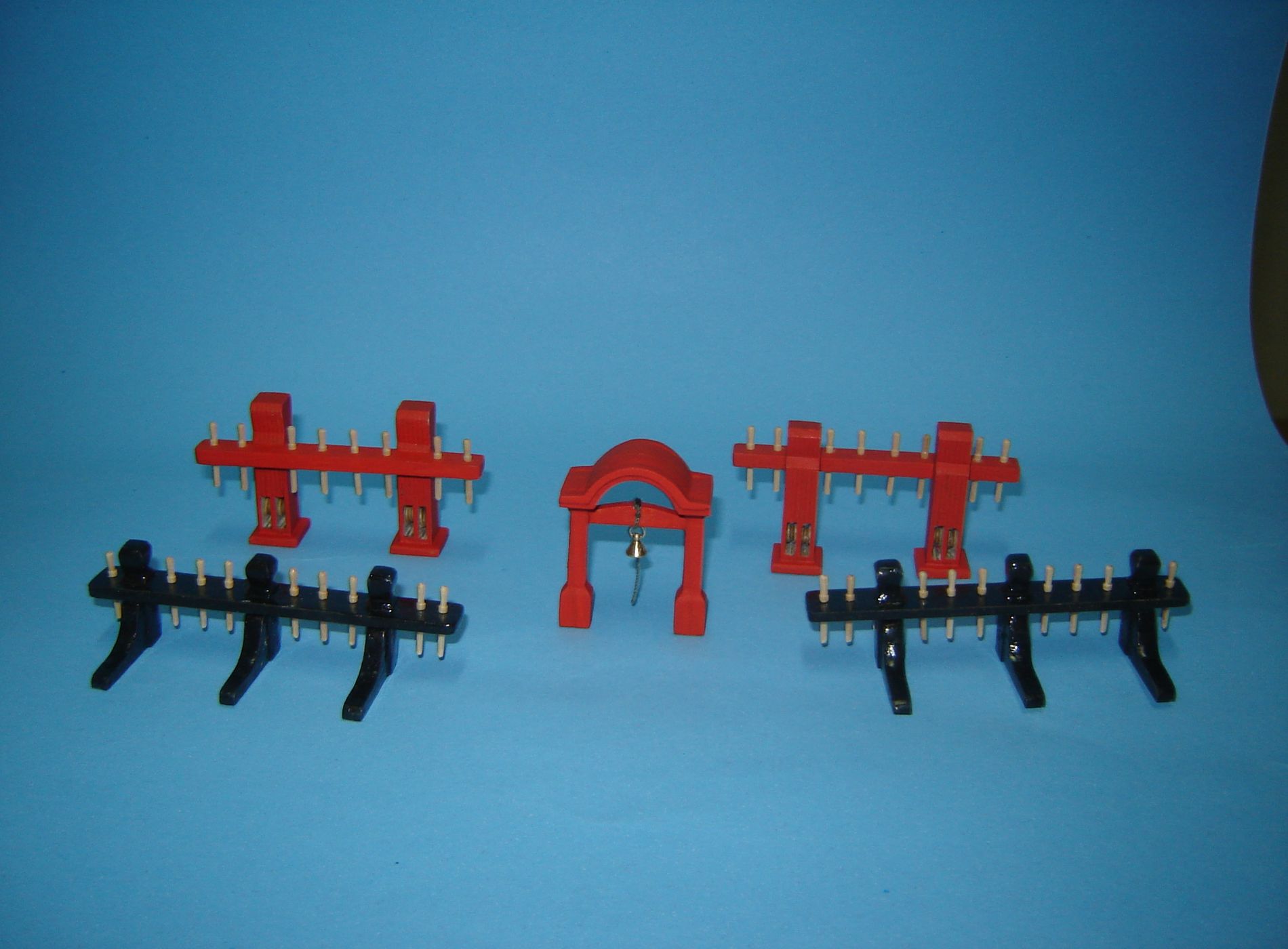 Wszystko pomalowane farbami akrylowymi i prawie gotowe do montażu na modelu. Dzwon do dzwonnicy kupiony jego wielkość to 5 mm. Zamontowałem do niego metalowe kółeczko i przywiązałem linką 0,3 mm. Do serca dzwonu dokleiłem kropelką kawałeczek takiej samej linki. Nagle wyszlifowałem z wykałaczek metodą opisaną we wcześniejszych postach.