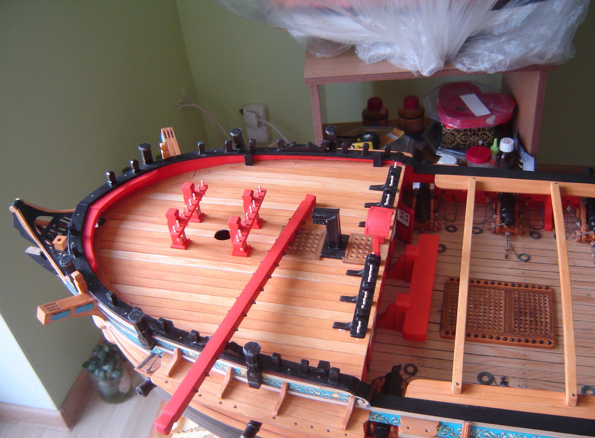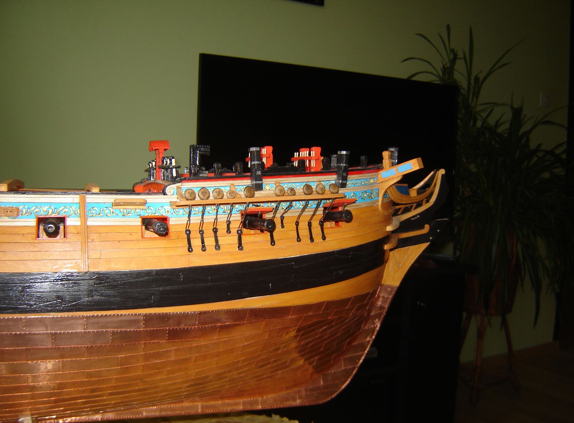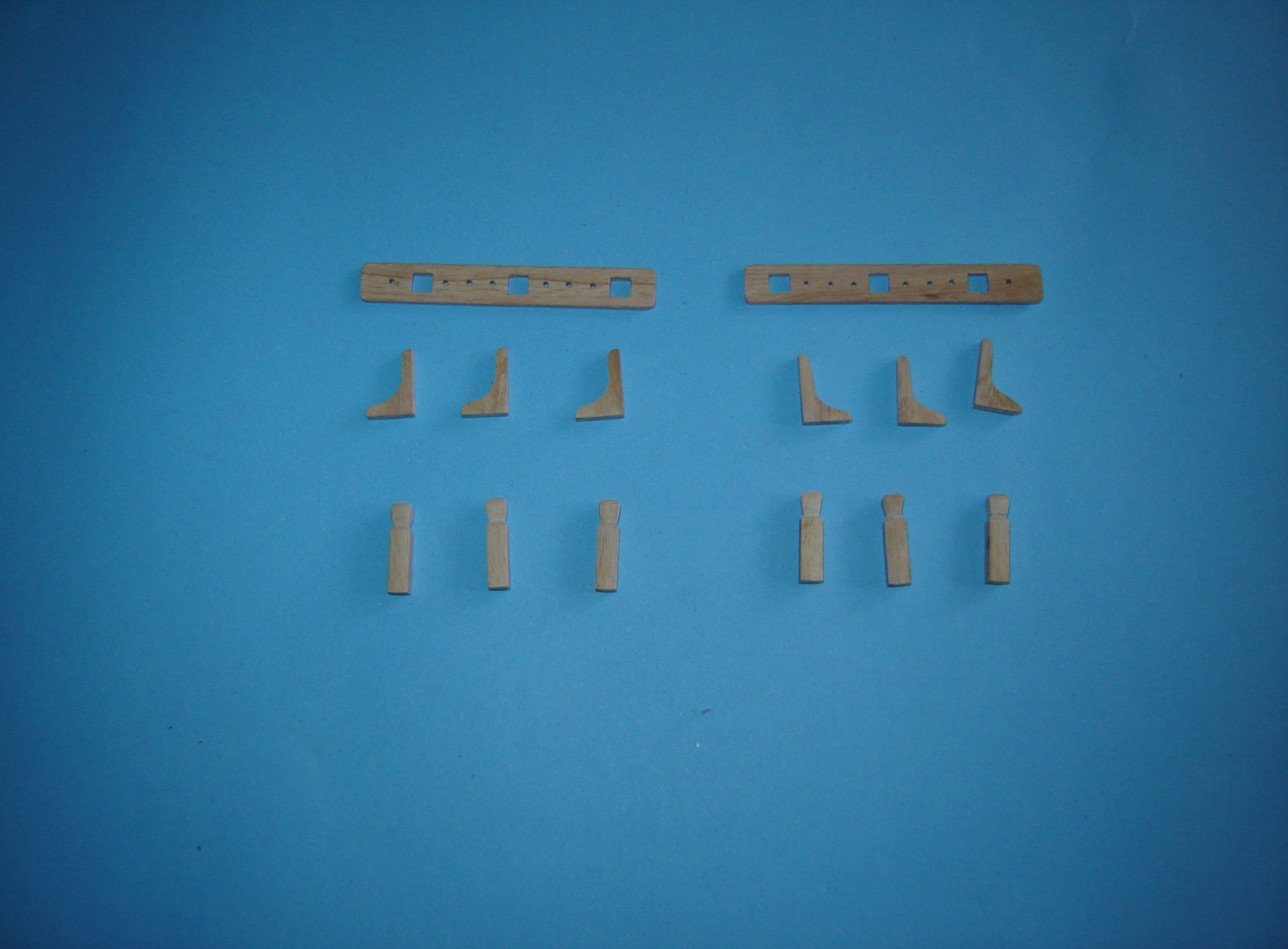 Przeglądnąłem jeszcze raz plany otrzymane od Pitera i wiem ponad wszelką wątpliwość, że to czarne co ostatnio wystrugałem to na pewno jest komin od pieca okrętowego, natomiast o fiszbelce w planach nie ma nic więcej ponadto co już wiem. Szkoda tylko,że nikt z kogi nie chciał mi podać więcej informacji na temat fiszbelki. Poczekam aż kolega Sławek wróci z wczasów to na pewno podeśle mi jakieś materiały na ten temat. Ostatnio przez kilkanaście godzin sklejałem słupki z rolkami do których będą mocowane linki od żagli które po przejściu przez rolki odkładane są następnie na pachołkach lub knagach zamontowanych na burtach. Zamontowałem dziesięć takich słupków oraz 14 knag. 4 słupki zamontowane zostały na burtach na dziobie oraz 6 słupków i 14 knag na burtach rufy. Tyle na dzisiaj.