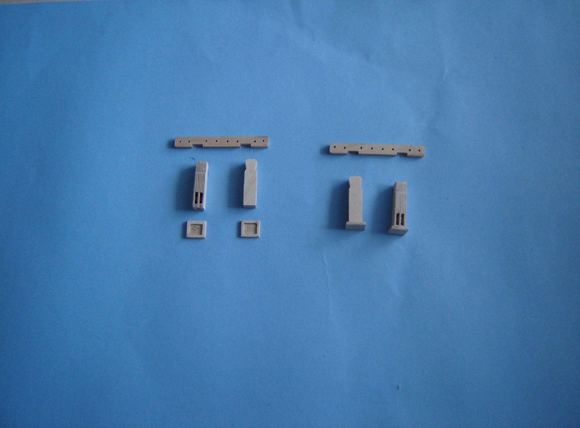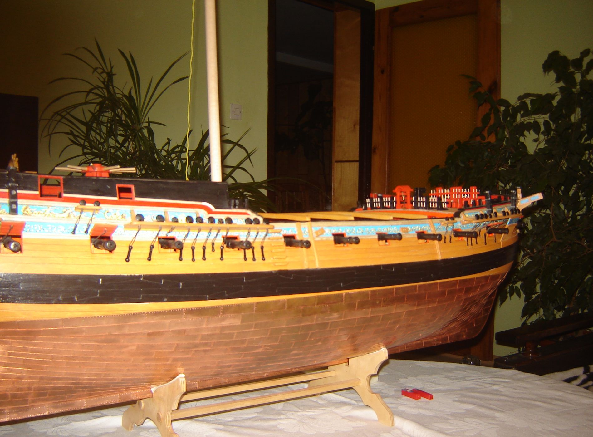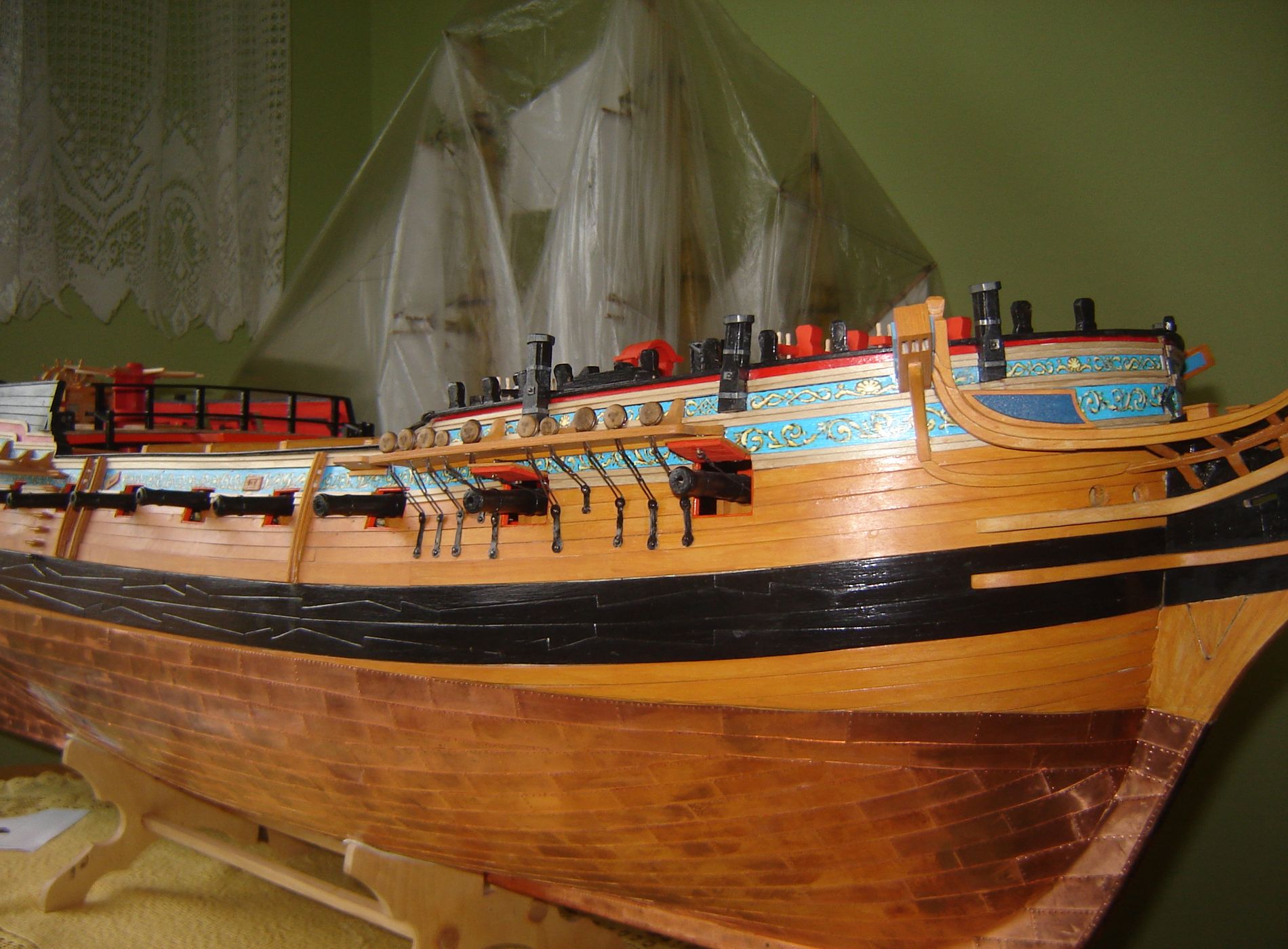 Przeglądnąłem jeszcze raz plany otrzymane od Pitera i wiem ponad wszelką wątpliwość, że to czarne co ostatnio wystrugałem to na pewno jest komin od pieca okrętowego, natomiast o fiszbelce w planach nie ma nic więcej ponadto co już wiem. Szkoda tylko,że nikt z kogi nie chciał mi podać więcej informacji na temat fiszbelki. Poczekam aż kolega Sławek wróci z wczasów to na pewno podeśle mi jakieś materiały na ten temat. Ostatnio przez kilkanaście godzin sklejałem słupki z rolkami do których będą mocowane linki od żagli które po przejściu przez rolki odkładane są następnie na pachołkach lub knagach zamontowanych na burtach. Zamontowałem dziesięć takich słupków oraz 14 knag. 4 słupki zamontowane zostały na burtach na dziobie oraz 6 słupków i 14 knag na burtach rufy. Tyle na dzisiaj.