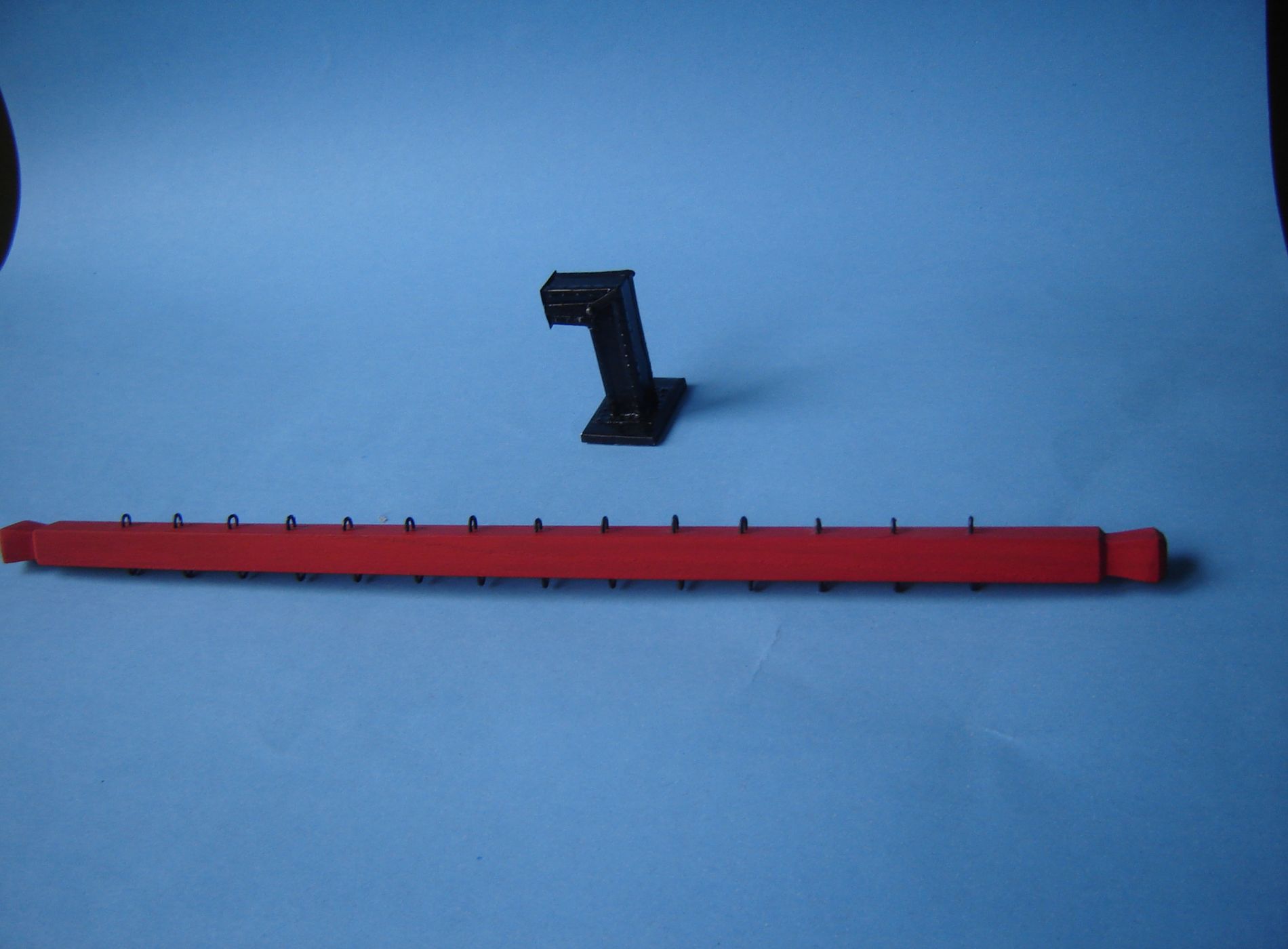 Następne kołkownice. Słupki tych kołkownic wykonałem ze sklejonych pasków sklejki a rolki powstały z 5 mm jufersów podobnie jak wcześniej wykonane  kotbelki. Podstawy słupków również powstały ze sklejki.