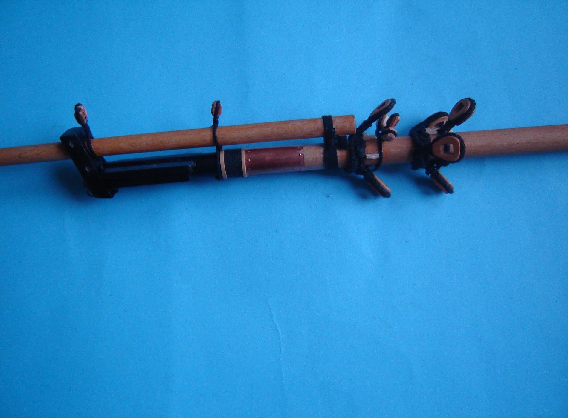 - Wieloliny zawiązałem odpowiednio z lin o różnych przekrojach. Na fokmaszcie o przekroju 0,9 mm, na grotmaszcie 1 mm i na bezanmaszcie 0,8 mm. Linki wykręciłem z nici bawełnianych jasno beżowych. Kolor linek zmieniłem na szaro beżowy podobny do koloru wyblinek mocząc je w herbacie.(metodą wcześniej prze zemnie opisaną)