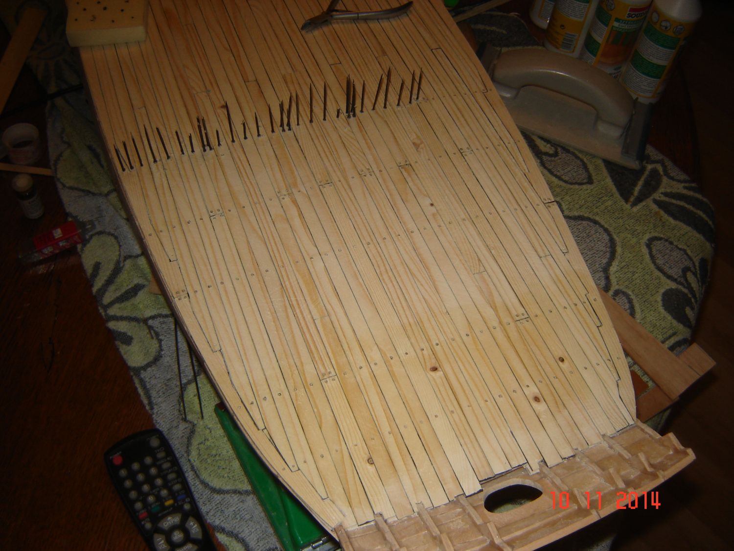 Po naklejeniu listewek na cały pokład przyszedł czas na kołkowanie.