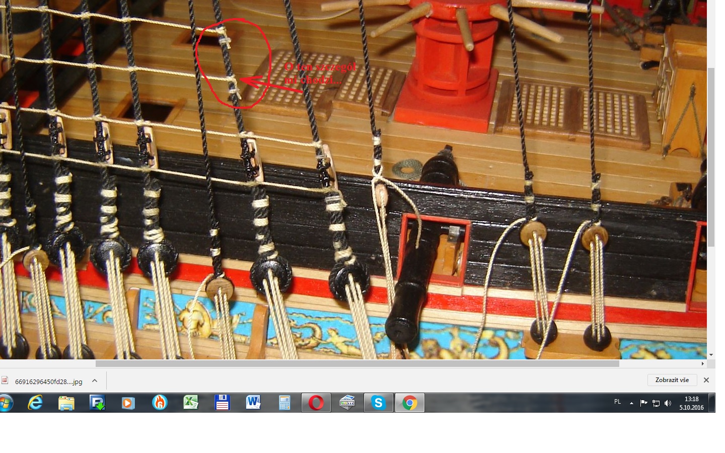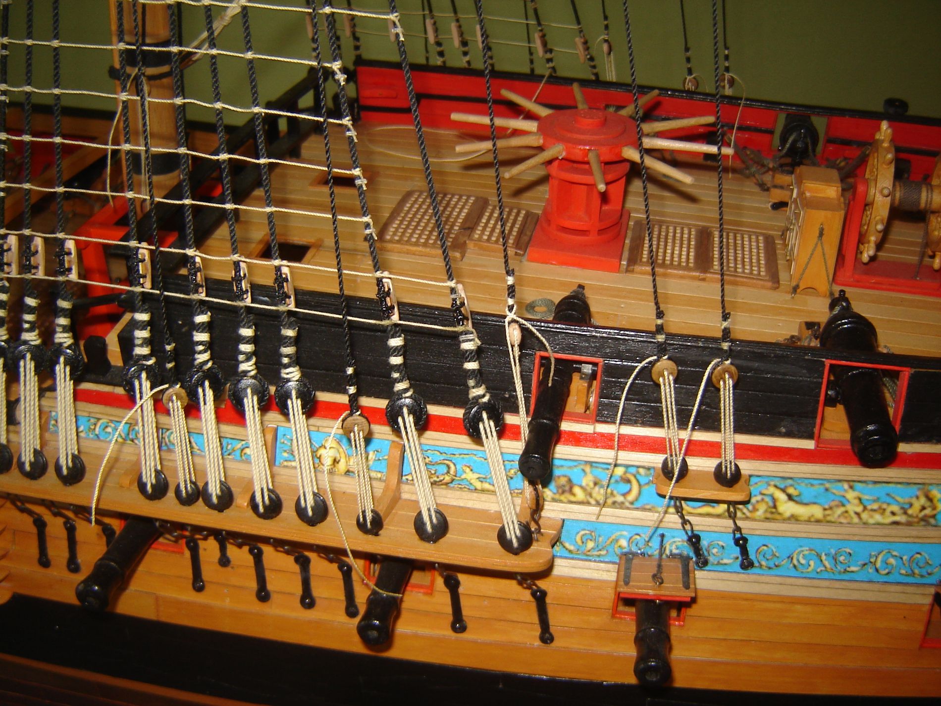 Ostatnio jednak pogoda dla mnie była łaskawa (padał deszcz) więc mogłem co nieco popracować przy modelu. Zawiązałem dodatkowo ponad 900 supełków i skończyłem wiązanie wszystkich wyblinek. Razem przy wiązaniu wyblinek zawiązałem ponad 2500 supełków.Powstały też wszystkie stenwanty oraz paduny na fokmaszcie. Na razie tyle . Załączam zdjęcia.