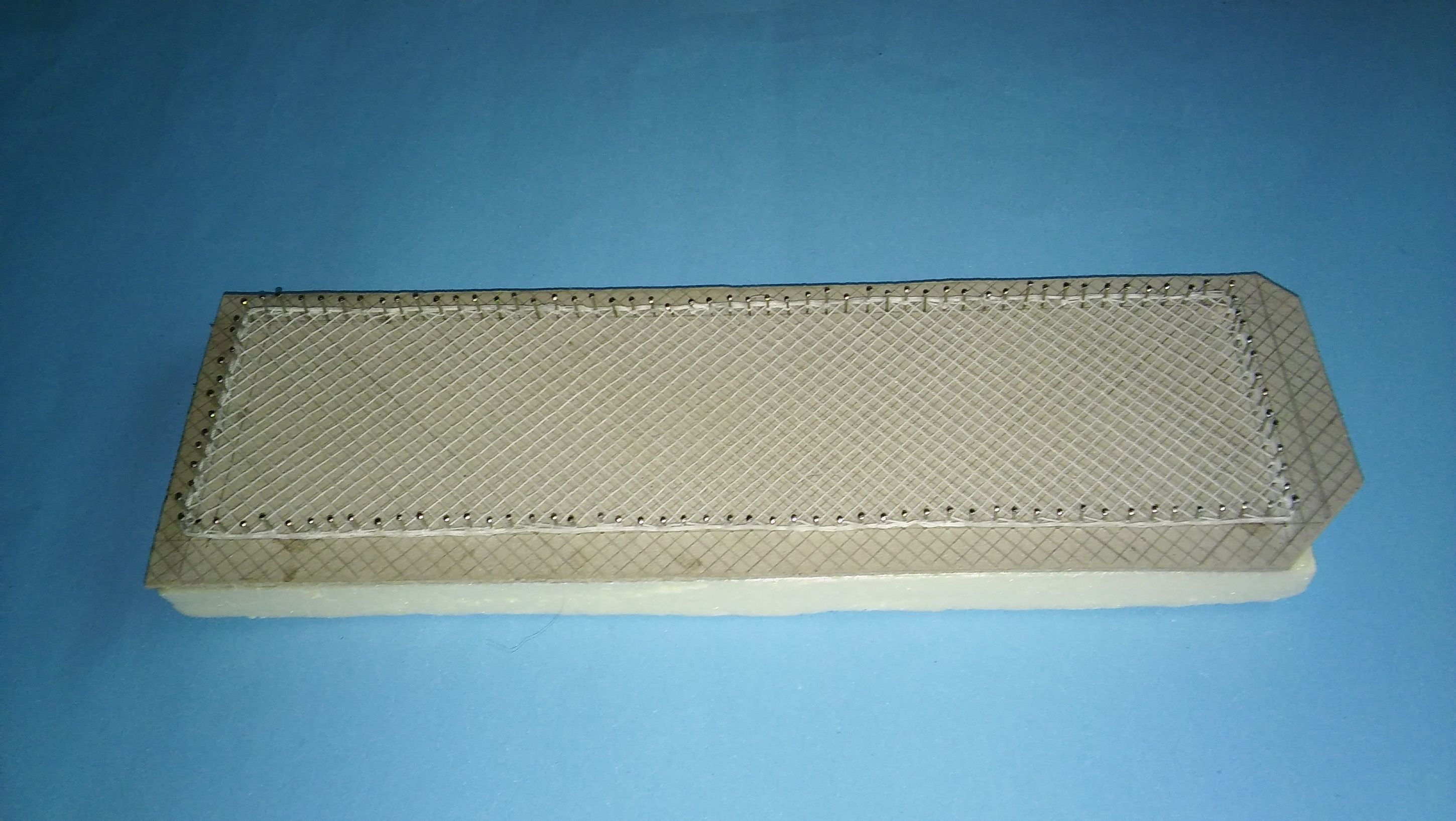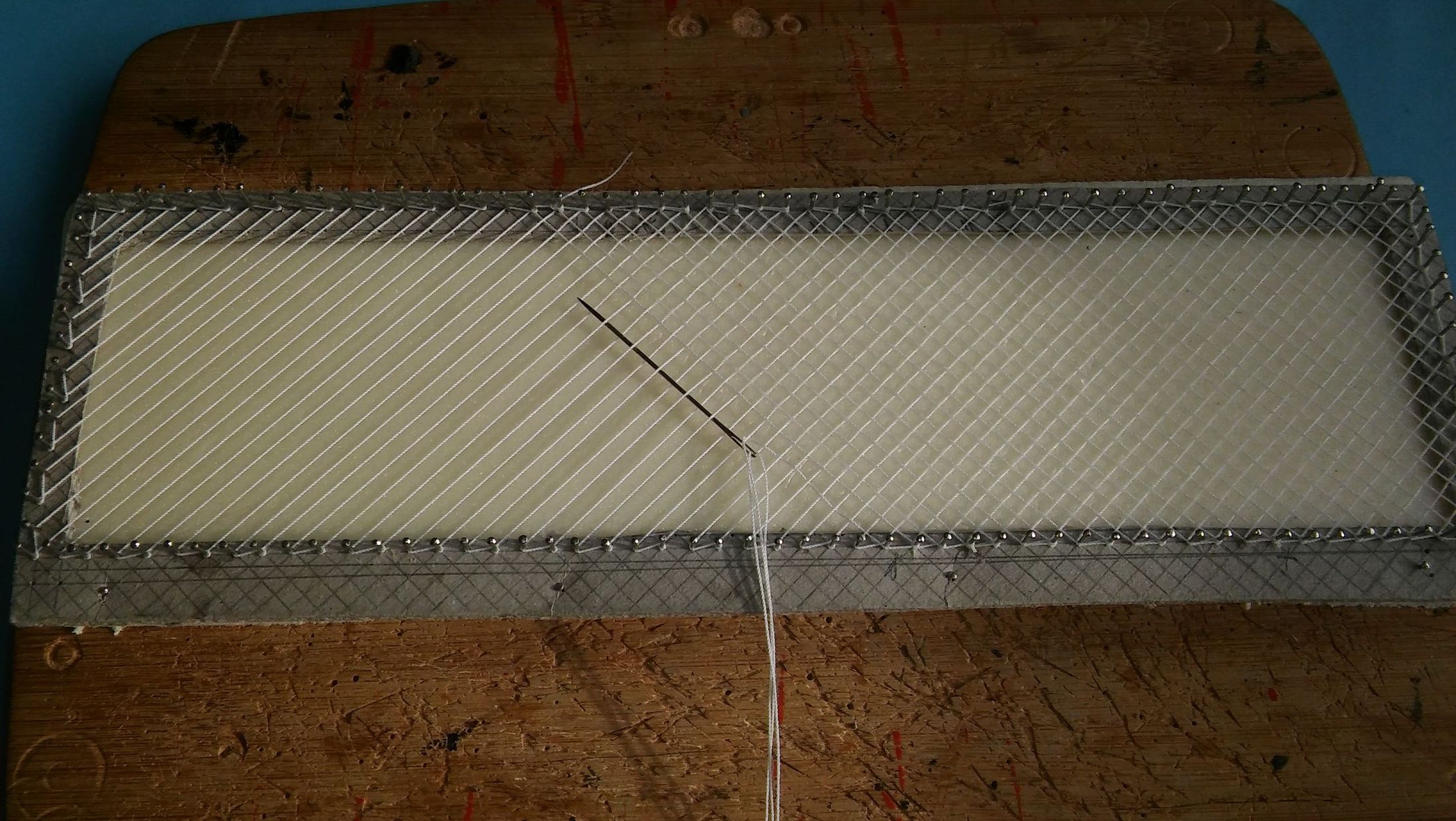 - Na tym zdjęciu widać jak zakładałem linkę. Najpierw pierwszą linkę zakładałem na szpilki równolegle jedna obok drugiej.(widać to z lewej strony). Następnie drugą linkę przewlekałem za pomocą igły na przemian prostopadle do założonej wcześniej linki. Miejsca styku linek delikatnie smarowałem kropelką.