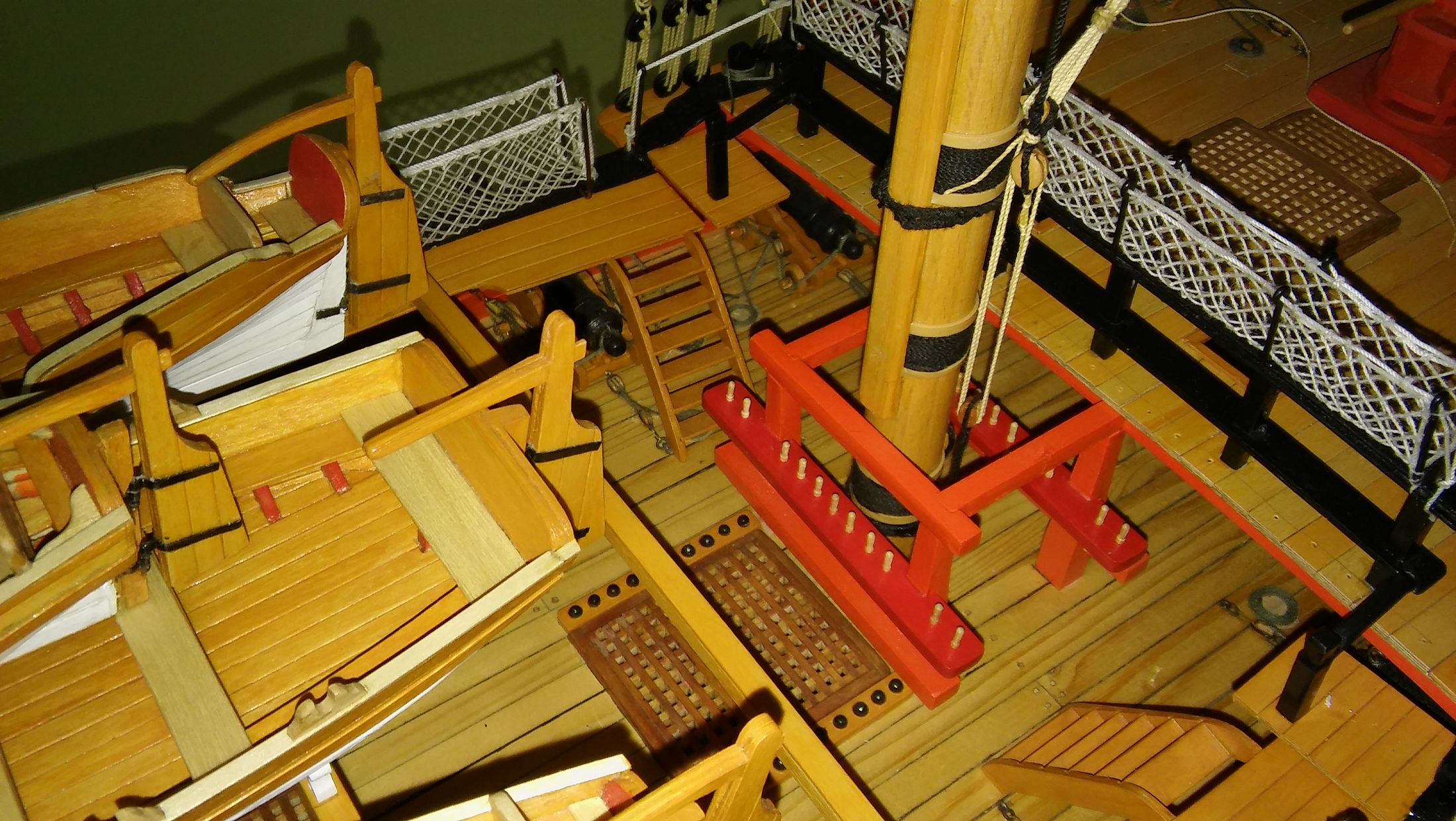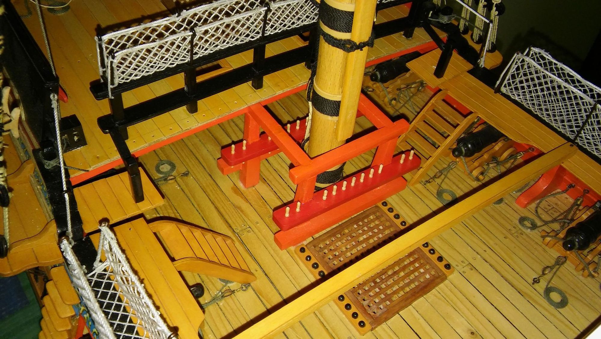 Przez kilka ostatnich dni wiązałem siatkę na relingi śródokręcia. Próbowałem ją zrobić różnych firanek i siatek na muchy ale nie zadowalało mnie to. Przypadkiem oglądałem siatkę na Victorym i przeliczyłem sobie, że oczka tej siatki maja około 12 cm.W skali mojego modelu jest to około 4 mm. Postanowiłem więc, że sobie taką siatkę wykręcę. Zaczynałem kilka razy wiązać, wyrzucałem zawiązane siatki i zaczynałem od nowa. Zniszczyłem kilkadziesiąt metrów linki, ale myślę że w końcu udało mi się jakąś siatkę wykręcić.