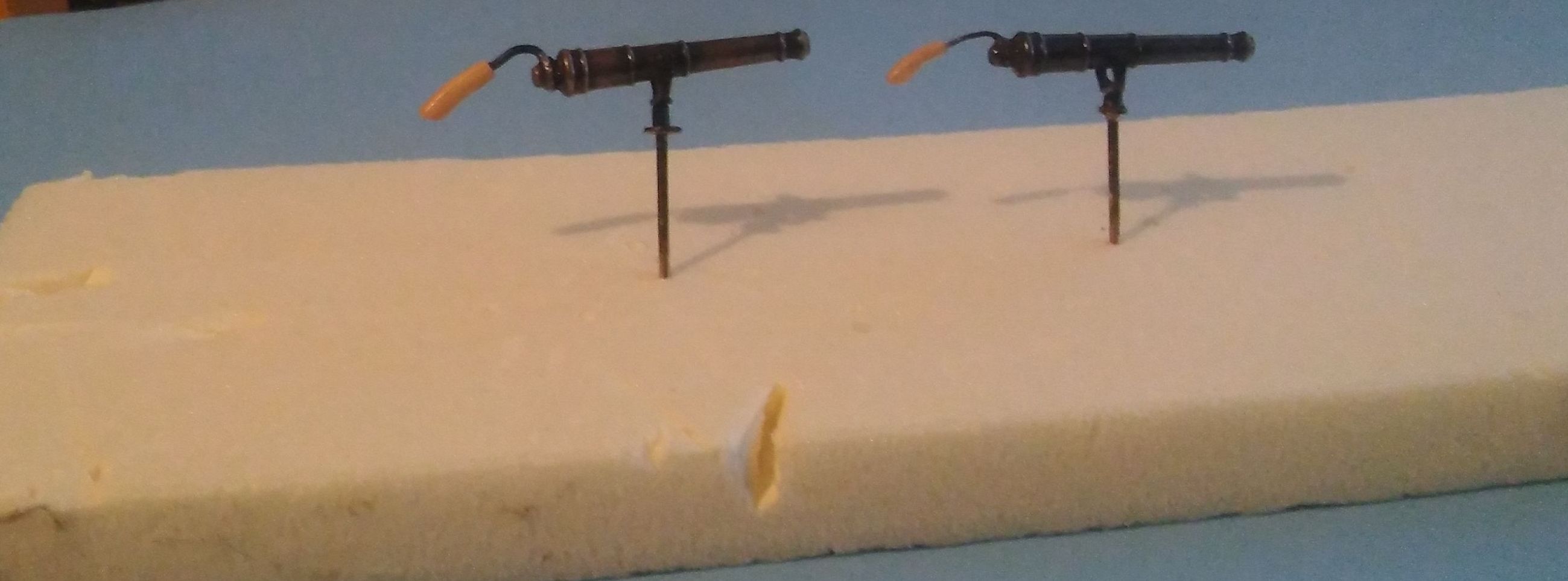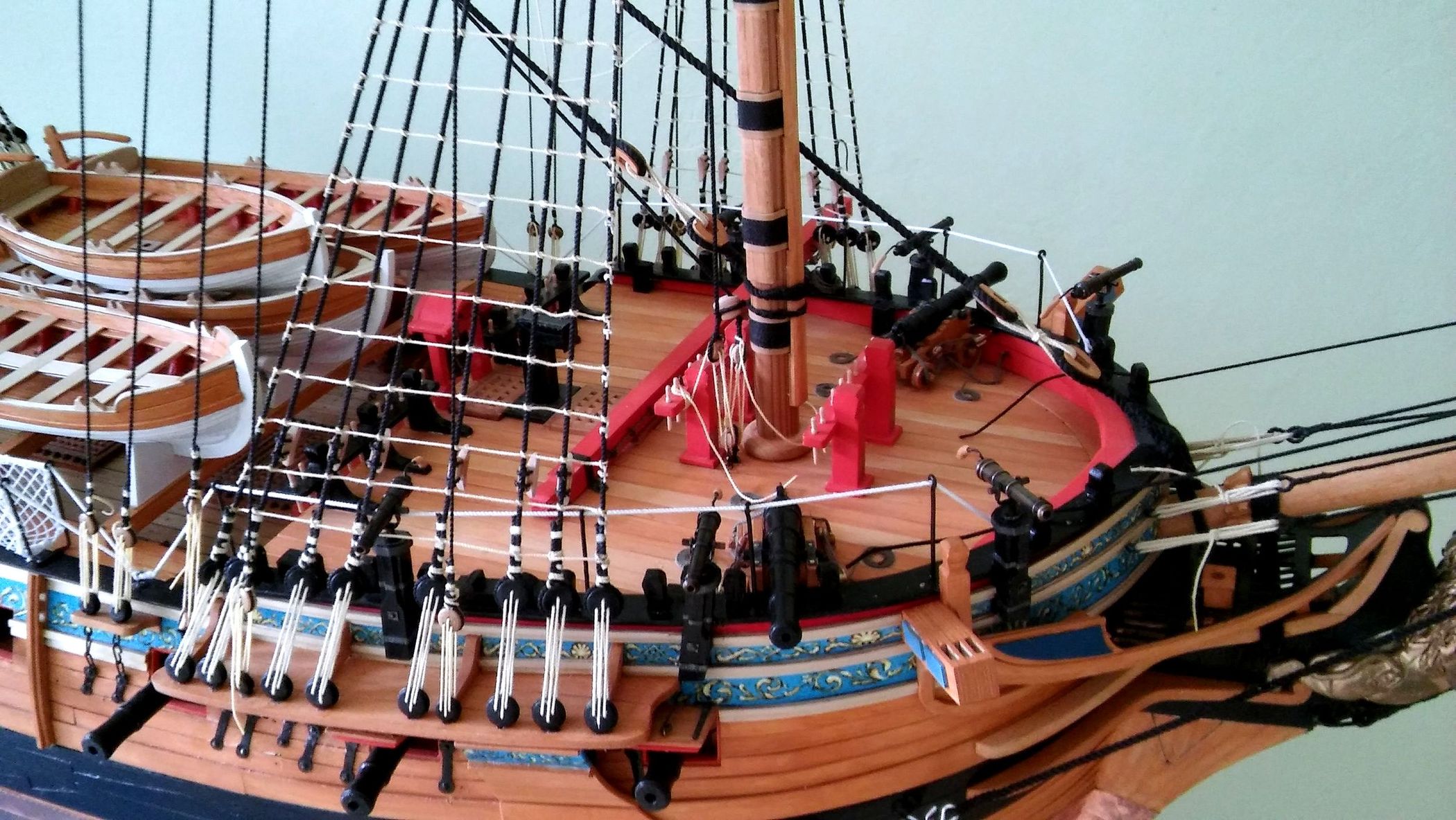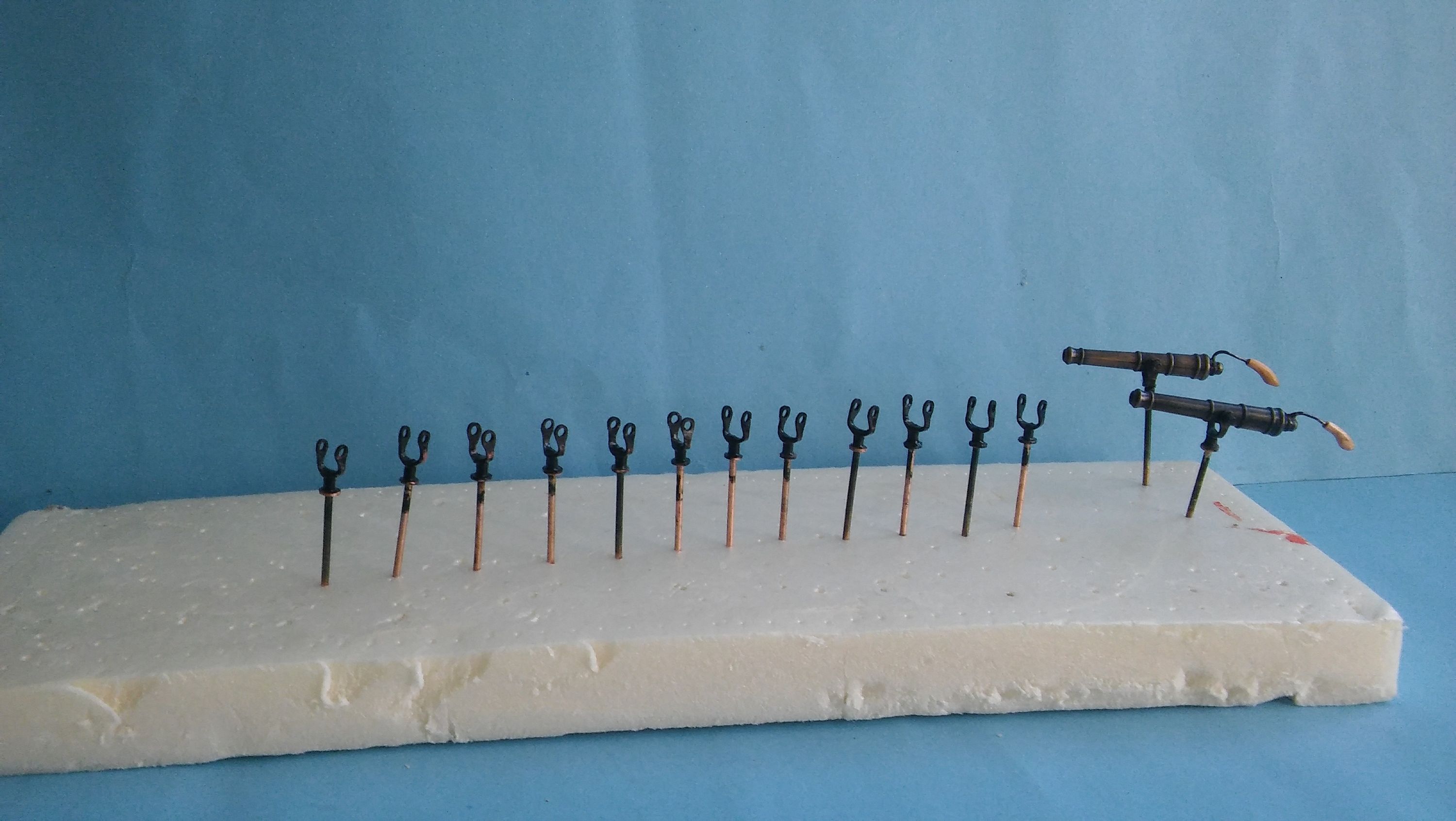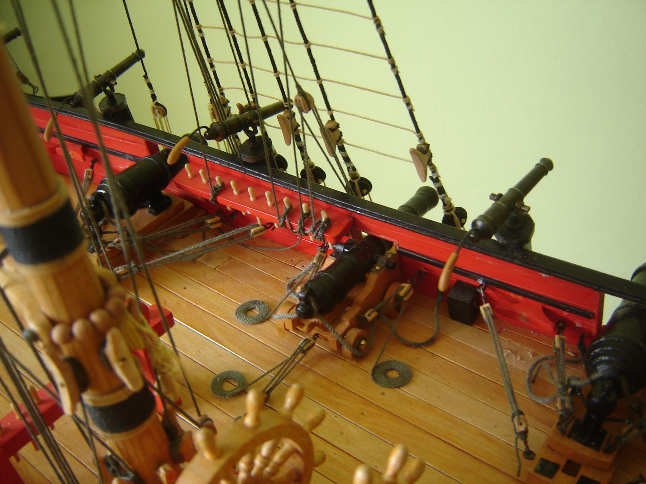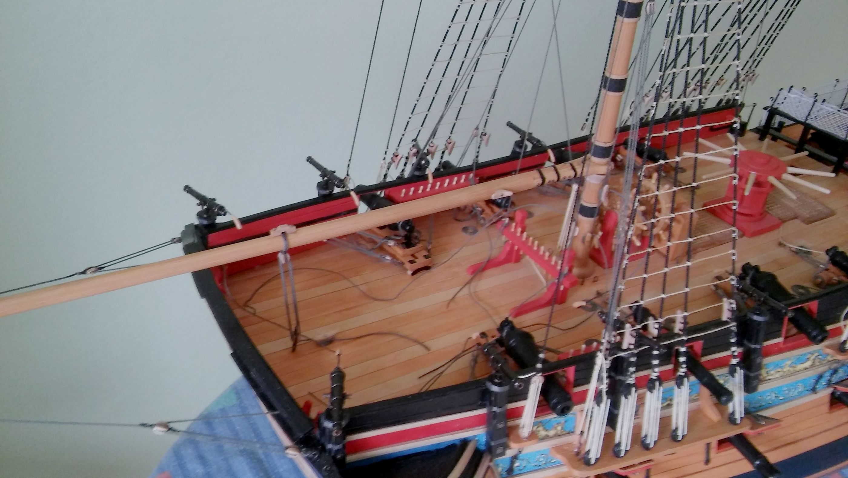 Nareszcie skończyłem wszystkie falkonety i zamontowałem je na modelu. Paluchy mnie już bolą od piłowania tych wszystkich pierdółek na jarzma. Następne chyba będą wiosła do szalup. Na razie studiuję albo raczej podglądam na Kodze sposoby ich wykonania. Zdjęcia nie bardzo mi wyszły bo ze względu na pogodę światło jest dzisiaj nie ciekawe a i fotograf ze mnie nie za bardzo.
