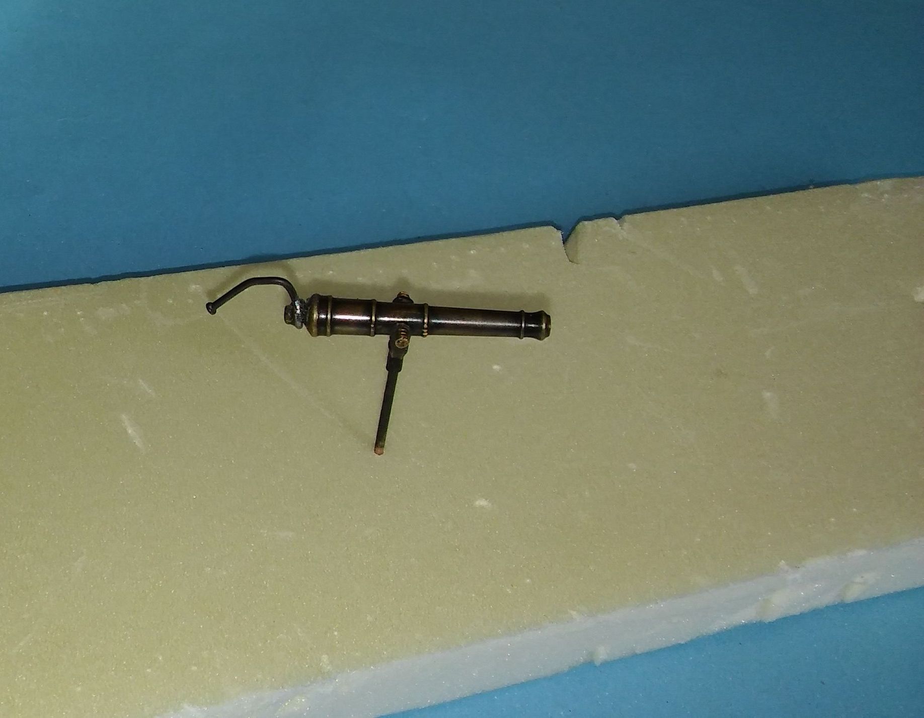 Takie ustrojstwo do cięcia rurek miedzianych kupiłem dawno temu w Castoramie za 5 zeta. Jak to robiłem to widać na zdjęciu. Otwory na czop falkonety mają 2 mm, natomiast otwór środkowy w jarzmie to 1,5 mm. Ten słupek, na którym osadzone jest jarzmo (czy jak to się tam nazywa) wykonałem z gwoździa miedzianego fi 1,5 mm.