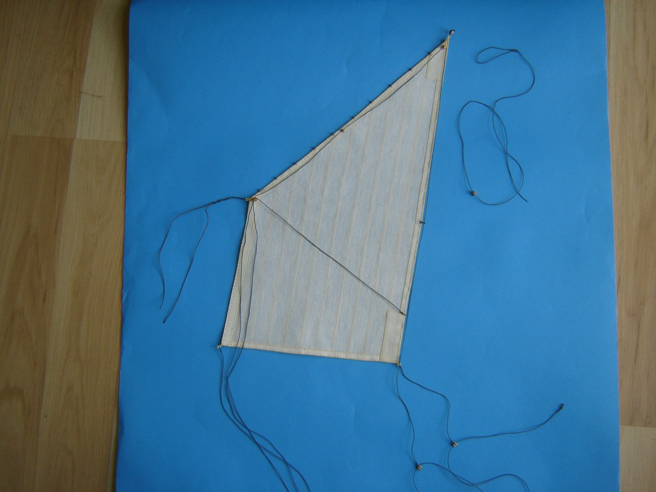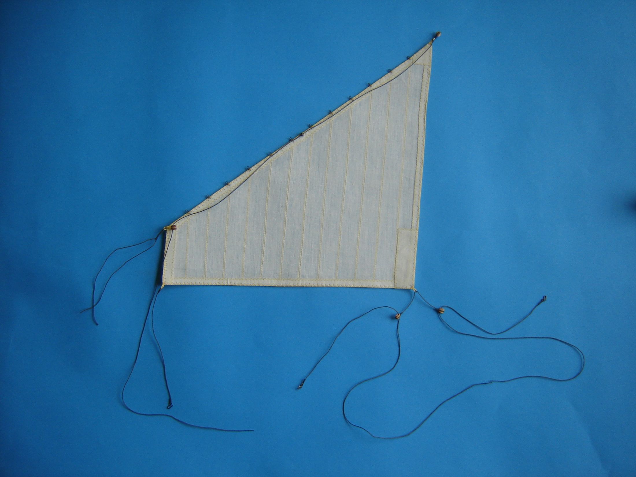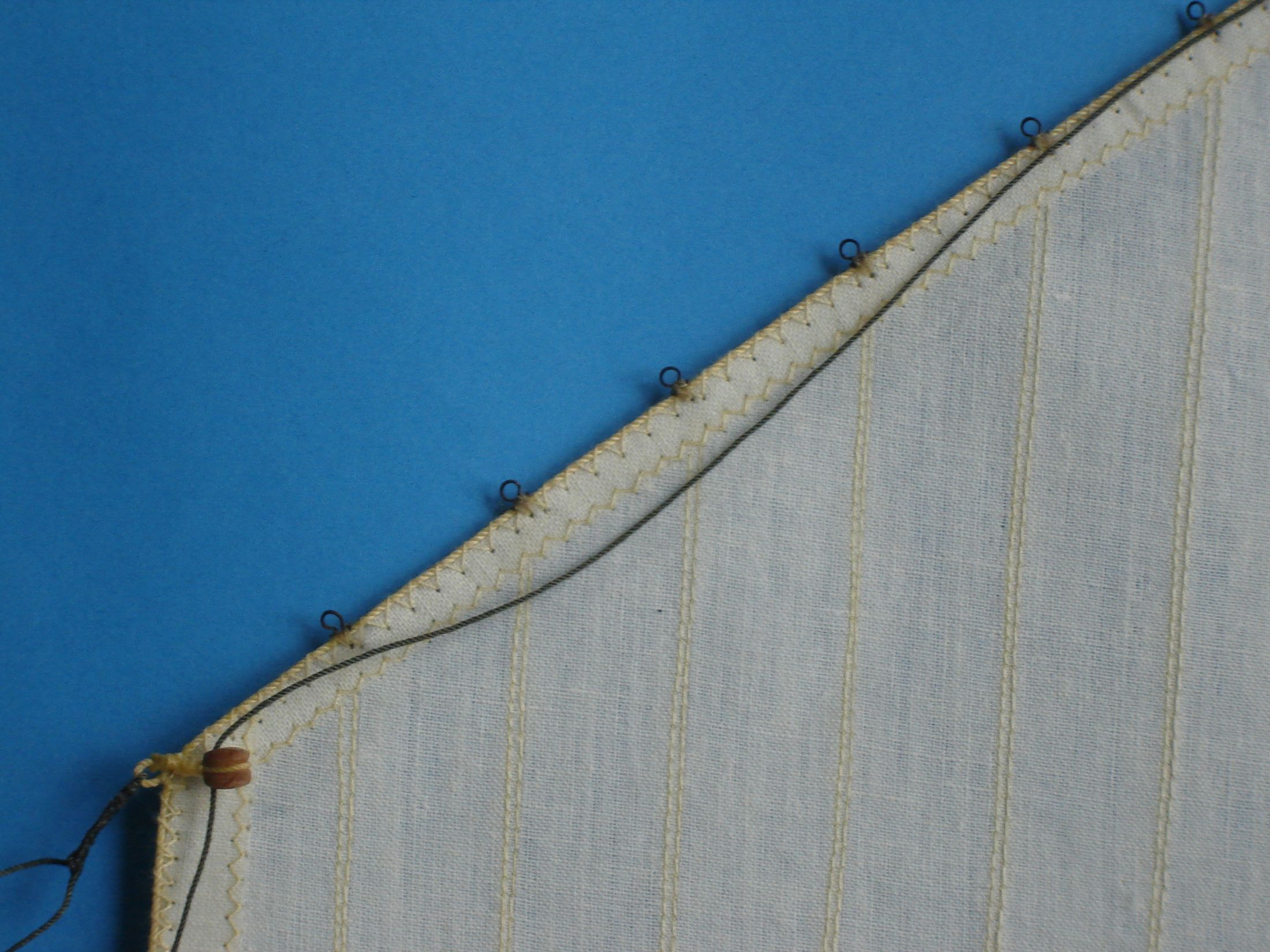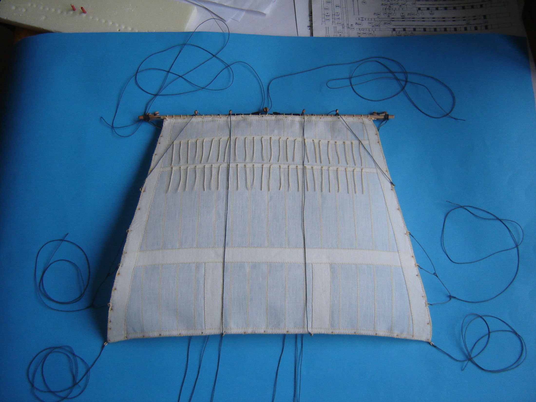 Dawno mnie nie było na Kodze. Nie mniej jednak coś tam grzebię przy modelu. Doszedłem do wniosku, że czas zacząć szyć żagle. W jednej z hurtowni w Wrocławiu zakupiłem 5 m kwadratowych płótna lnianego nie bielonego i postanowiłem z niego uszyć żagle. Odpadł problem moczenia w herbacie. Płótno zdekatyzowałem w gorącej wodzie, wysuszyłem i oddałem do magla. Następnie według szablonów wyciąłem wszystkie żagle. Zużyłem 4 metry kwadratowe płótna, reszta została na ewentualne poprawki. Początkowo żagle miała szyć żona, ale kiedy zacząłem ją krytykować, że ściegi nie są równe, żona zastrajkowała i powiedziała szyj sobie sam. Odciąłem kawałek materiału i spróbowałem szyć. Po kilkunastu minutach szycia stwierdziłem, że szycie na maszynie wcale nie jest takie trudne. Na załączonych zdjęciach pokażę moje pierwsze knoty.