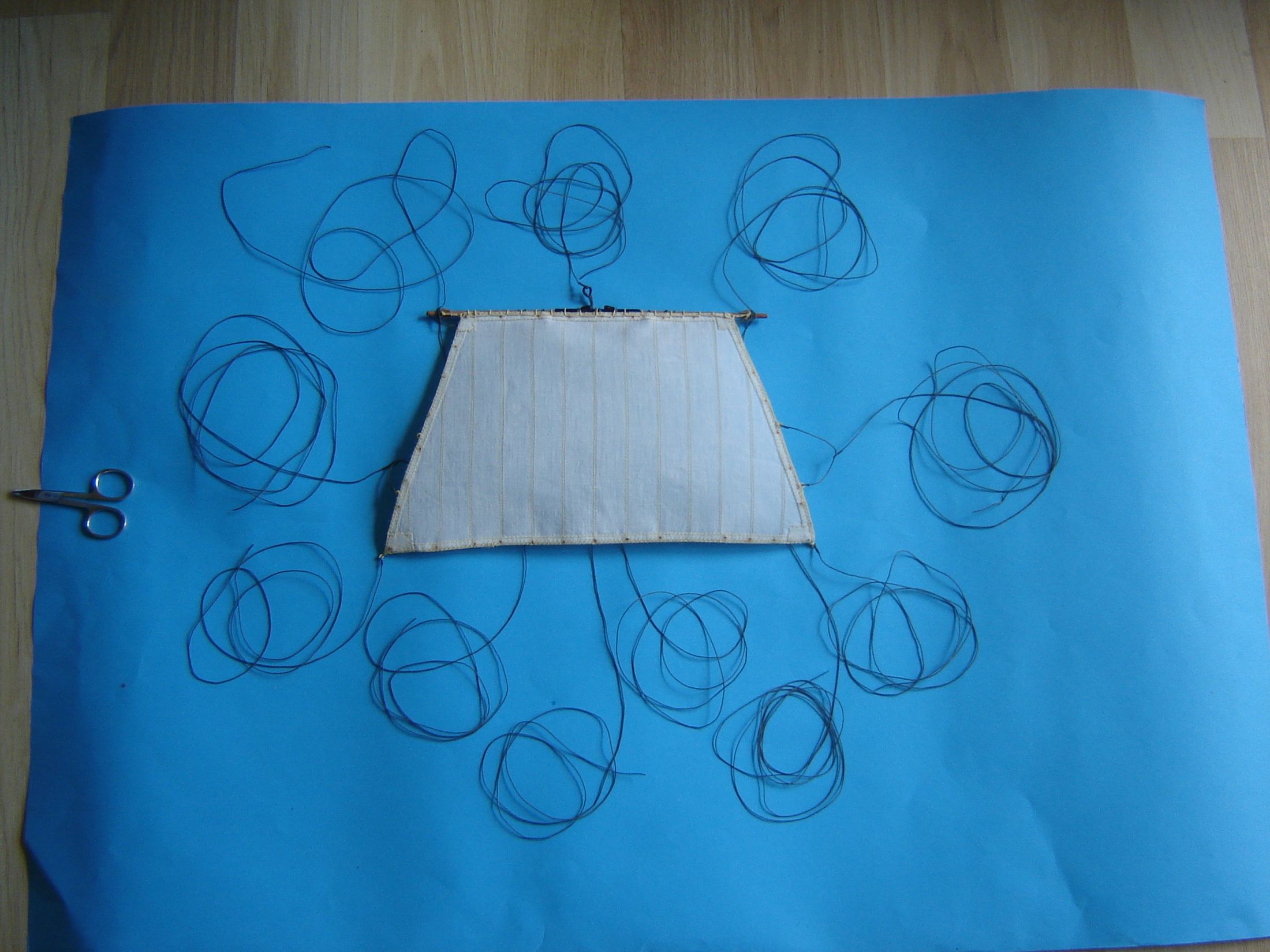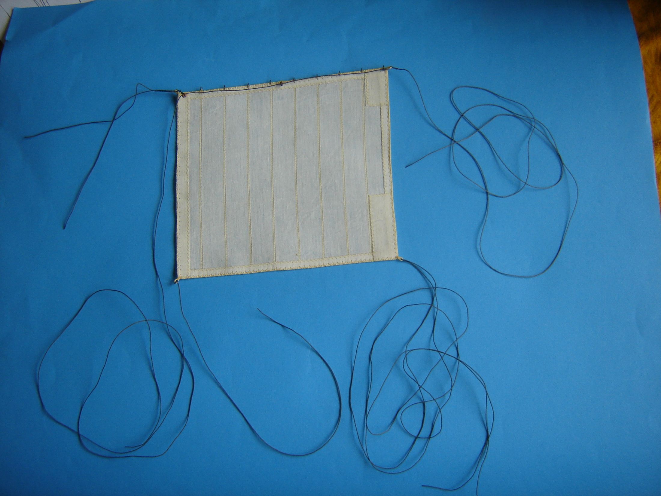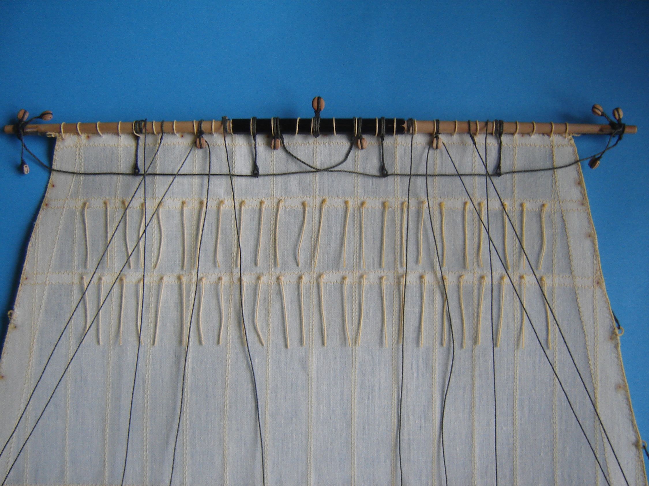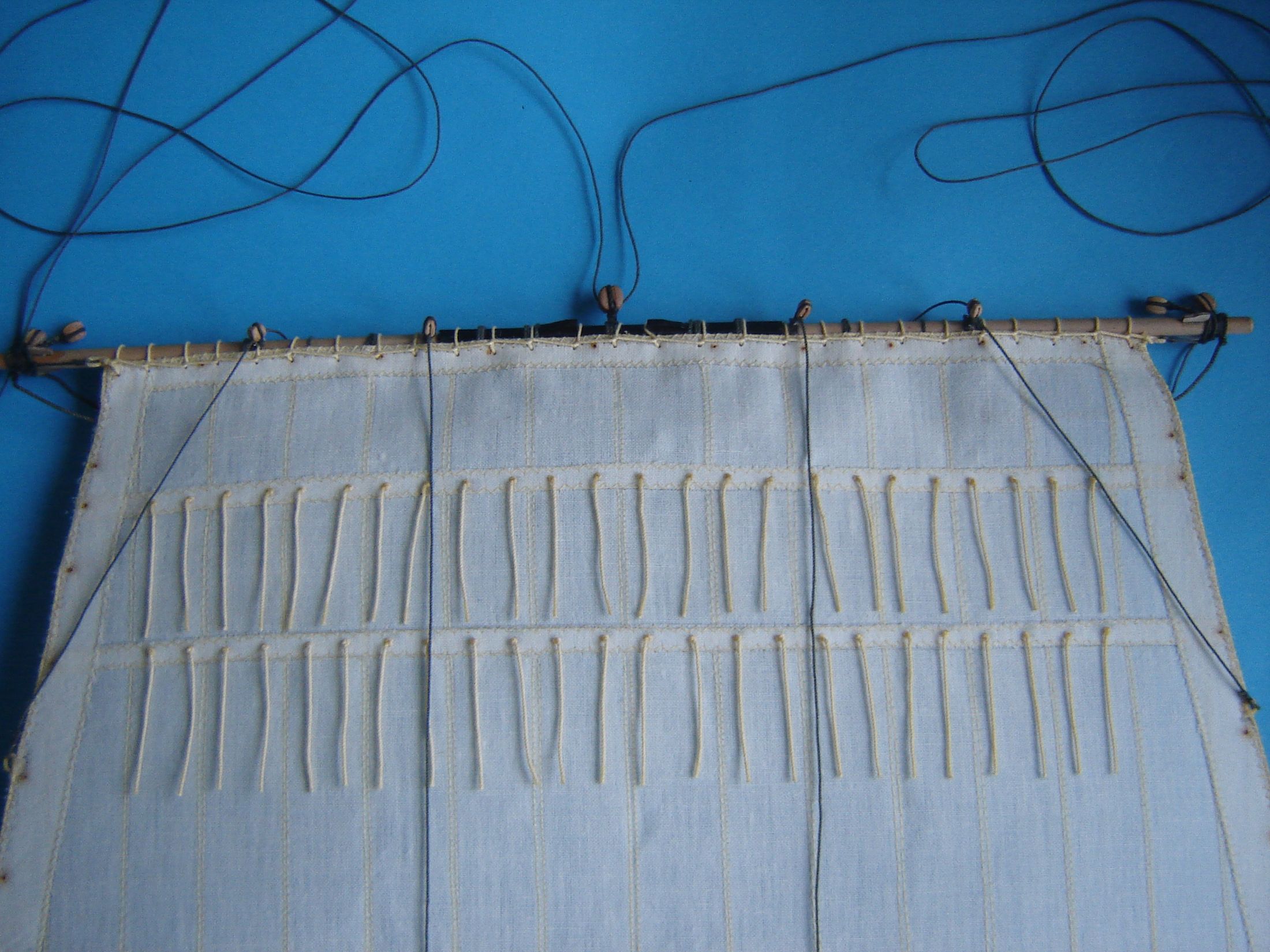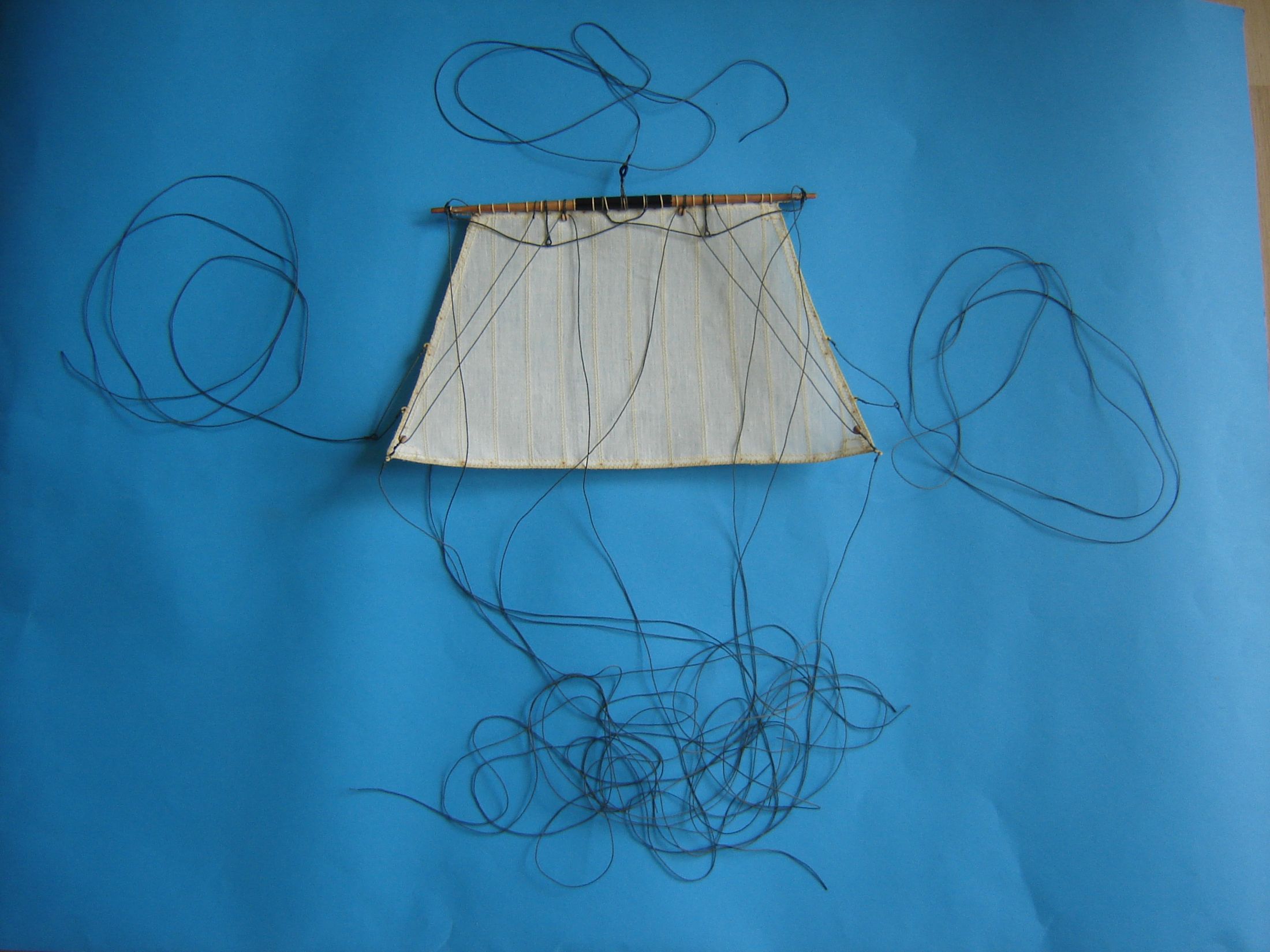 Dawno mnie nie było na Kodze. Nie mniej jednak coś tam grzebię przy modelu. Doszedłem do wniosku, że czas zacząć szyć żagle. W jednej z hurtowni w Wrocławiu zakupiłem 5 m kwadratowych płótna lnianego nie bielonego i postanowiłem z niego uszyć żagle. Odpadł problem moczenia w herbacie. Płótno zdekatyzowałem w gorącej wodzie, wysuszyłem i oddałem do magla. Następnie według szablonów wyciąłem wszystkie żagle. Zużyłem 4 metry kwadratowe płótna, reszta została na ewentualne poprawki. Początkowo żagle miała szyć żona, ale kiedy zacząłem ją krytykować, że ściegi nie są równe, żona zastrajkowała i powiedziała szyj sobie sam. Odciąłem kawałek materiału i spróbowałem szyć. Po kilkunastu minutach szycia stwierdziłem, że szycie na maszynie wcale nie jest takie trudne. Na załączonych zdjęciach pokażę moje pierwsze knoty.