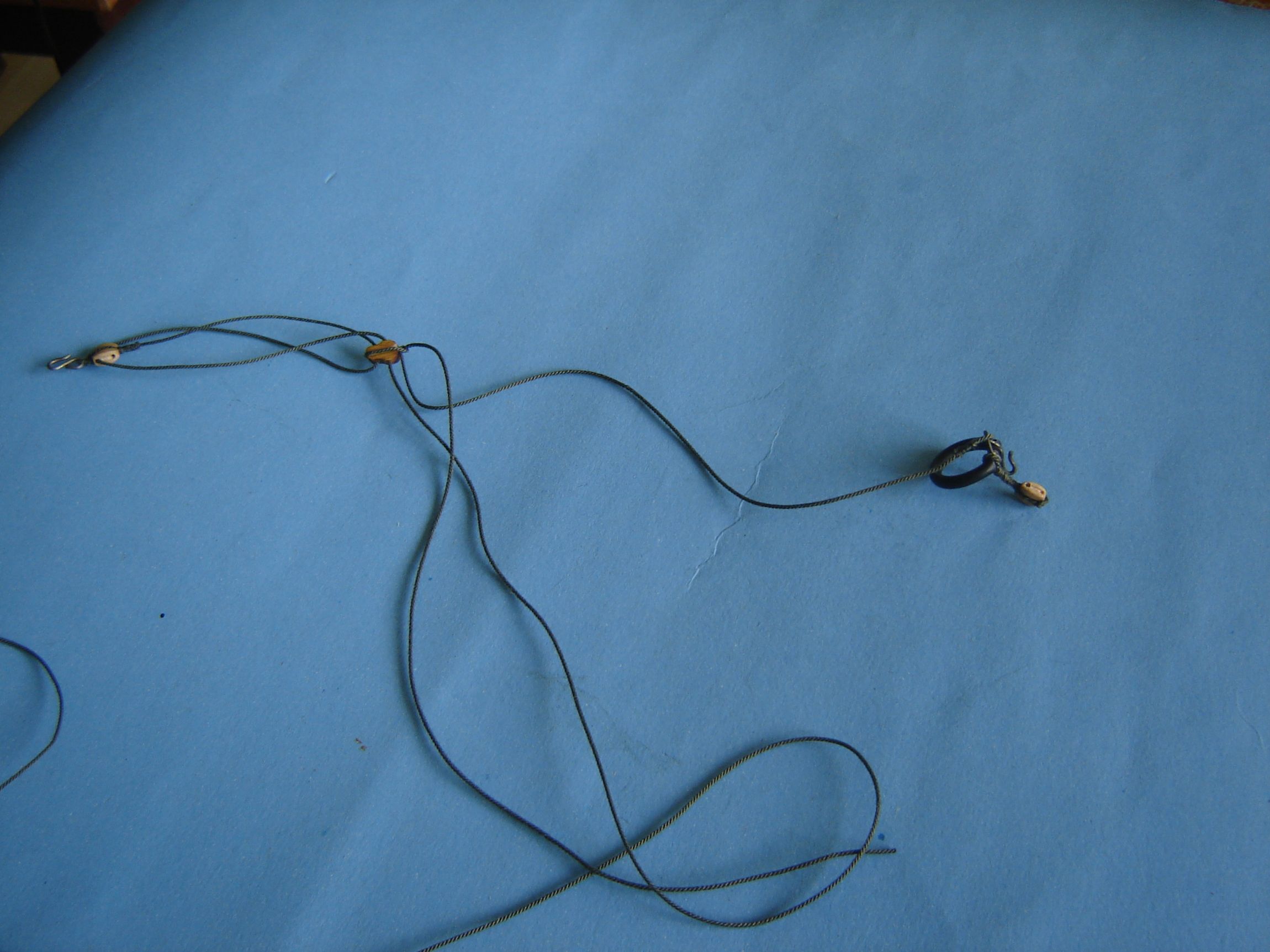 Przygotowałem też linki do podwieszenia największych kotwic na kotbelkach i zaopatrzyłem je w oczka i haczyki. Linka to ta sama linka z której wykonałem liklinki do żagli. Bloczki to bloczki 10 mm. Nie miałem potrójnych bloczków, więc odpowiednio zeszlifowałem i skleiłem razem bloczek pojedynczy i podwójny. Do bloczków zamontowałem okucia z hakami.