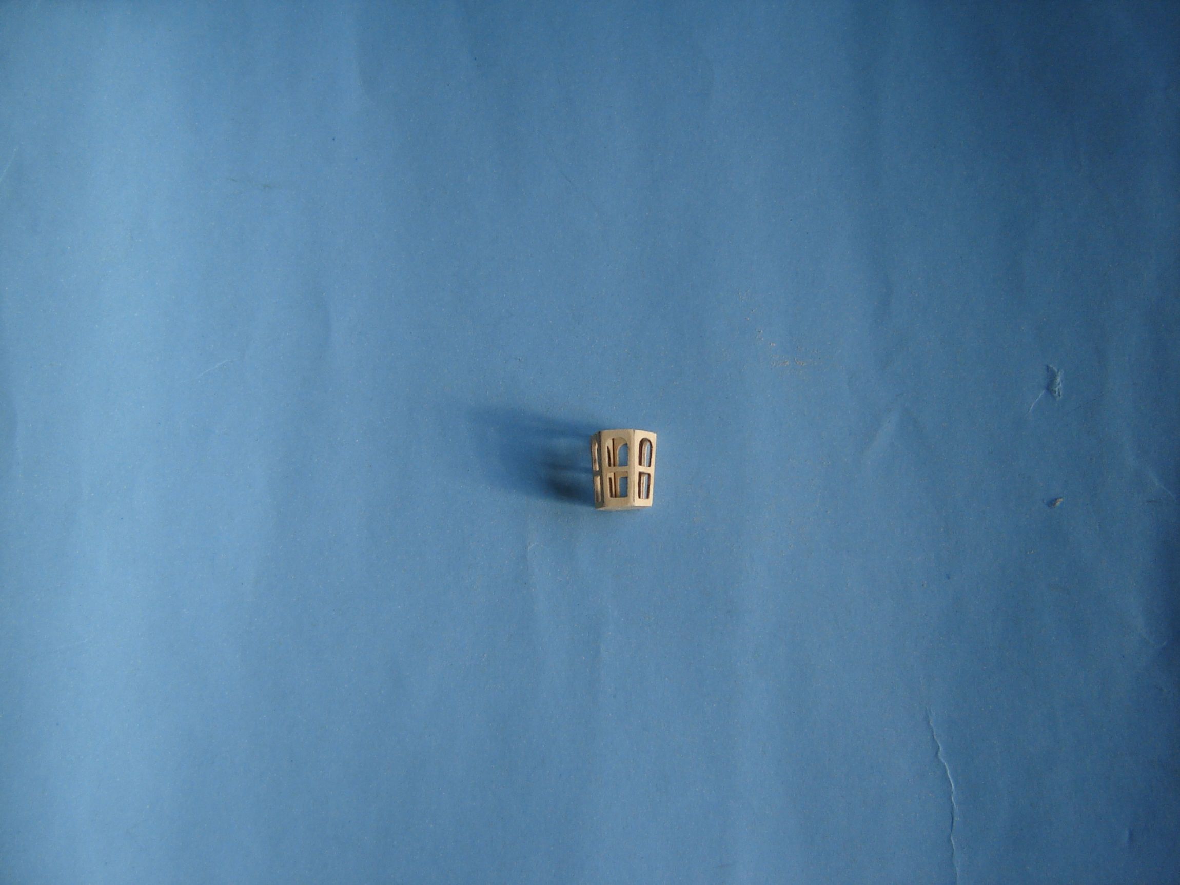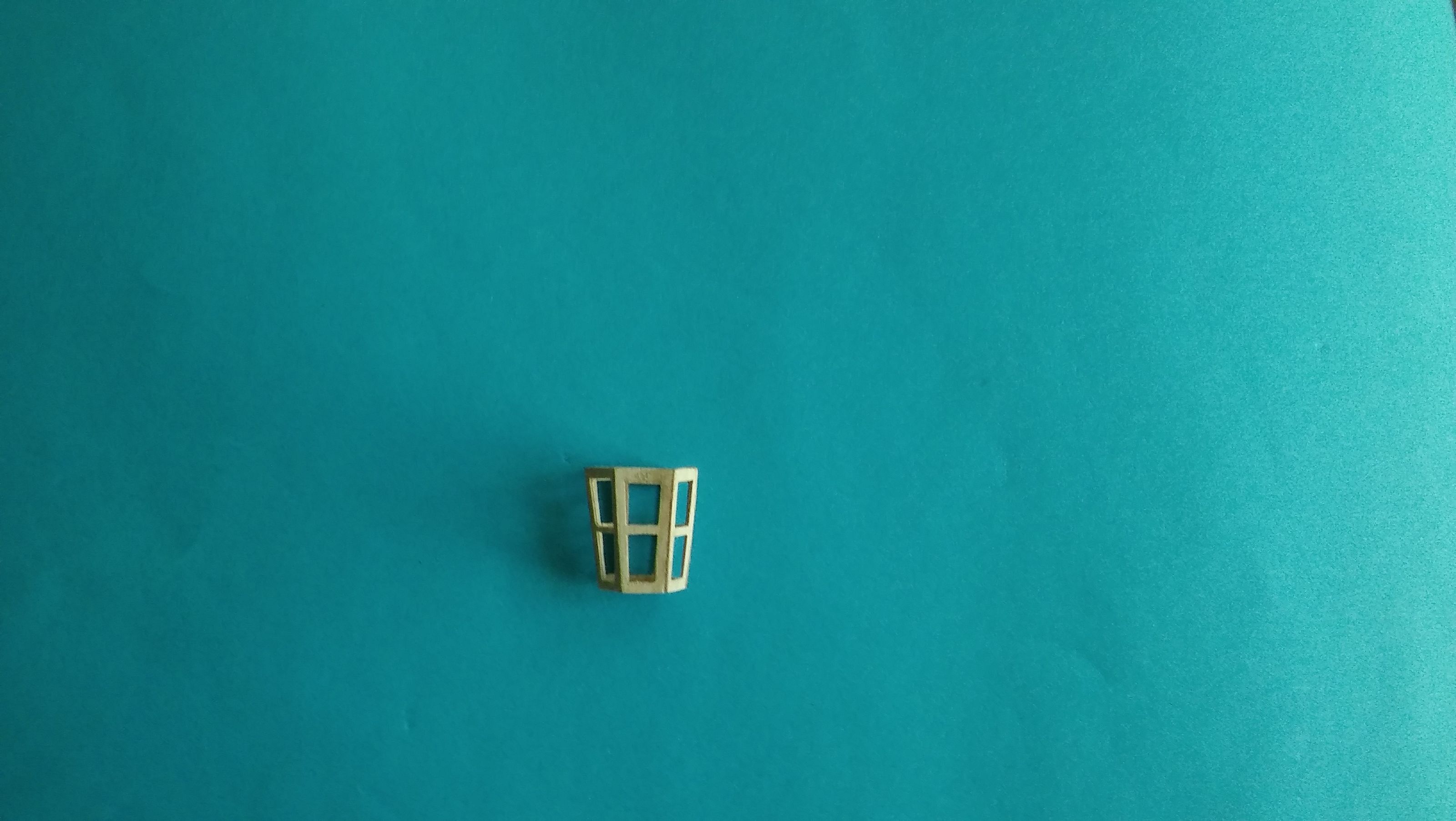 Przy pomocy szablonu wyciąłem wszystkie ścianki korpusu lampy. Okienka wyciąłem skalpelem i delikatnie dopiłowałem iglakami. Sklejkę tej grubości doskonale tnie się ostrymi nożyczkami i to zarówno wzdłuż jak i w poprzek słojów, zupełnie jak grubszy papier. Ścianki delikatnie przeszlifowałem z obydwu stron na papierze ściernym i tym sposobem zmniejszyłem ich grubość do około 0,4 mm.