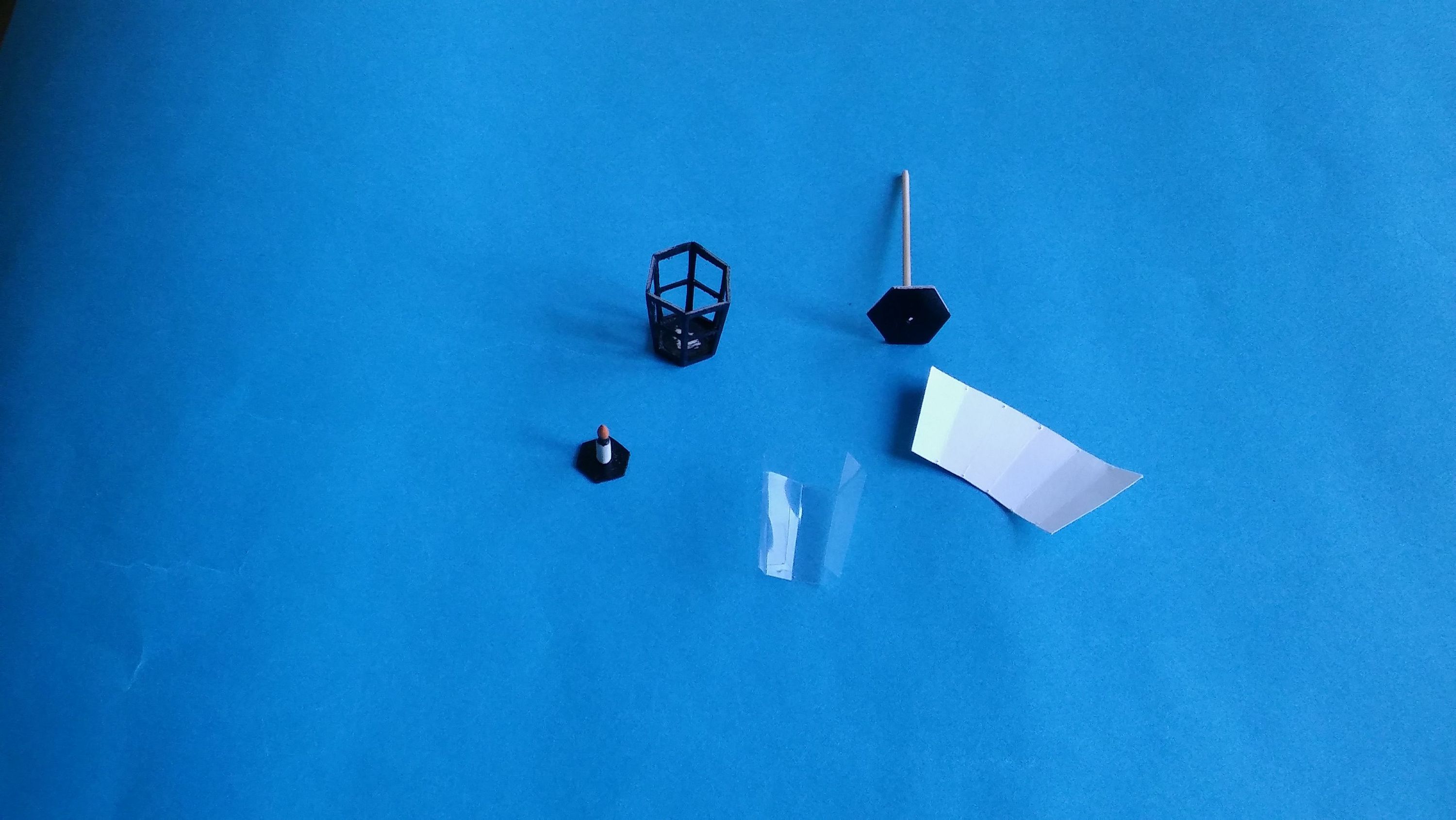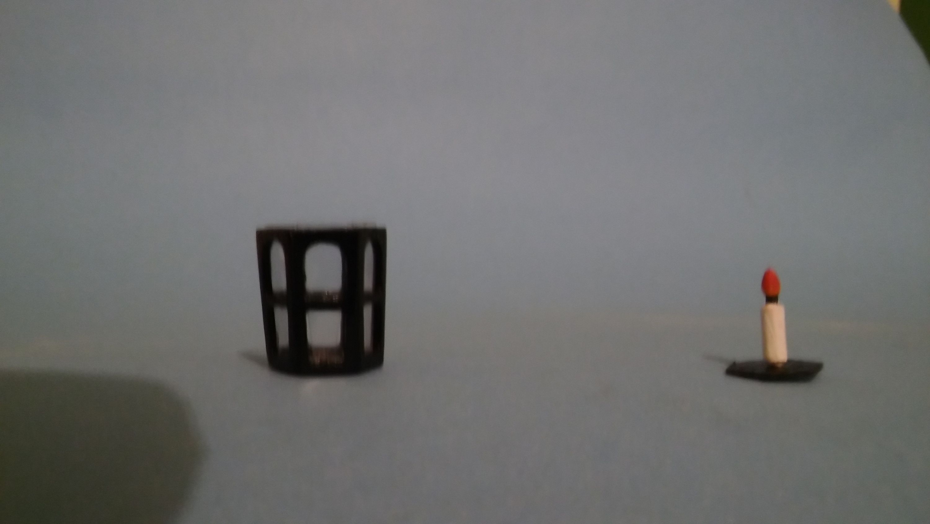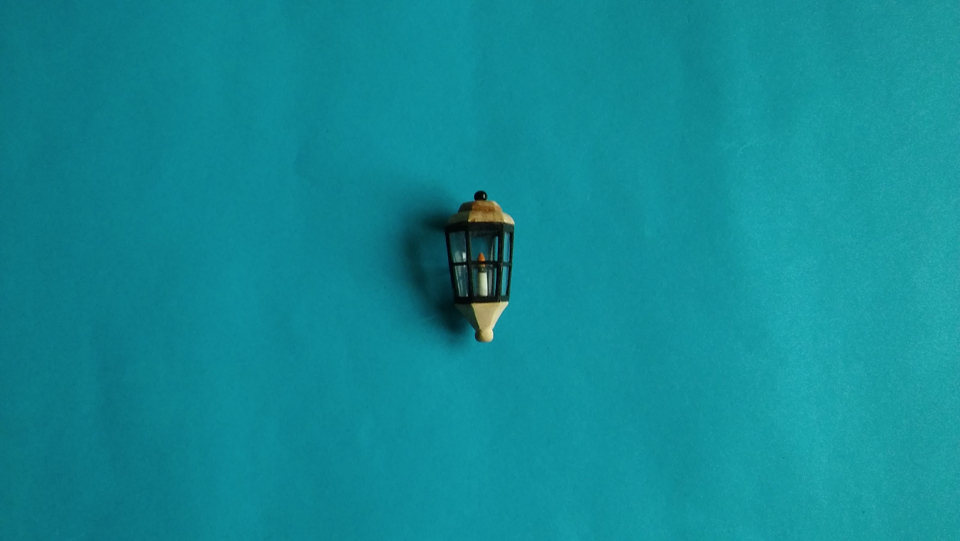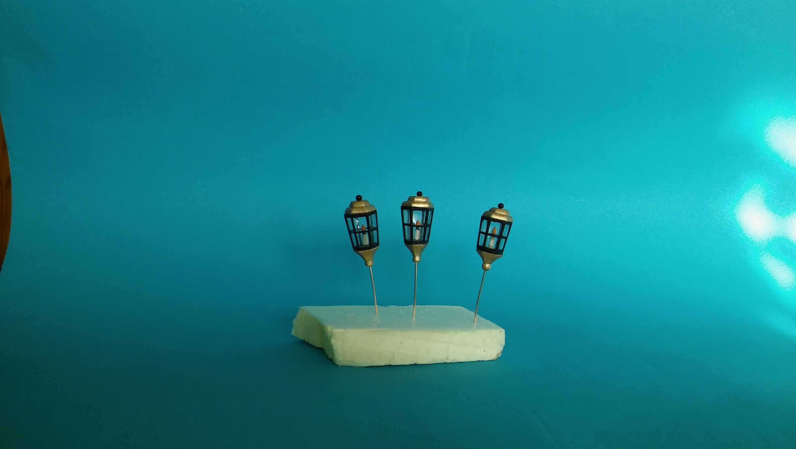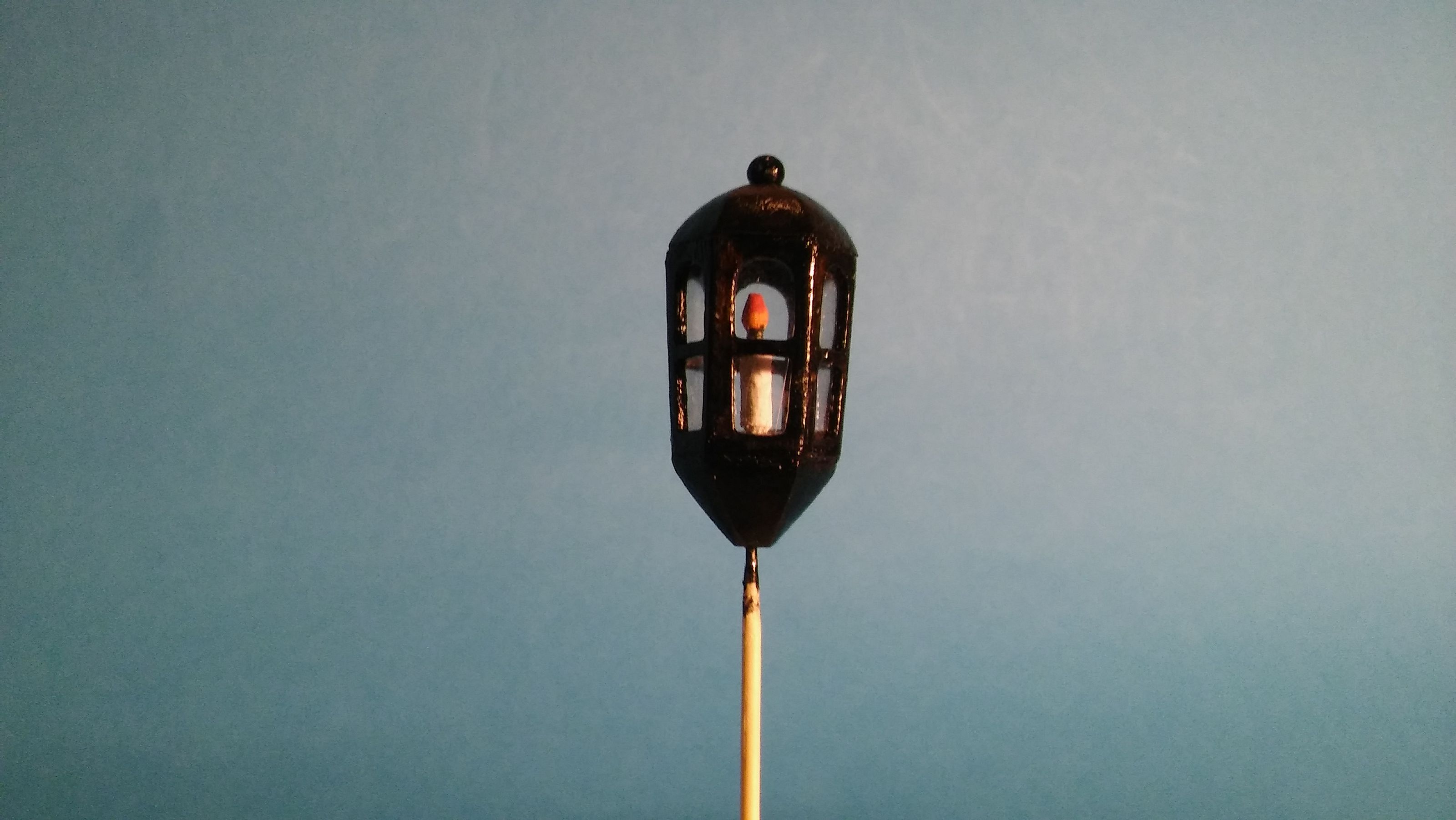 Szkiełka lamp wykonałem z grubej przezroczystej folii dorobiłem świecę. Świecę wkleiłem na spód lampy i całość od góry zamknąłem odpowiednim sześciokątem. Wcześniej korpus pomalowałem czarnym akrylem.
