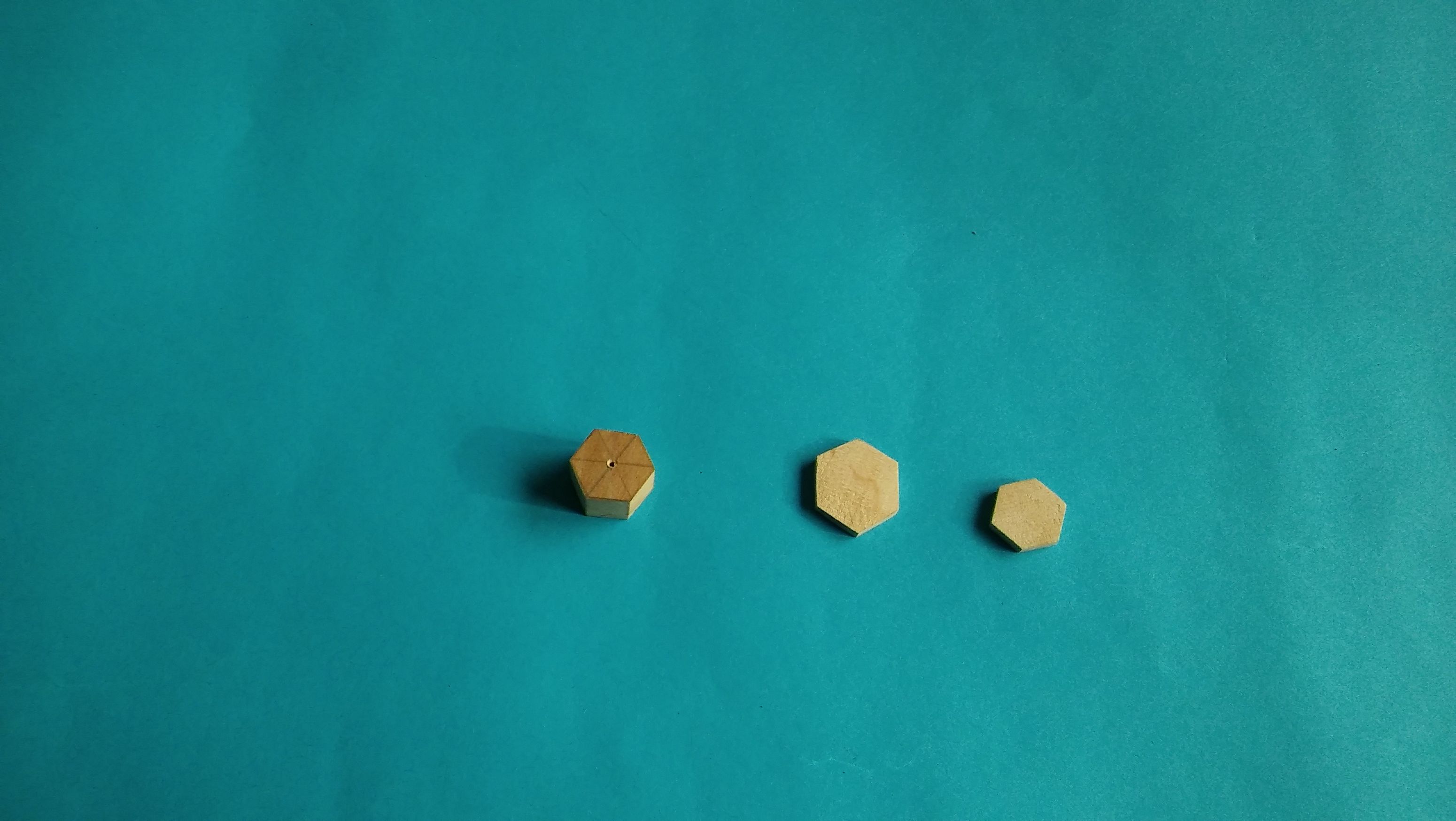 Następnie przygotowałem elementy na podstawę i „czapę” lampy. Na podstawę wyciąłem sześciokąt z listewki gruszy o grubości 10 mm. Wywierciłem na wylot wiertłem 0,7 mm otwór. Ułatwiło mi to szlifowanie boków i jednocześnie posłuży mi on do zamontowania wspornika lampy. Dwa sześciokąty na czapę lampy wyciąłem również z listewki z gruszy o grubości 3 mm.