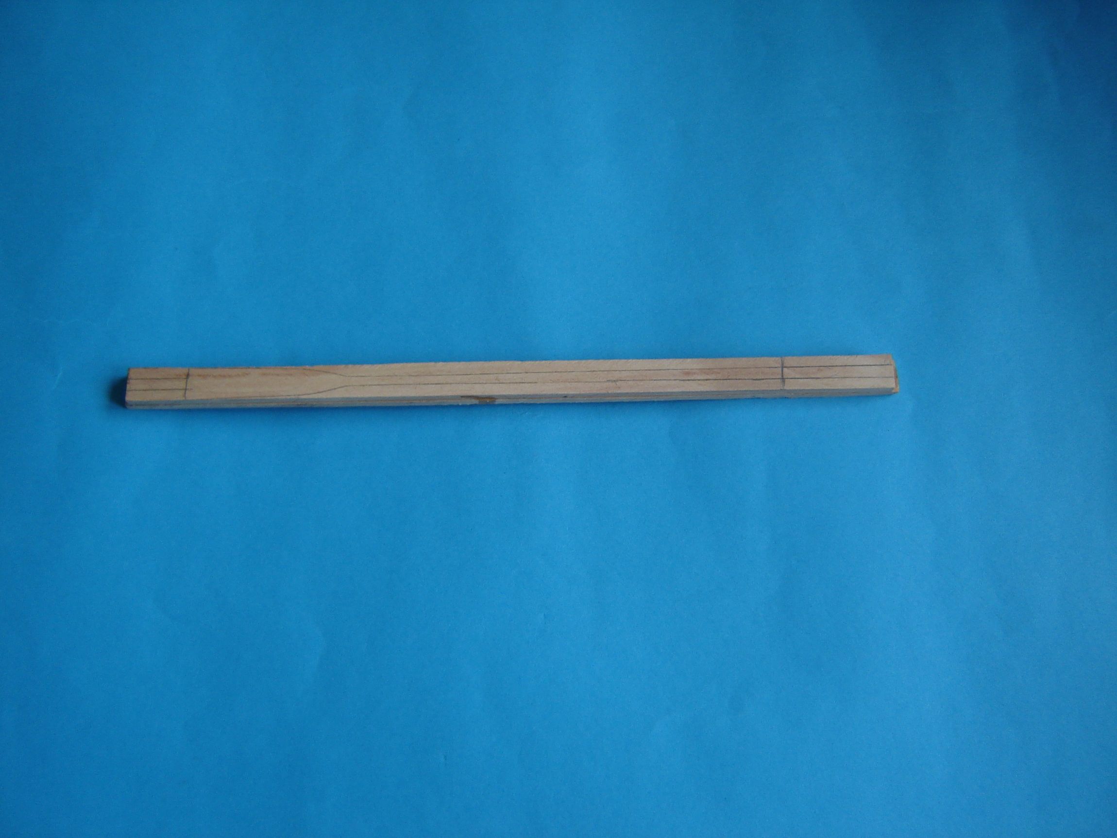 Następnie wyciąłem z gruszy listewki o wymiarach 25 cm na 12 mm i grubości 3,5 mm. Według szablonu narysowałem na listewkach kształt przyszłego wiosła.