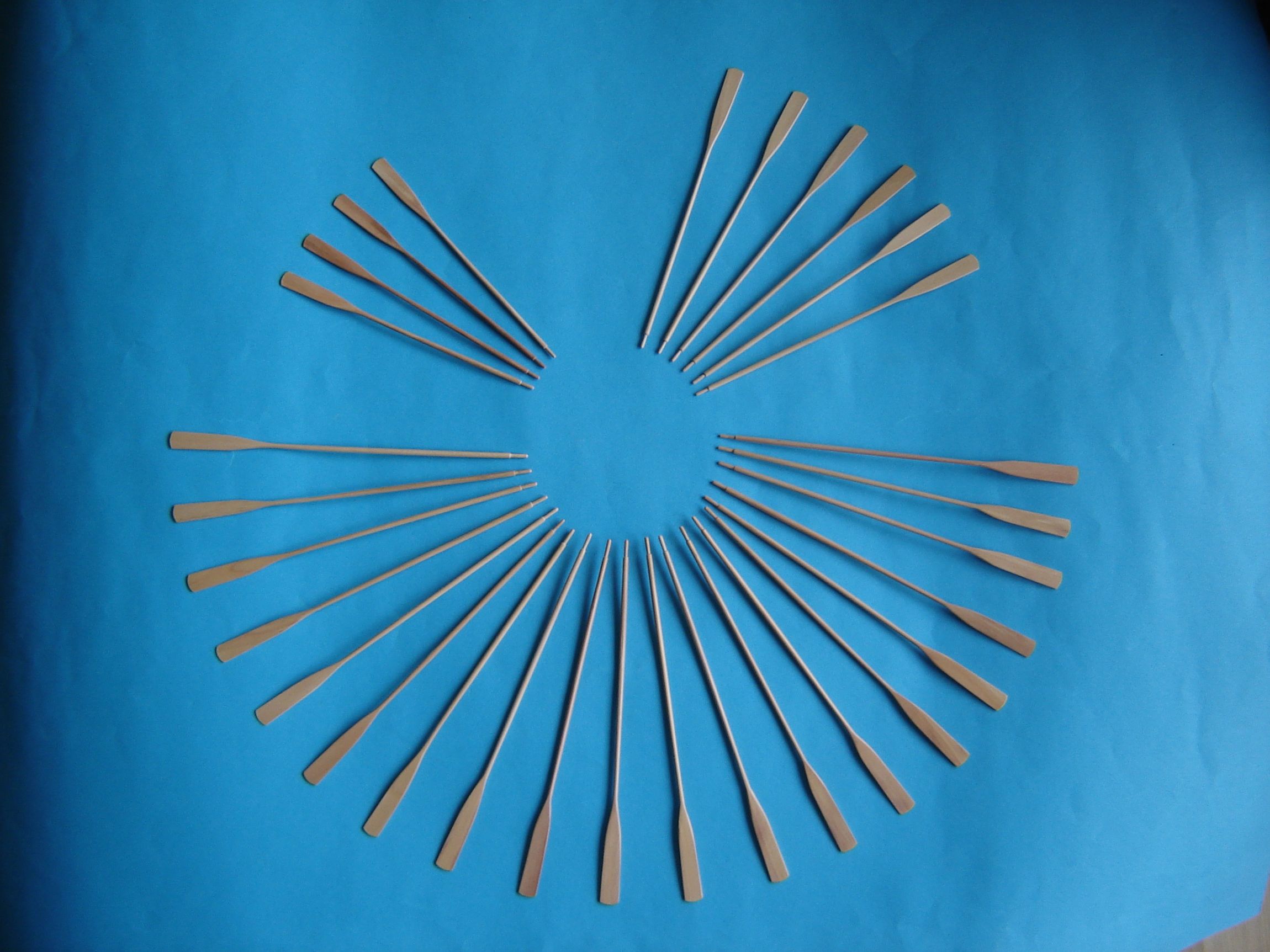 Wszystkie 30 wioseł na gotowo. Do dwóch największych szalup wiosła mają długość 19 cm. Do szalupy średniej 6 wioseł 17 cm i do najmniejszego bączka 4 wiosła 15 cm długości.