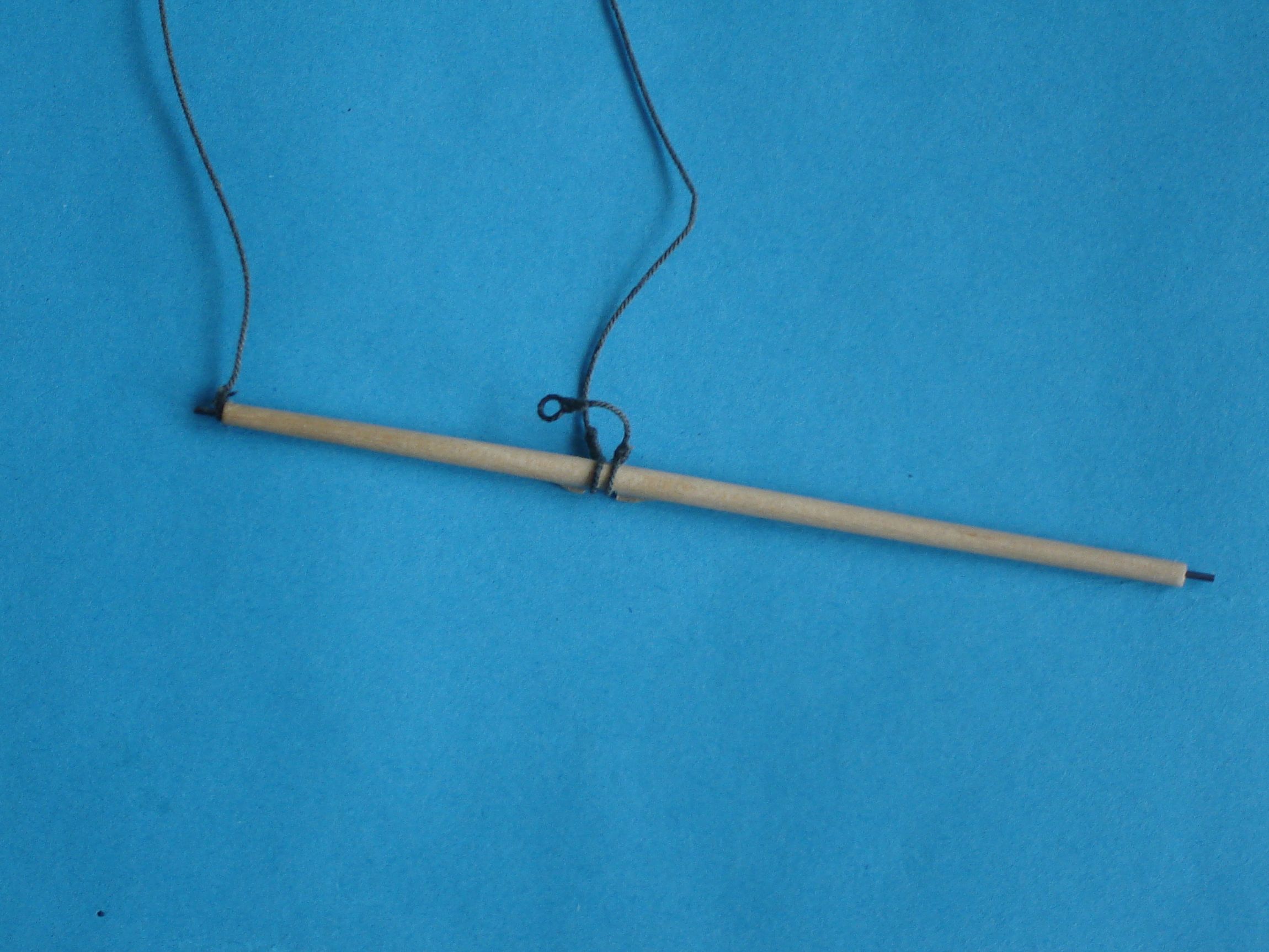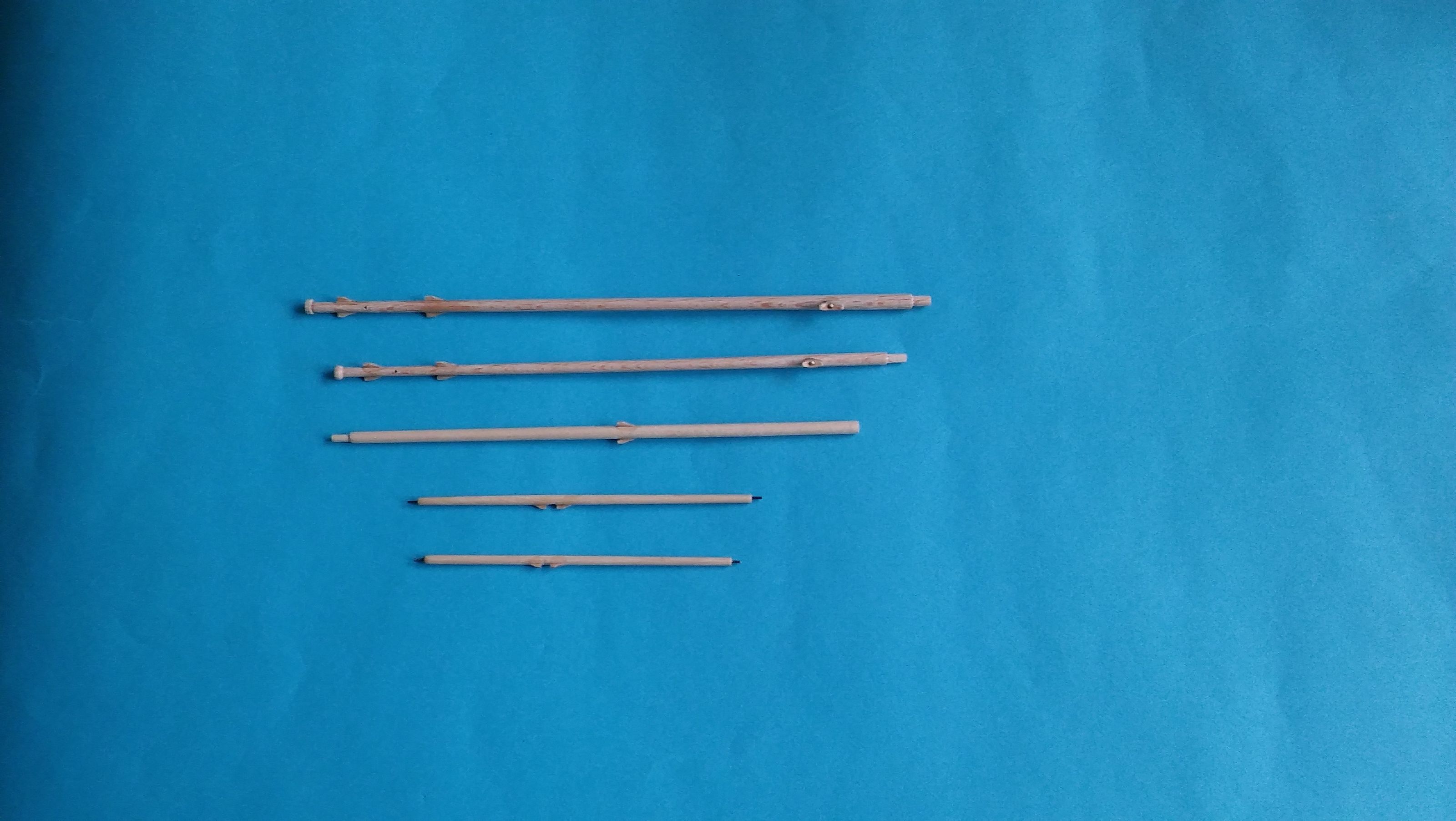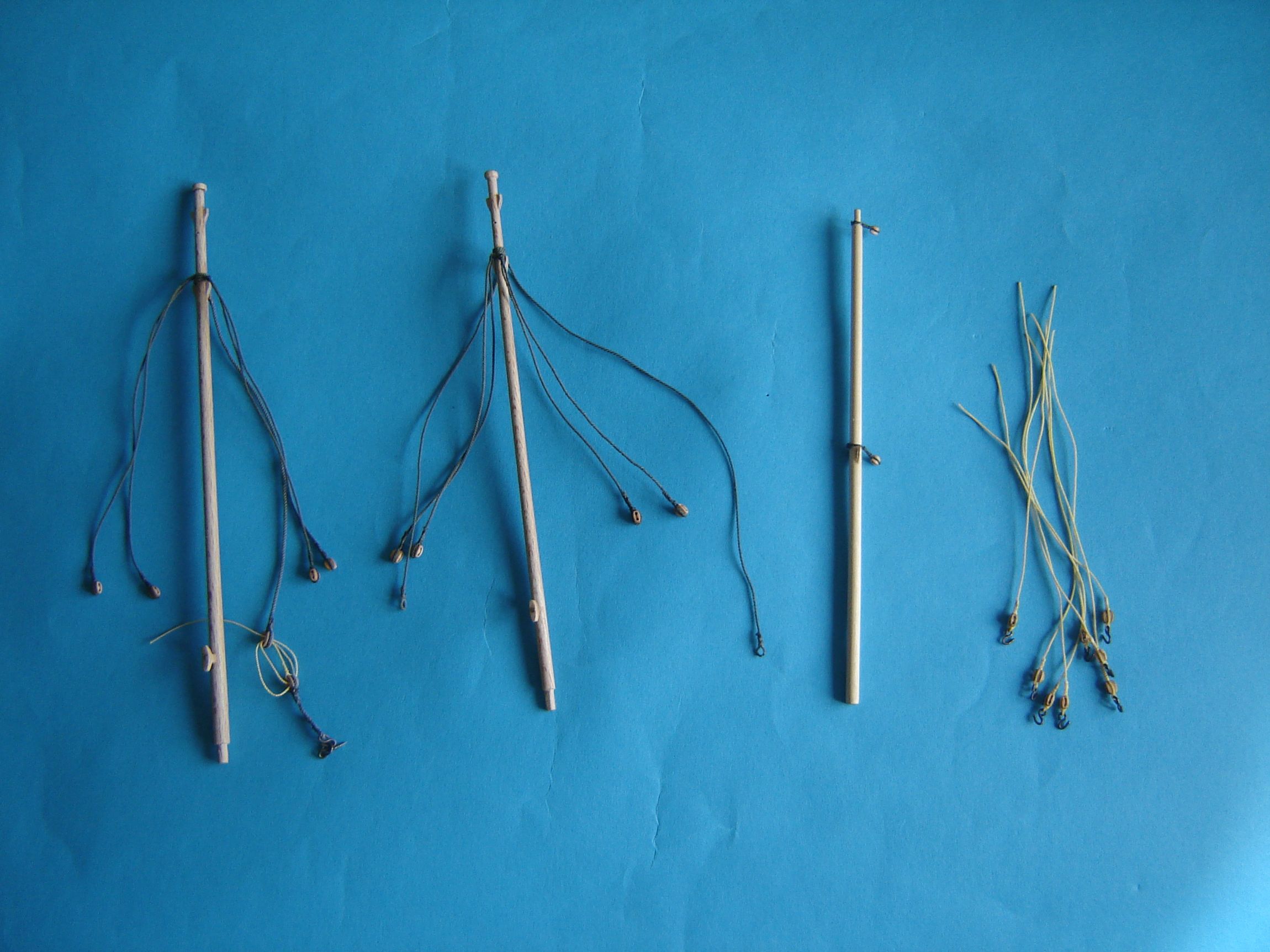 Wystrugałem też maszty, bukszpryt i reje. Maszty są z buka a reje i bukszpryt z jesiona. Zamontowałem na nich wsporniki (cleat) i knagi. Knagi mają 6 mm długości a najmniejsze wsporniki 4mm długości i 1 mm grubości. Podziwiam szczerze wszystkich, którzy takie maleńkie duperele montują na swoich modelach. Nie miałem ani ochoty ani cierpliwości na to by w topie masztu o średnicy 3 mm montować rolkę, ograniczyłem się więc do wywiercenie otworu 0,7 mm. Ja już więcej takich małych duperelek nie będę montował na żadnym swoim modelu.