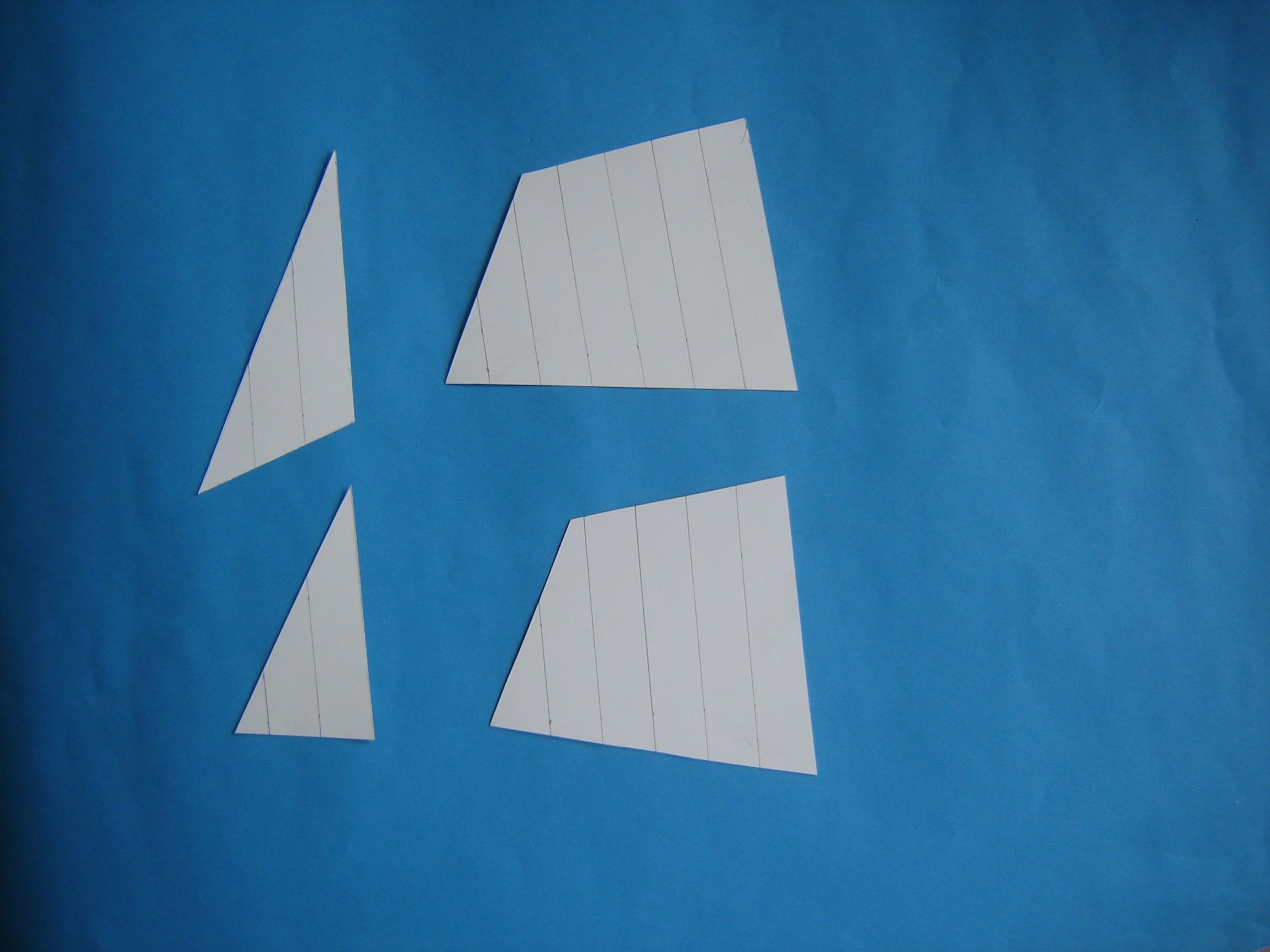 Uszyłem żagle do mojej szalupy. Nie mam żadnych planów żagli więc musiałem trochę improwizować. Najpierw przygotowałem szablony żagli. Wzorowałem się na rysunkach i na zasadzie przytnij i przymierz dopasowałem wycięte z brystolu szablony żagli do takielunku mojej szalupki. Na szablonach żagli wyrysowałem bryty. Szerokość brytów jest taka sama jak na żaglach Enterpriza czyli 20 mm. Jest to ta sama skala więc bryty mają taką samą szerokość.