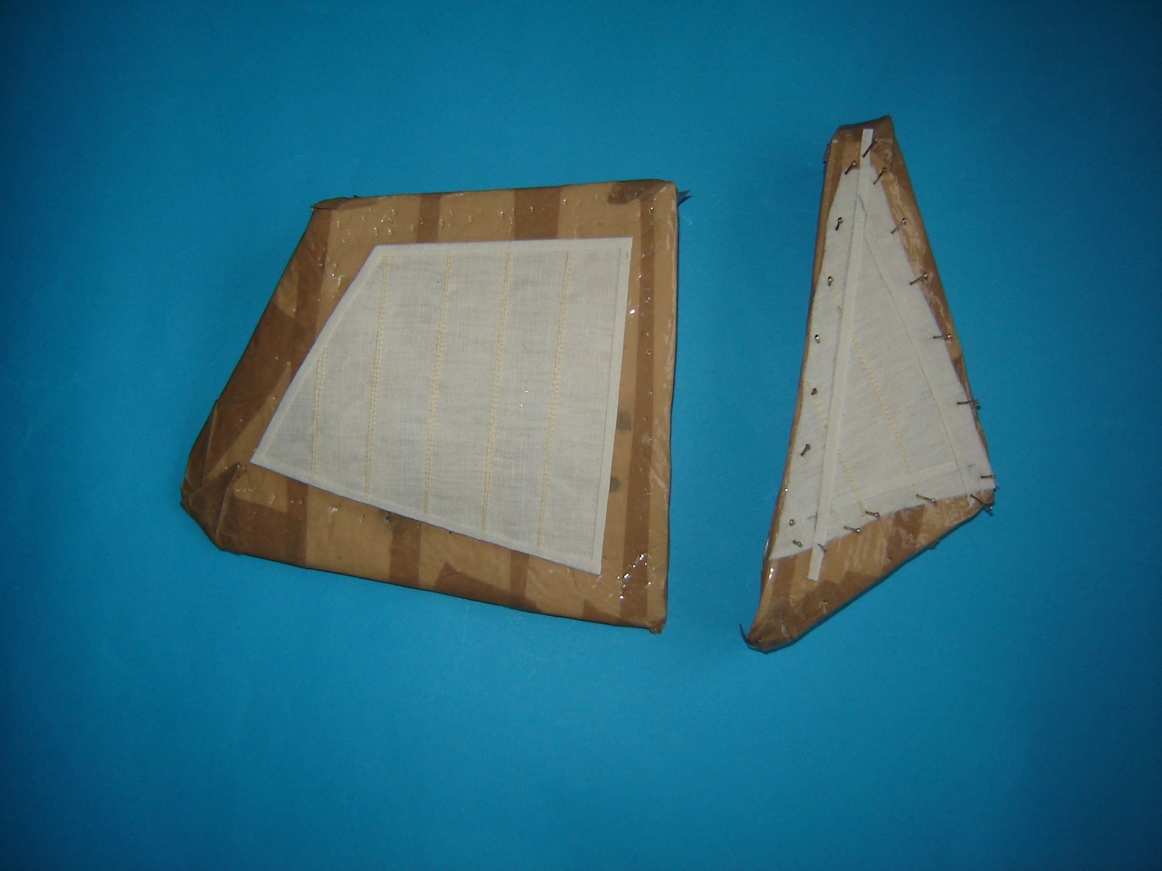 Przygotowałem formy ze styropianu okleiłem taśmą, przypiąłem żagielki i przesmarowałem je rozcieńczonym rakollem GXL-3. Na tym samym kleju nakleiłem wzmocnienia żagli.