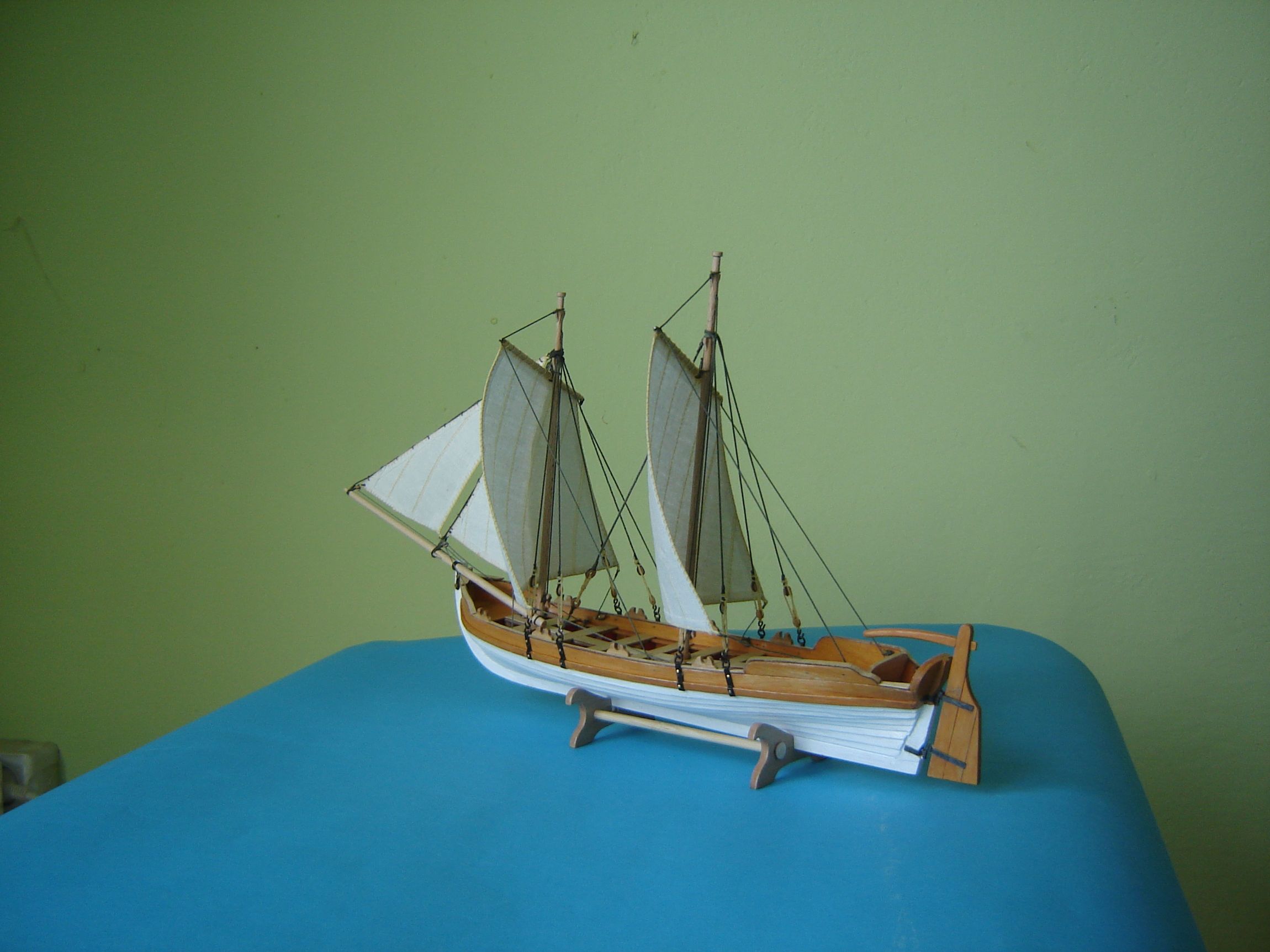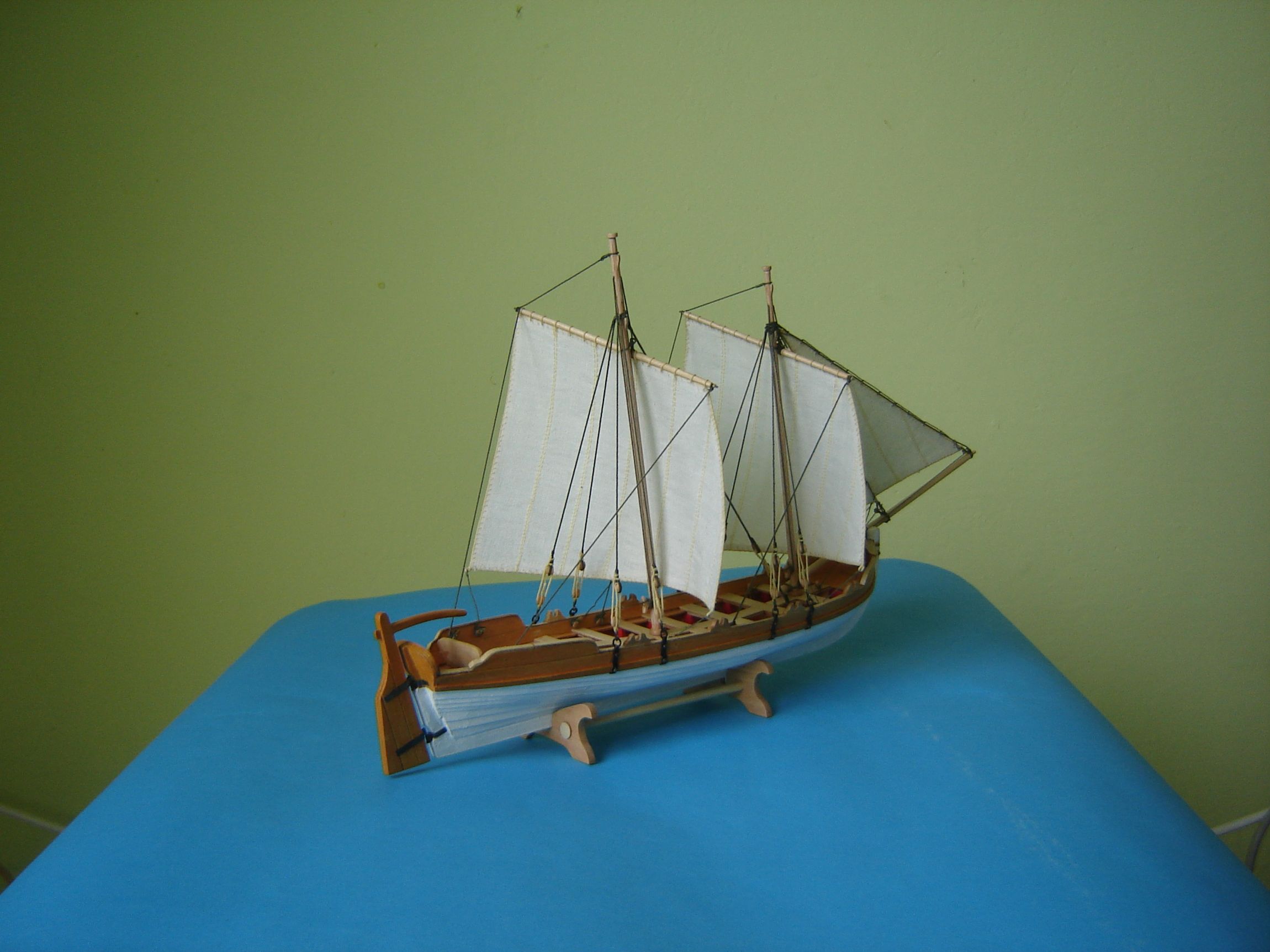Założyłem żagle na moją łódeczkę. Jeszce chyba dorobię jakąś kotwiczkę, założę wiosła i koniec z maluchami. Jedyną dobrą stroną przy budowie małego modelu jest chyba to, że jak potrzebujesz coś zamontować na przeciwnej burcie to nie musisz go obchodzić wkoło. Możesz go spokojnie obracać a nawet trzymać na kolanach. Żagle przymocowałem ściegiem łańcuszkowym.