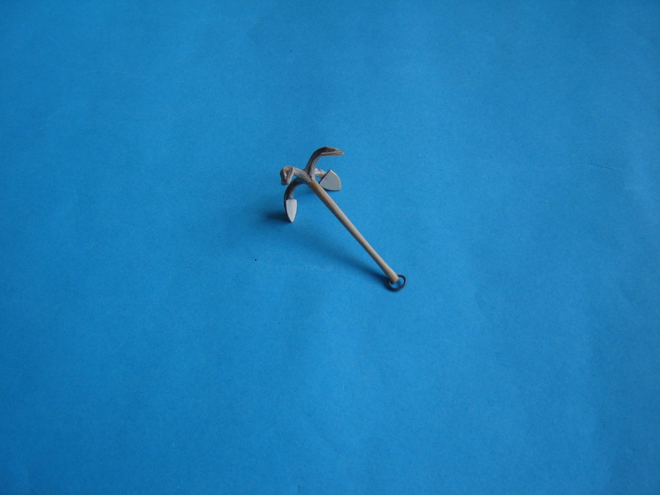 Wiosna ma to do siebie, że człowieka ogarnia lenistwo, a spotkania z naturą przyciągają bardziej niż modelowanie. Coś tam jednak w końcu zacząłem dłubać. Zrobiłem kotwiczkę do szalupy. Początkowo próbowałem od gapić kotwiczkę od Piotrka. Ramiona kotwiczki wykonałem z drutu miedzianego 1,5 mm . Przylutowałem do nich pazury kotwicy.