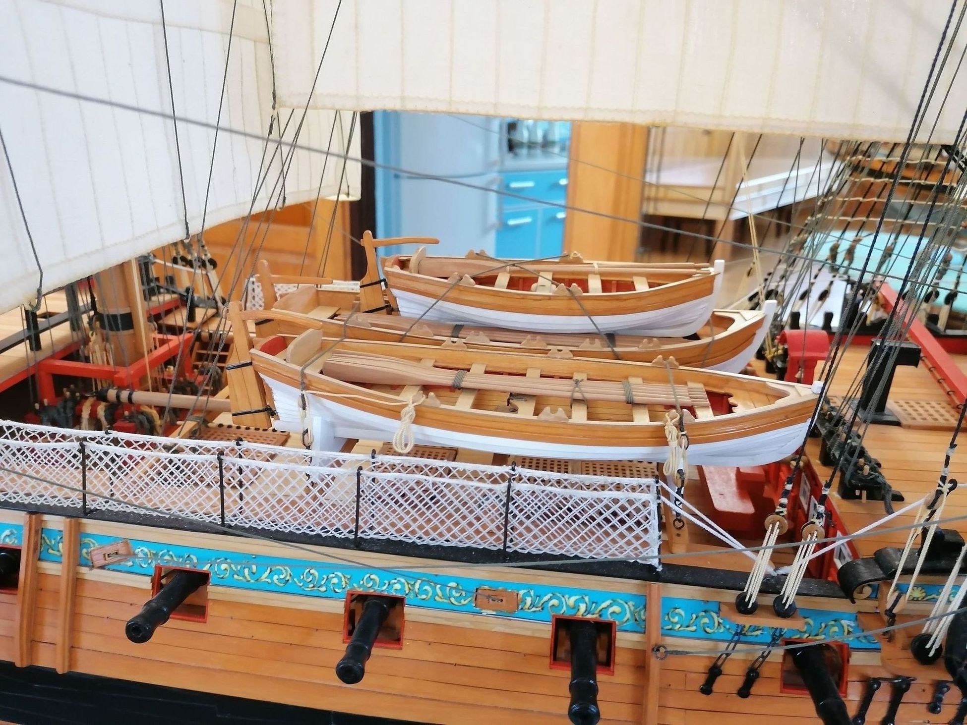 W sumie na moim modelu założyłem prawie 900 mb różnych linek. Kiedy to przeliczyłem na skalę 1:1 to okazało się, że na oryginalnym okręcie było prawie 30 km. Lin. Aż trudno w to uwierzyć, że załoga się w tej plątaninie lin nie pogubiła. To taka mała refleksja na koniec.
