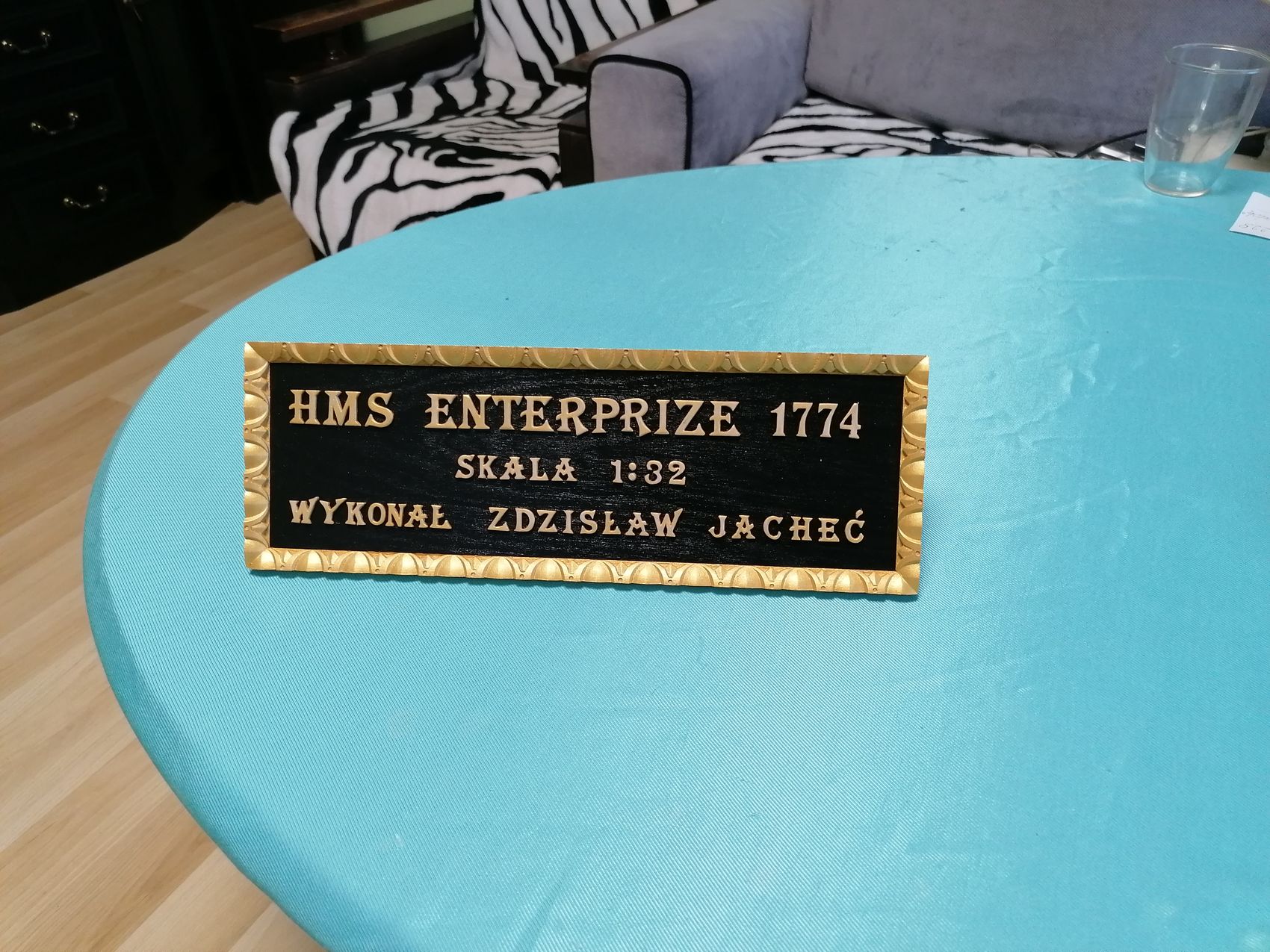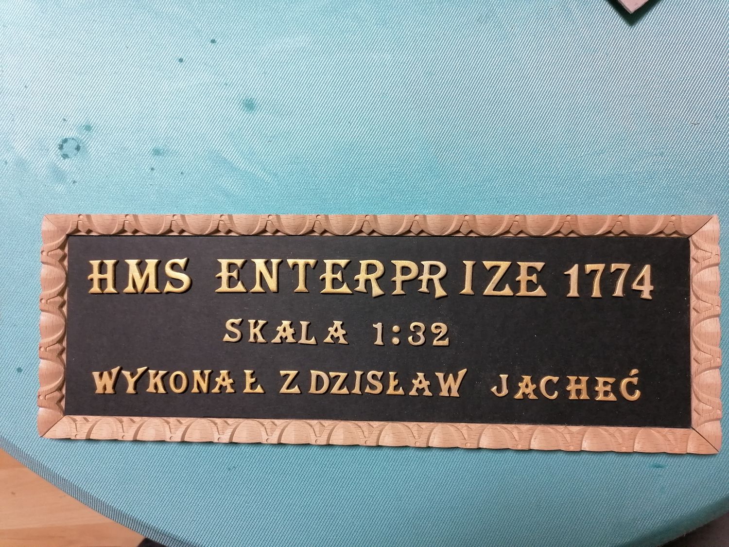 Moja przygoda z Enterprizem powoli zbliża się do finału. Zrobiłem sobie taką tabliczkę „znamionową”. Literki wydrukowałem na drukarce, następnie nakleiłem na 2 mm sklejkę.