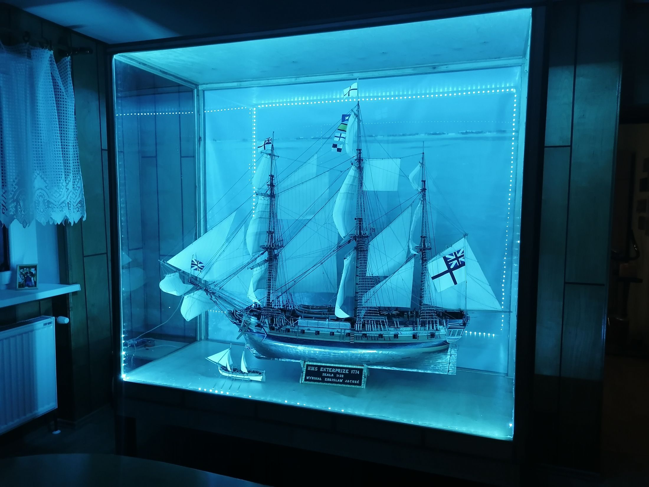Model zajmuje sporo miejsca w holu, postanowiłem więc wykorzystać gablotę jako swego rodzaju "lampkę nocną". Zamontowałem więc w gablocie kolorowe ledy i w zależności od nastroju zmieniam kolor światła.