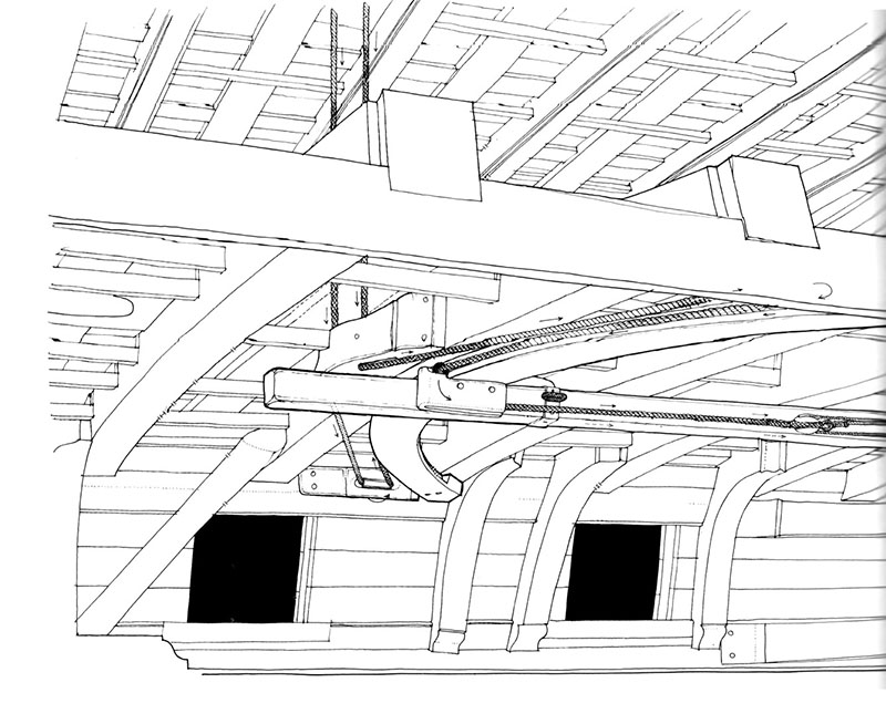 Pod pokładem jest rumpel, połączony linami z kołem sterowym na pokładzie. Masz 6 ilustracji, myślę, że załapiesz na ich podstawie, jak toto jest rozwiązane