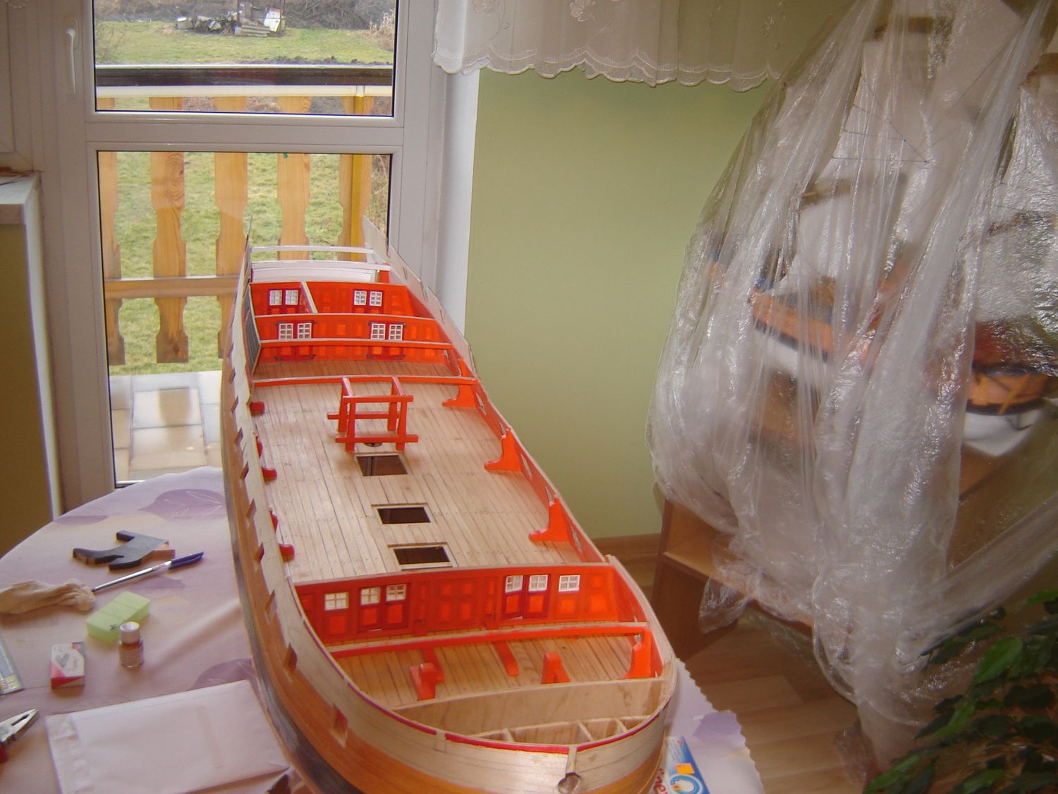 Grypa rozłożyła mnie dokładnie. Pomimo tego próbowałem dzisiaj "pogrzebać" troszkę przy modelu. Zlikwidowałem polskie barwy narodowe na ściankach działowych - zamalowałem białe kasetony. Ramki okienne pozostawiłem białe. Bałem się że je za mocno "zapaćkam" i będę je musiał wykonać od nowa, a na to nie mam ochoty. Zresztą wszystko to i tak zostanie zakryte pokładem. Chciałbym jeszcze jakoś zakonserwować poszycie miedziane i nie wiem czy zamalować je caponem czy akrylowym lakierem bezbarwnym, a może jest jakiś inny sposób zabezpieczenia przed śniedzią?